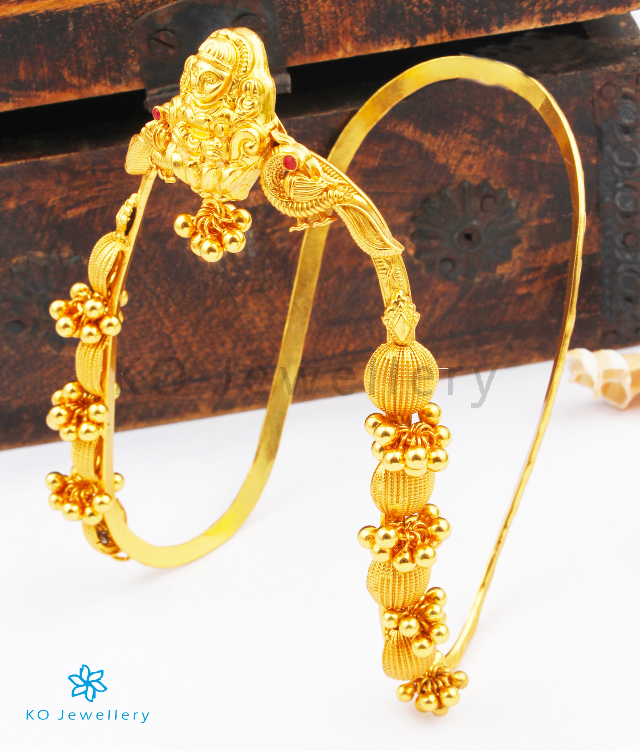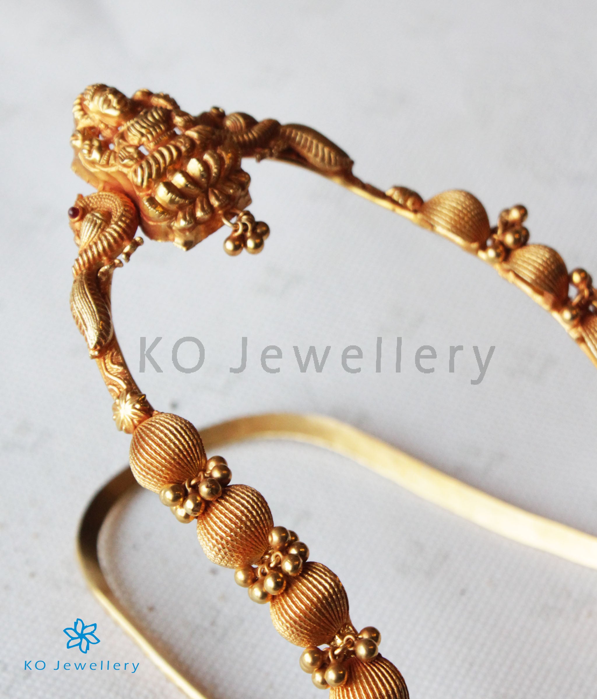 Wear a heirloom piece of temple jewellery fit for a bride! This is a traditional Lakshmi Vanki with `nakkasi' or `nakshi' work (a form of gilt and repousse technique unique to south Indian temple jewellery).The shape of the Vanki is a V which ensures that it can be adjusted to any arm size.
