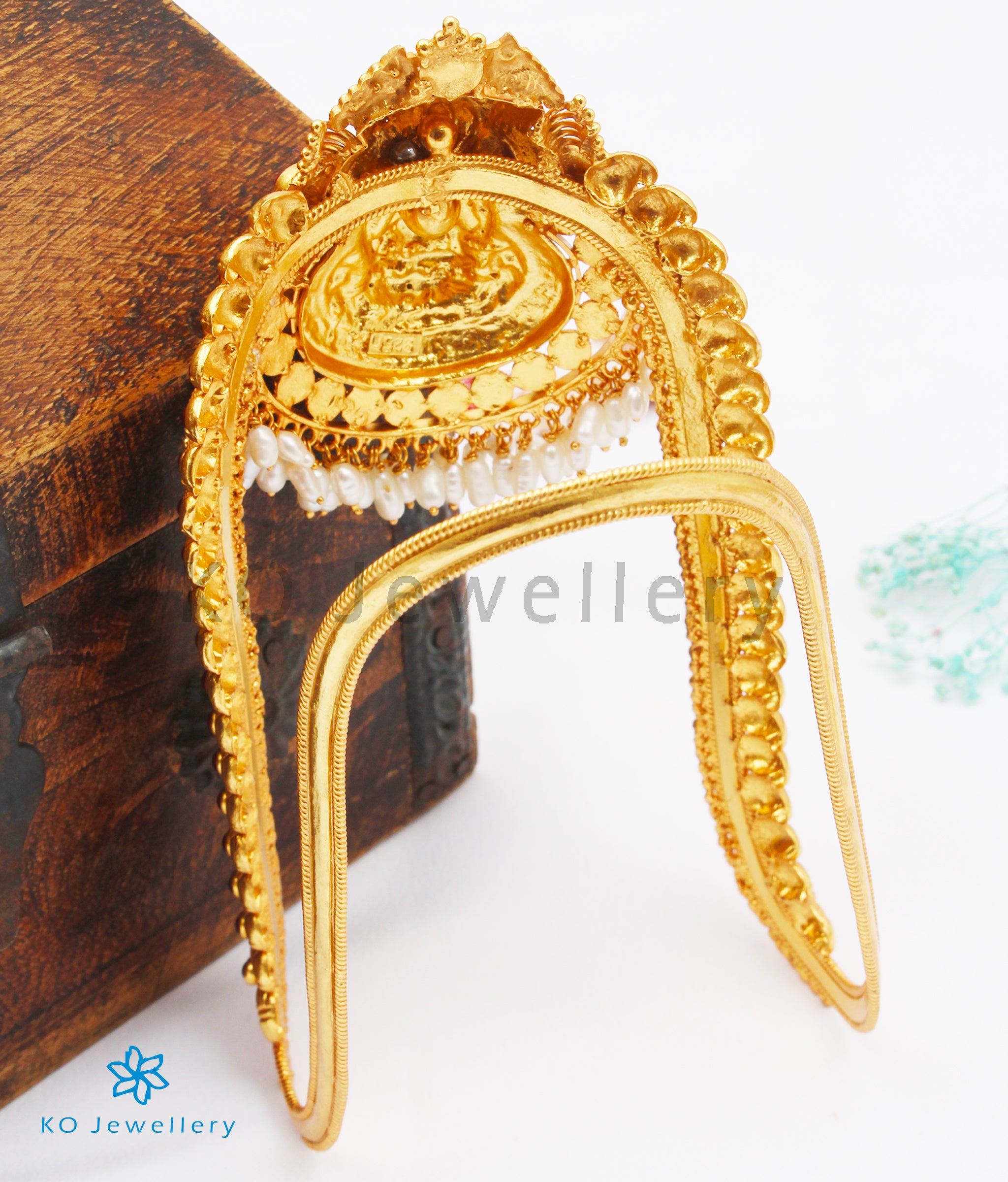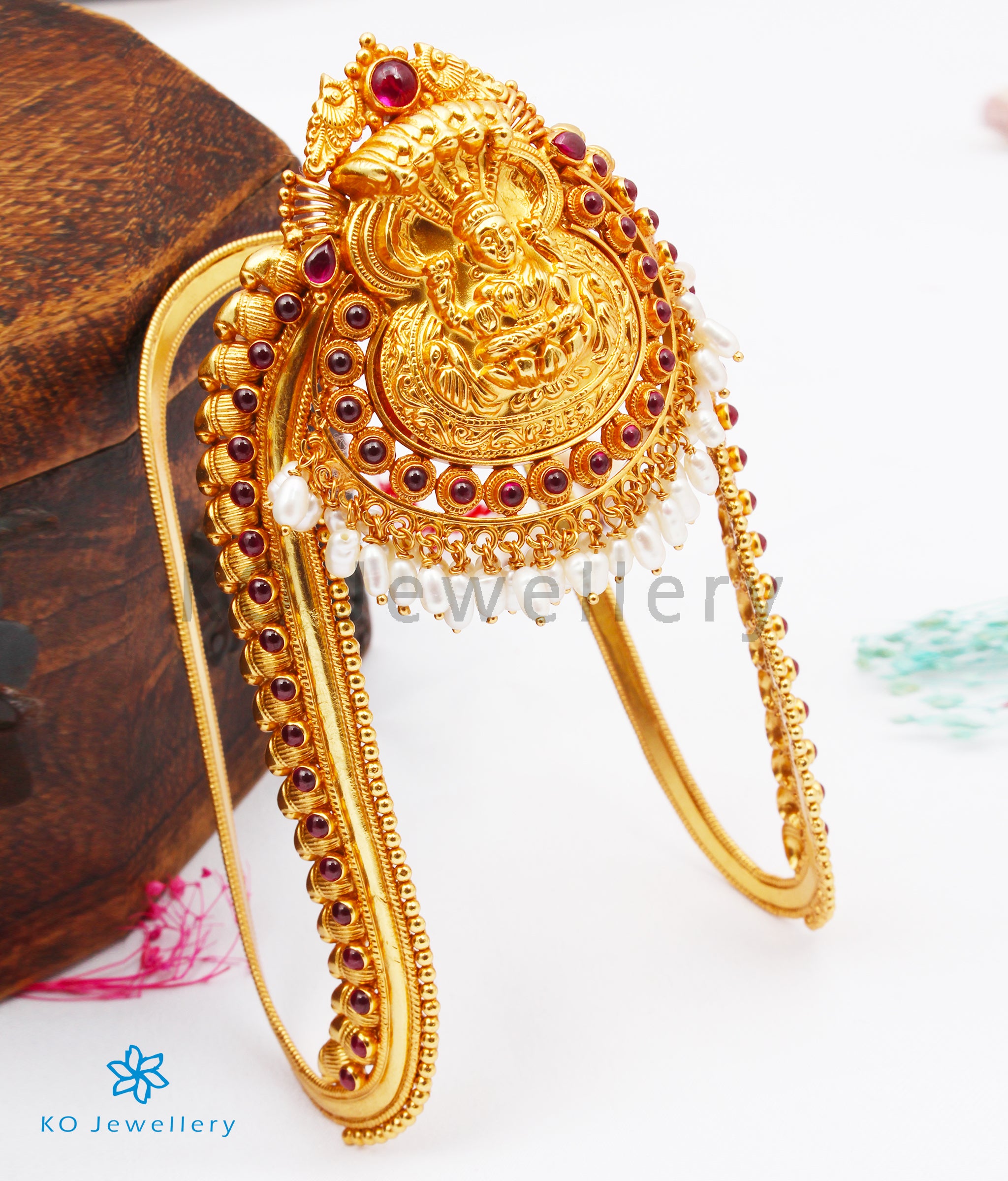 Wear a heirloom piece of temple jewellery fit for a bride! This is a traditional Lakshmi Vanki with `nakkasi' or `nakshi' work (a form of gilt and repousse technique unique to south Indian temple jewellery).The shape of the Vanki is a V which ensures that it can be adjusted to any arm size.