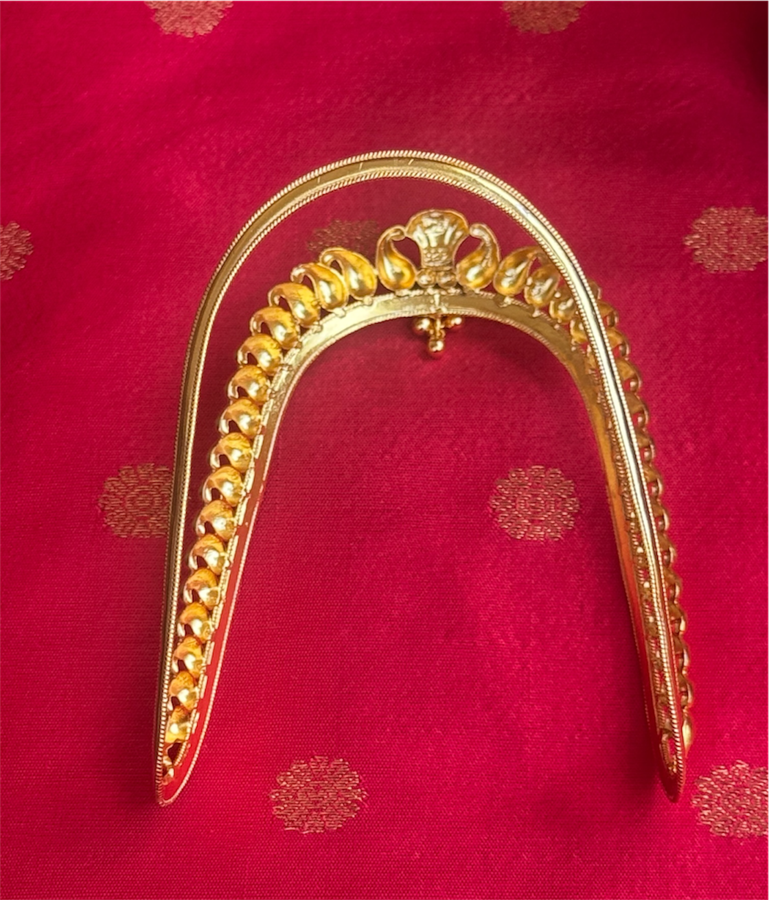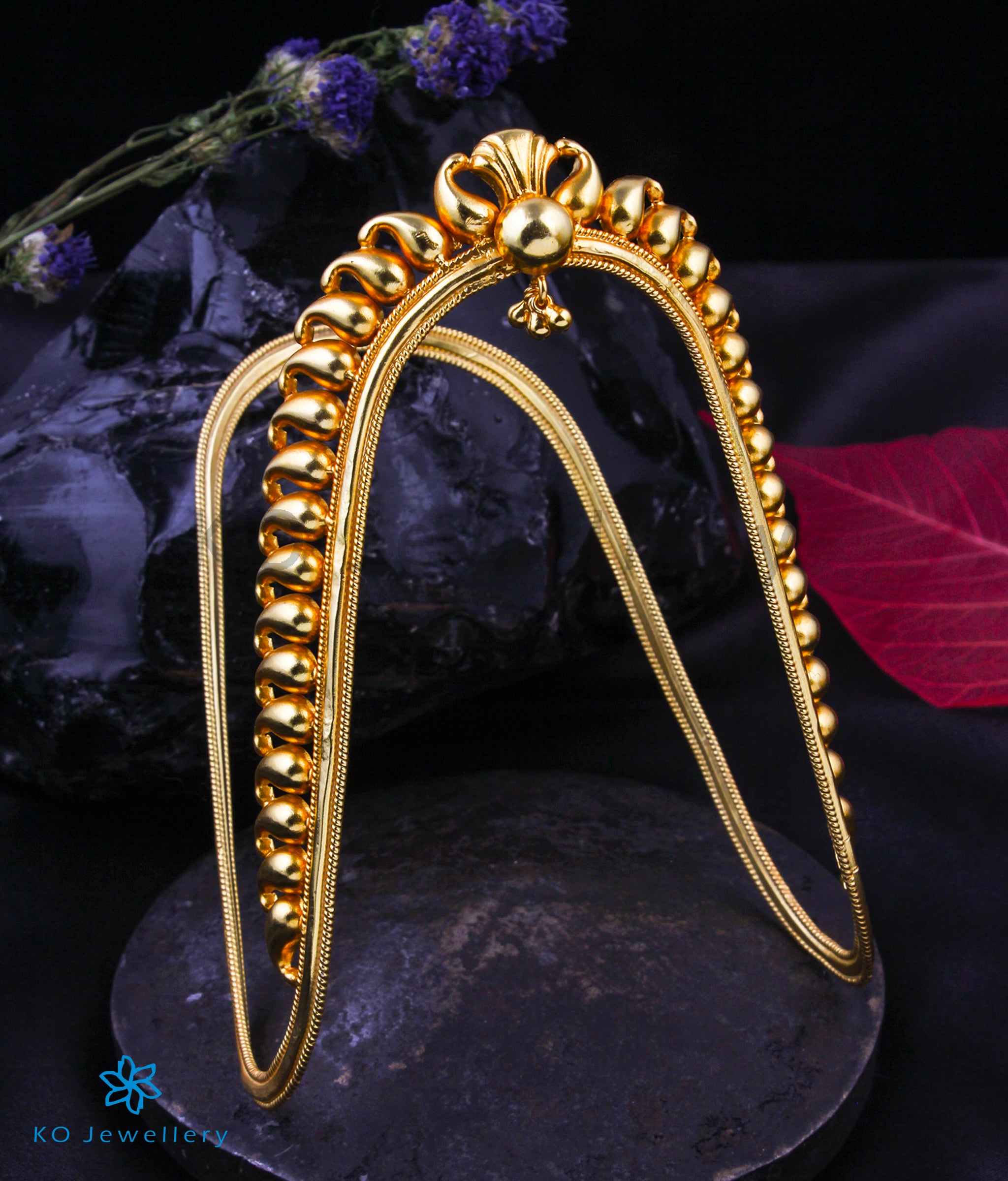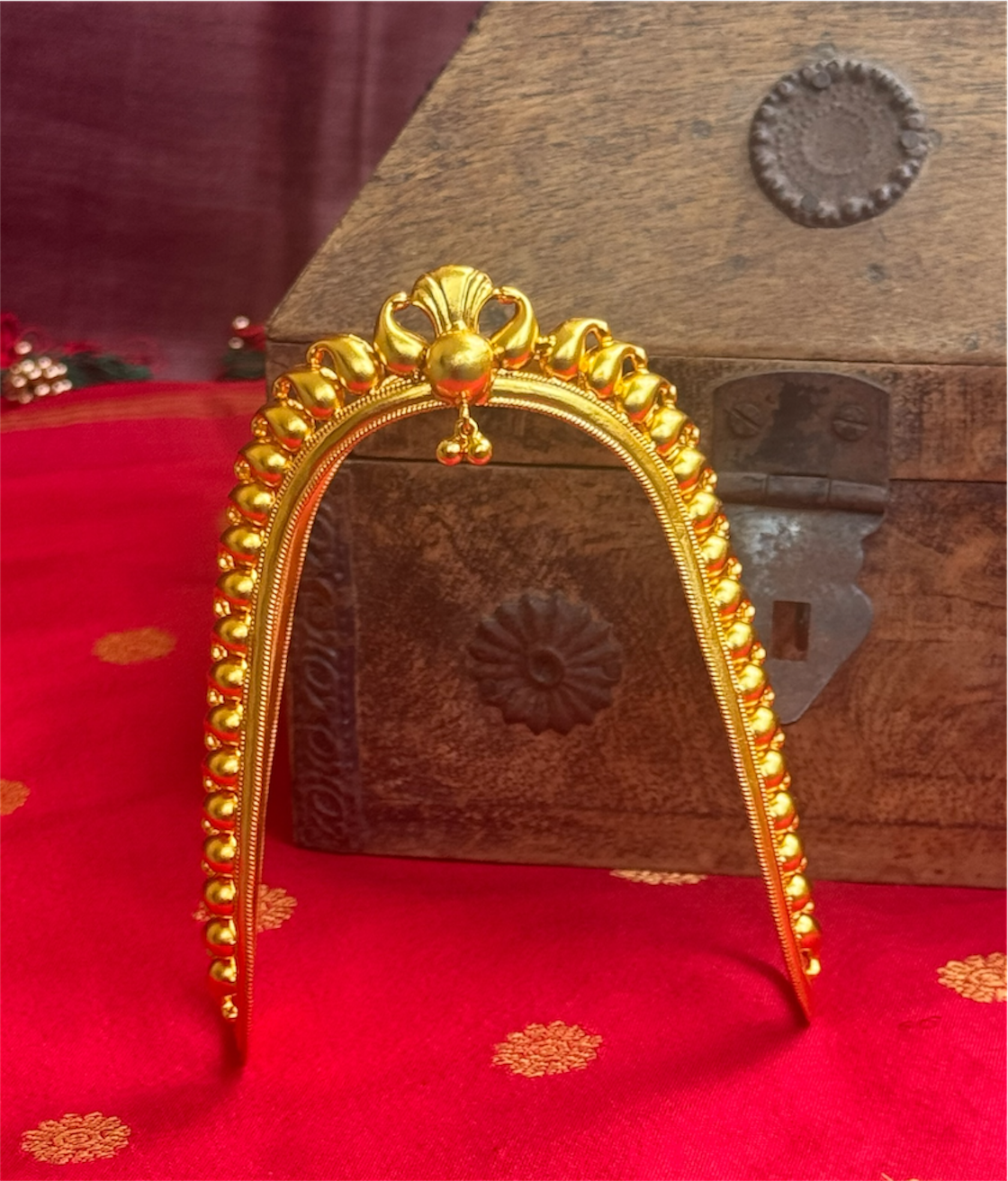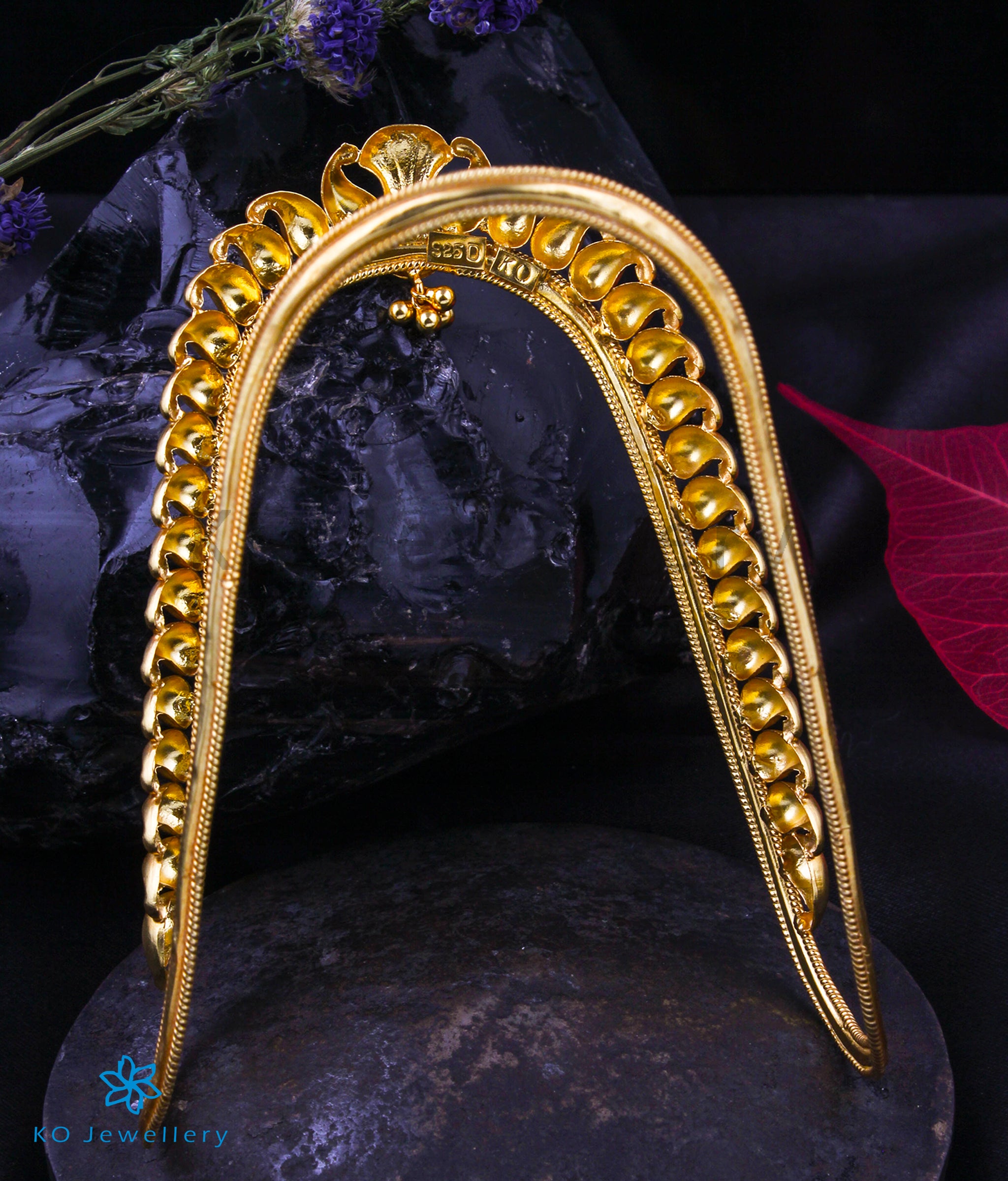 Our latest creation honors this ancient South Indian tradition. Handcrafted in 92.5 Sterling Silver and dipped in 24k gold for that authentic antique glow, it features the "Manga" (paisley) motif—a timeless emblem of elegance.