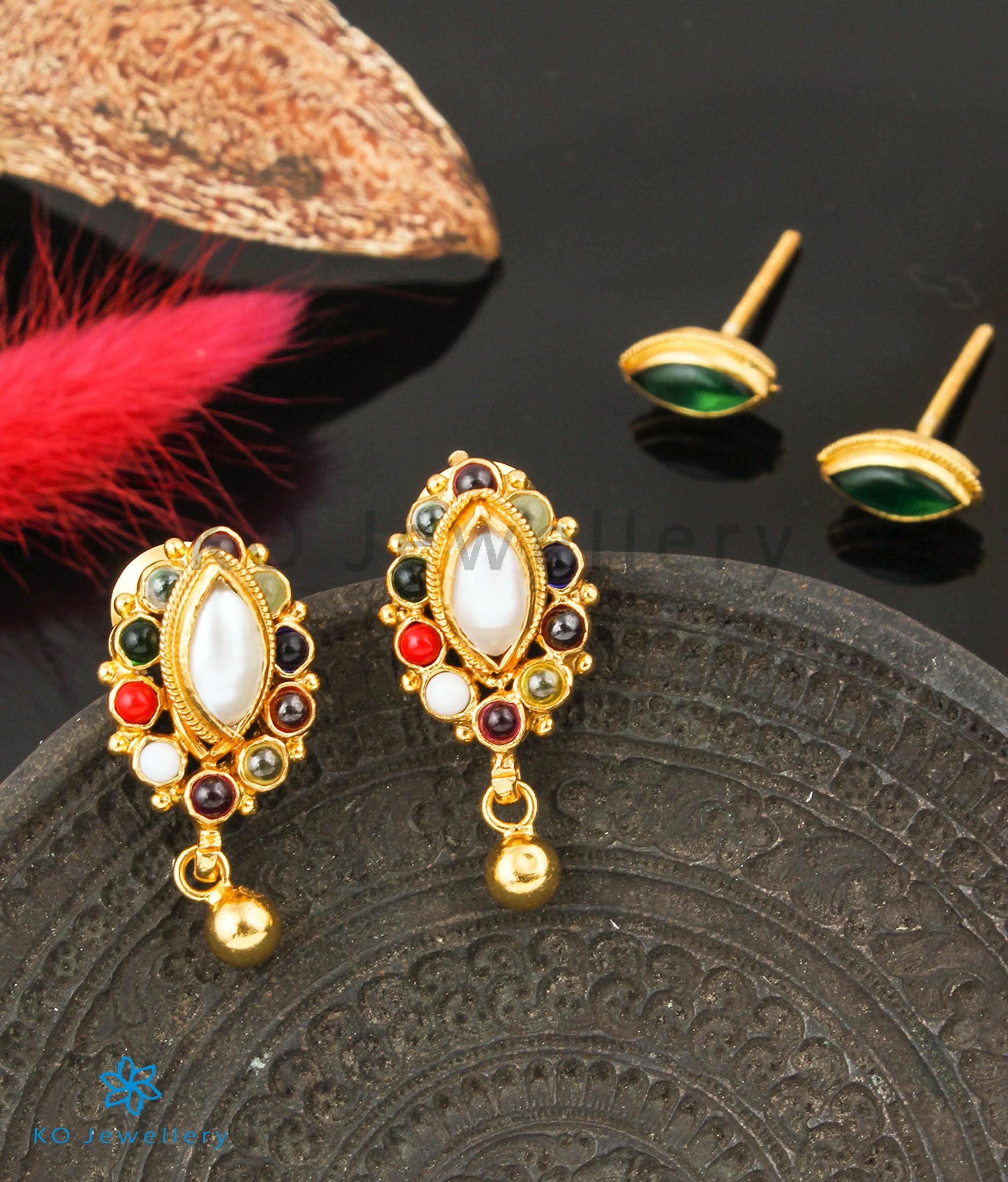 Navaratna gemstones - the quintessential protection stones that bring luck and welcome the auspicious. With this stunning ear-studs experience the convenience of having both navratna and green in a single pair of ear-studs. Classic and traditional in design, this is an impeccably handcrafted earrings pair in Sterling Silver (92.5%) which has been gold-dipped.