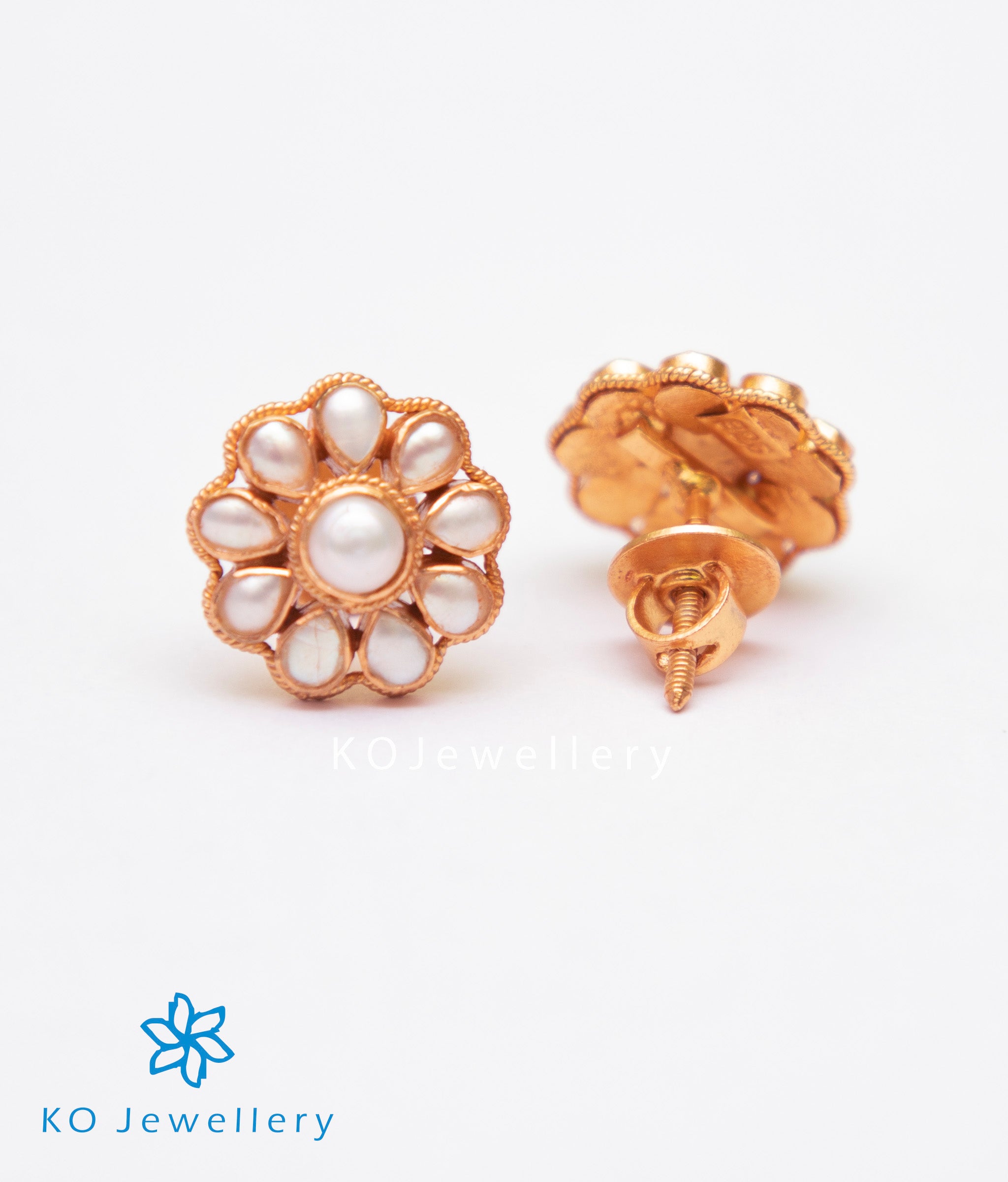 A pretty pair of floral design gold-dipped sterling silver (92.5%) ear-studs handcrafted to perfection and decorated with natural Pearl.This is a classic pair of ear-studs that can match effortlessly with your wardrobe,it comes with bombay-screw.
