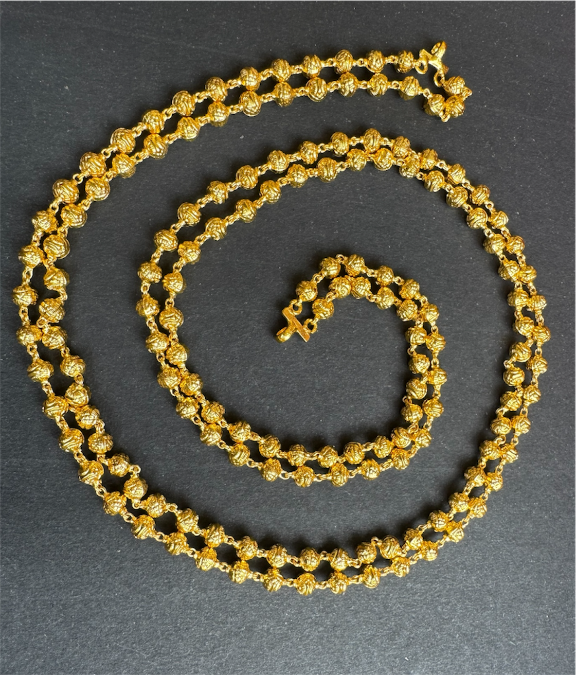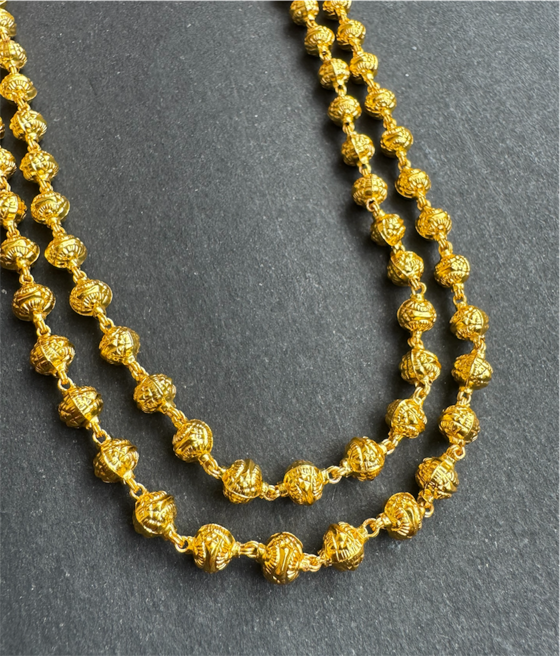 The beads are meticulously handwoven using fine silver wire and finished with a rich 24 karat gold dip, lending the chain a warm, heirloom-like glow reminiscent of classic temple jewellery. Graceful yet understated, the Mohanmala is designed to be worn on its own to effortlessly elevate any ensemble, or paired with pendants from our collection to create a more ornate and statement-worthy look.
