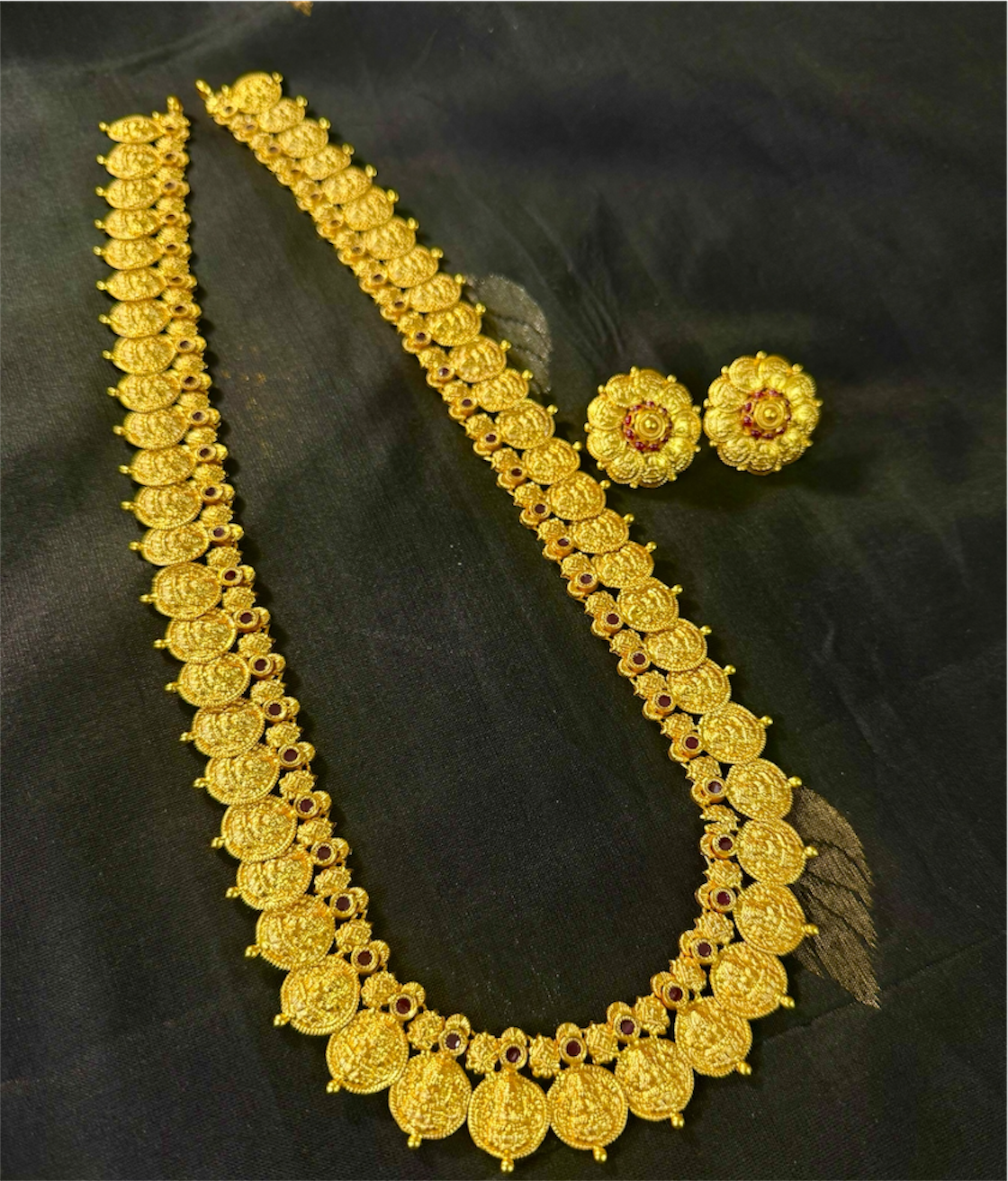 Crafted in pure 92.5 Sterling Silver and gold-dipped in 24k gold through a special process to achieve an authentic antique finish due to which the necklace exudes regal elegance. Designed as a long necklace, it offers versatile styling and can also be worn gracefully as a traditional waist-belt (oddiyanam style).