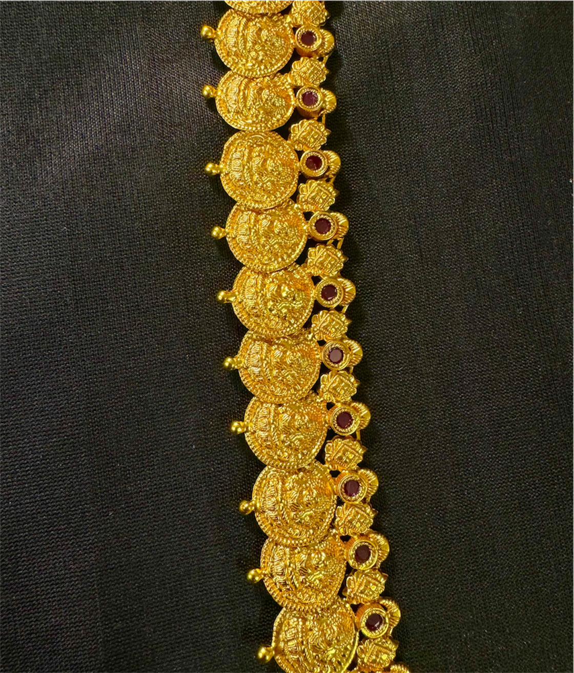 An iconic design, this traditional `Kasu malai' is a rare masterpiece of jewellery that will be prized and passed on for generations. The coins carry the image of godess Laxmi (seated on a lotus) which is topped by a beautiful parrot motif that is studded with a single row of `kempu stones'. The skill and craftsmanship exhibited in this piece are truly amazing.This is a long necklace and can be used as a waist-belt also .