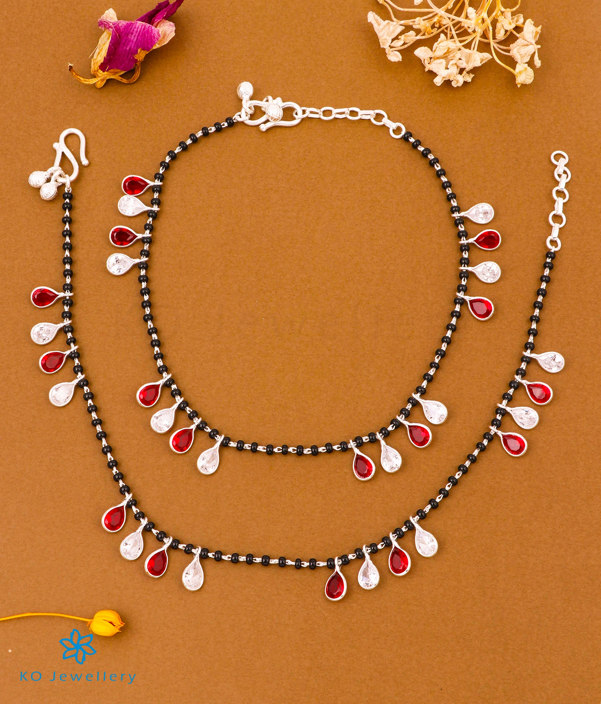 The Vajra Silver Black Beads Nazariya Anklets (White/Red)