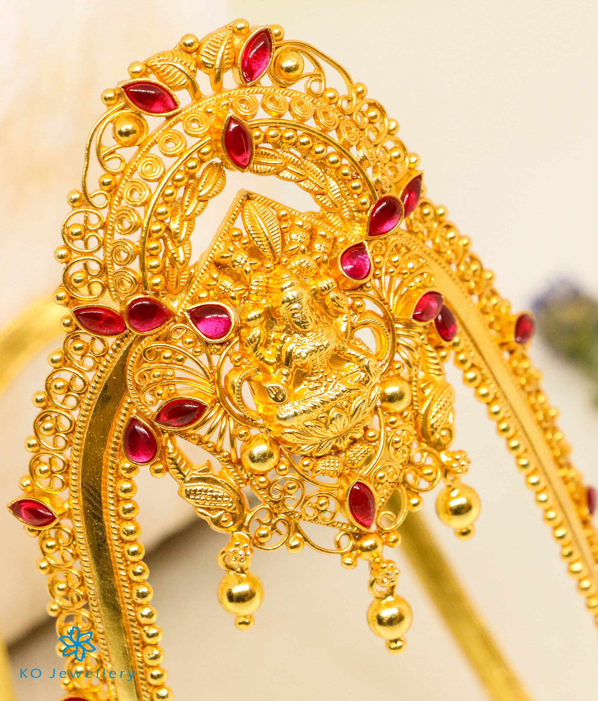 This masterpiece features intricate nakshi (nakkasi) work—a rare, labor-intensive gilt and repousse technique unique to South Indian temple jewellery. The armband’s classic V-shape not only lends it a regal aesthetic but also ensures a flexible, adjustable fit for any arm size.