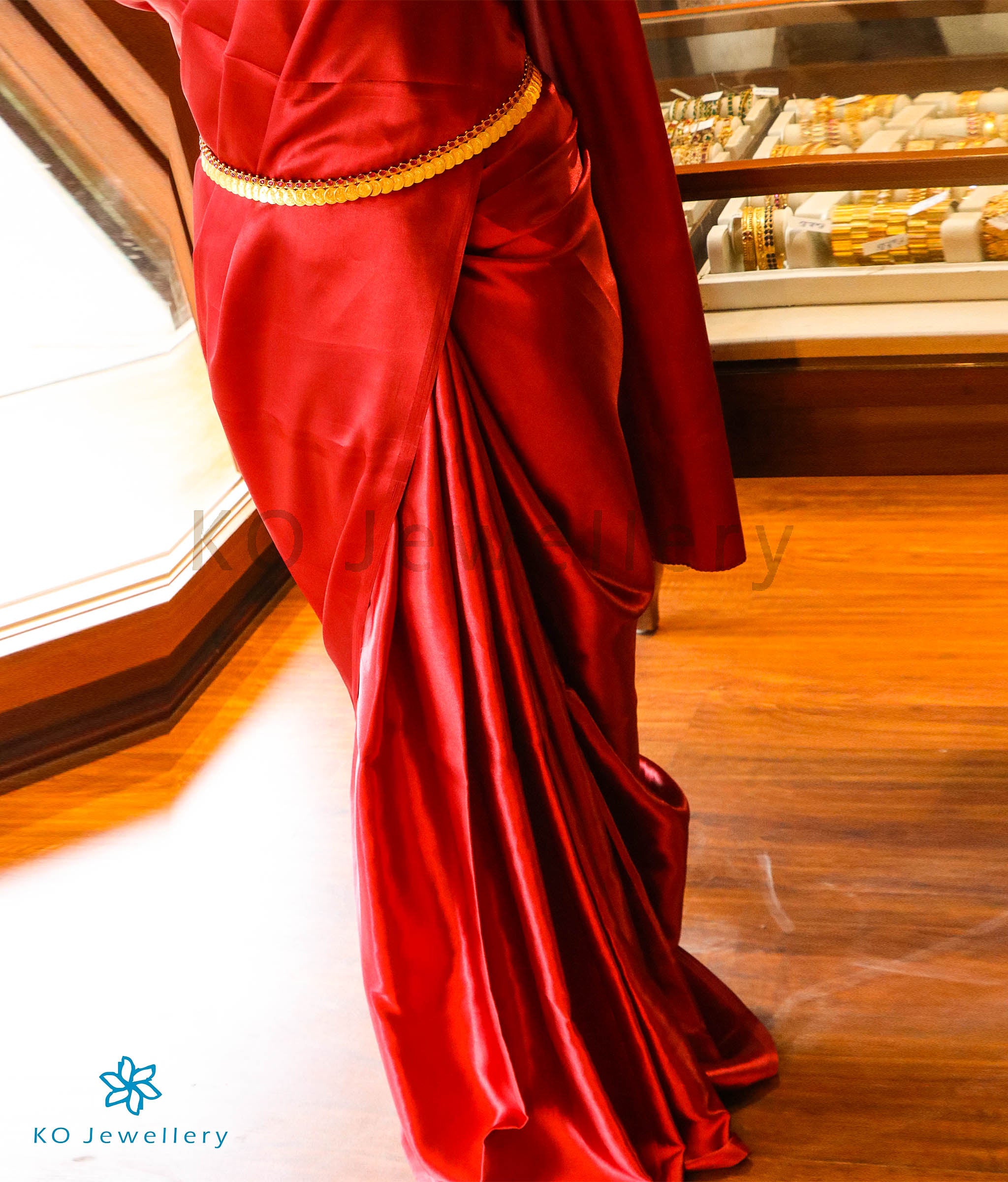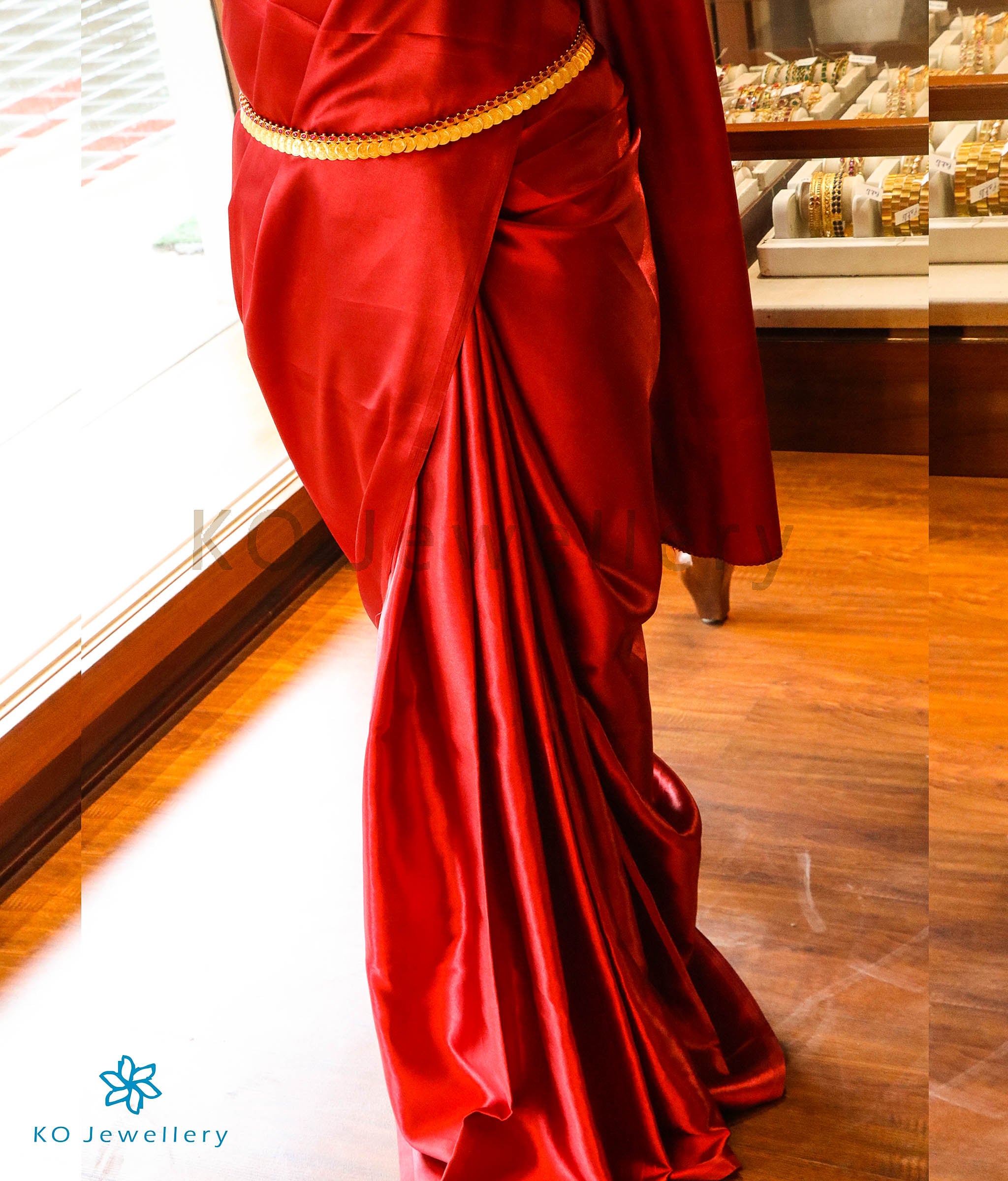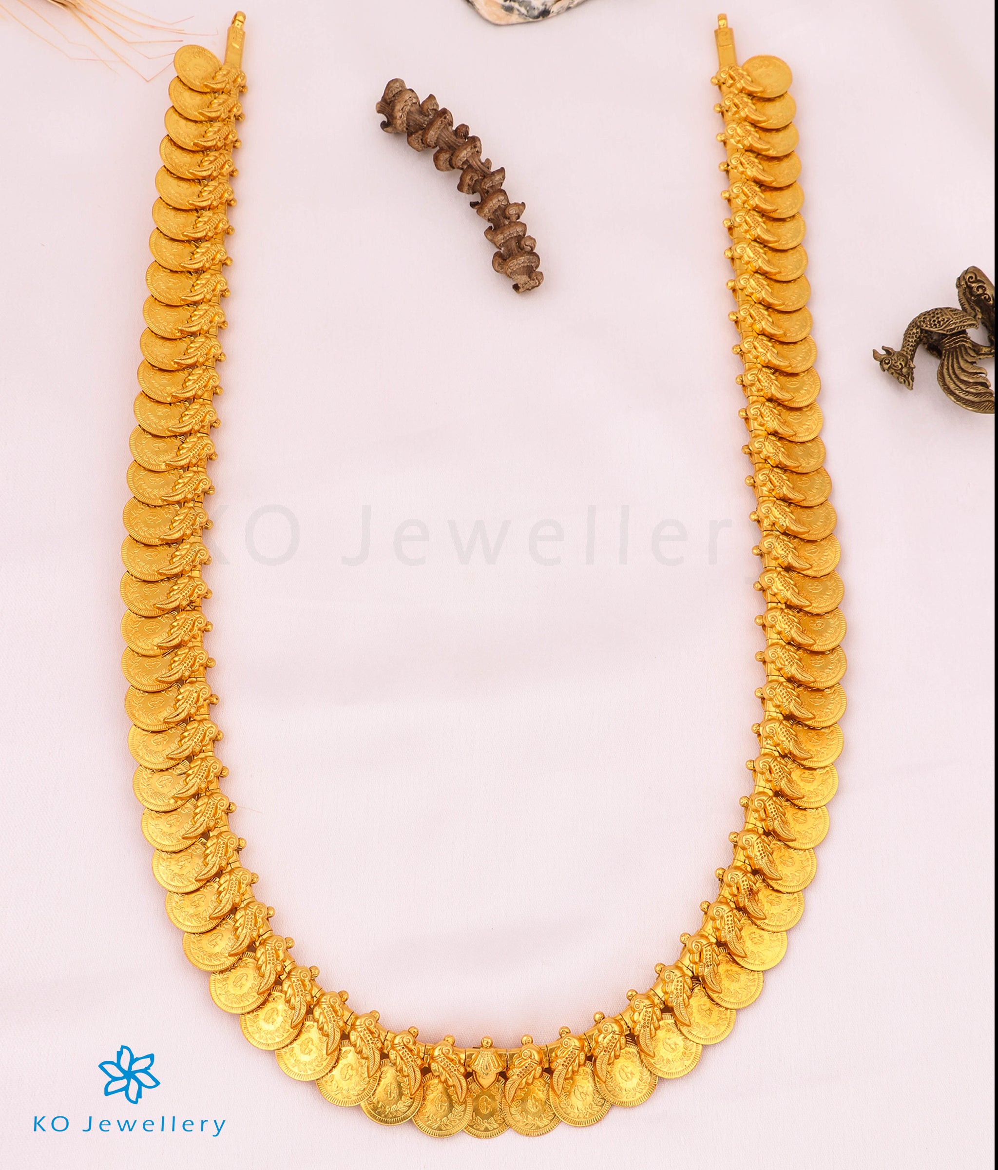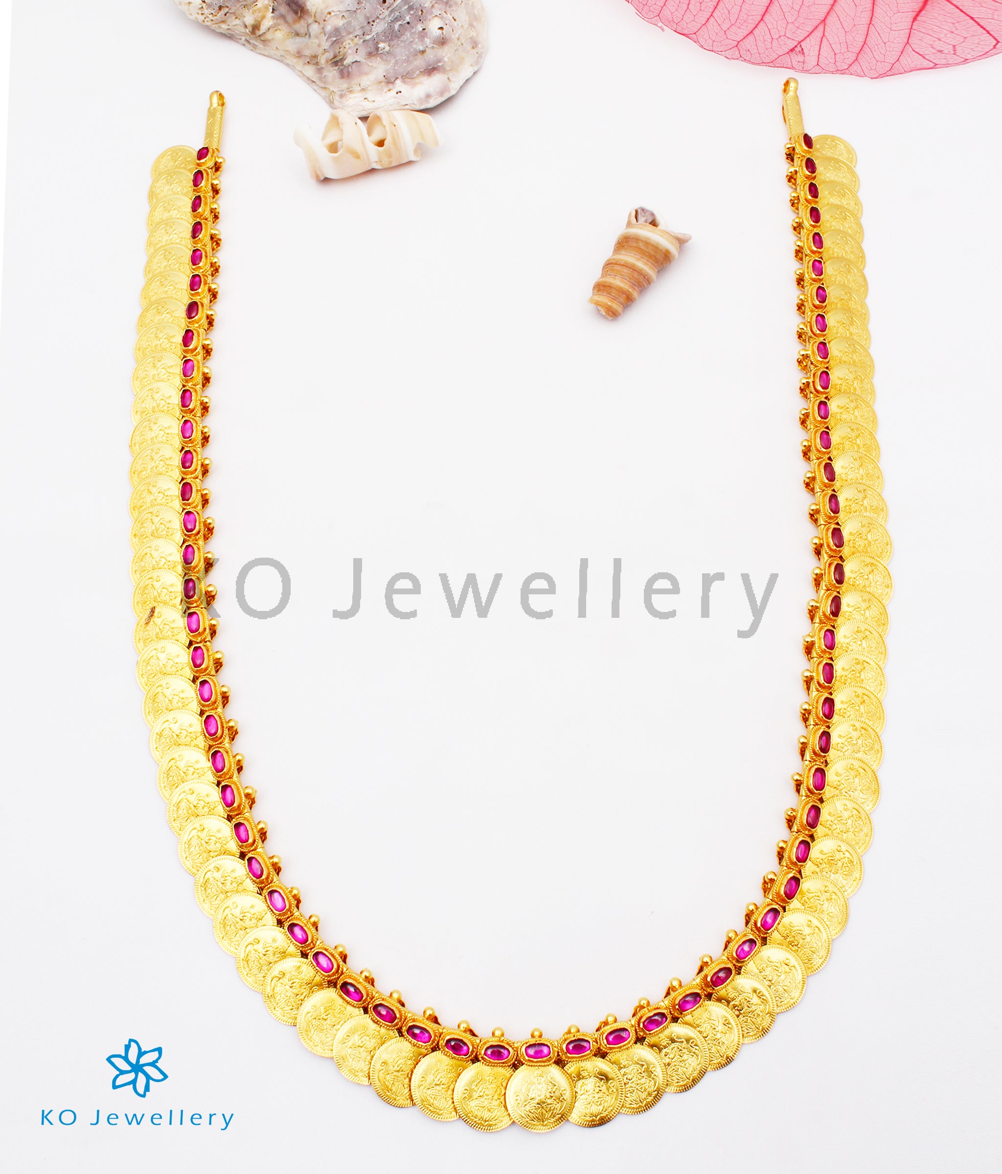 An iconic design, this traditional `Kasu malai' is a rare masterpiece of jewellery that will be prized and passed on for generations. This is a reversible necklace which has a different design on both sides. On one side the coins carry the image of godess Laxmi (seated on a lotus) and display a single row of `kempu stones' while on the other side we can see a beautiful parrot motif .The skill and craftsmanship exhibited in this piece are truly amazing.This is a long necklace and can be used as a waist-belt also .