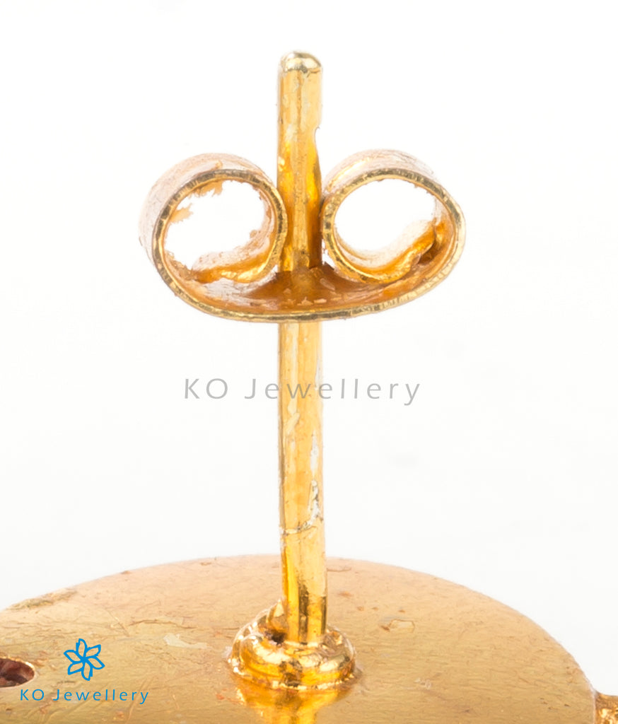 A striking pair of earrings set with kempu stone and the Lakshmi motif this is a gorgeous piece of jewellery. The sheer intricacies of pattern and flawless craftsmanship make this piece special. Handcrafted in the finest traditions of ancient south Indian temple jewellery in Sterling (92.5) Silver and gold-dipped in a special process to give it an antique look.