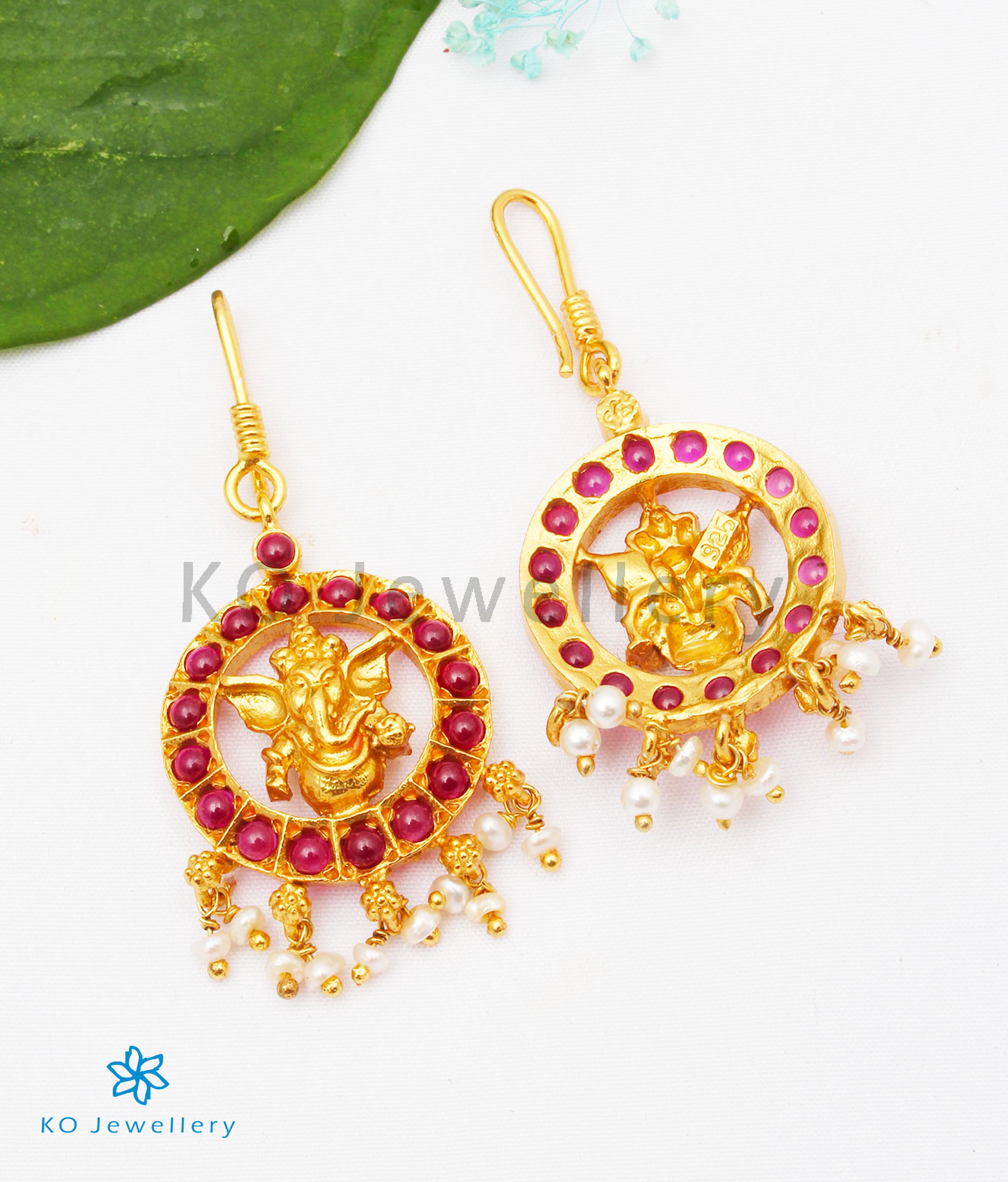 A pretty pair of dainty handcrafted earrings , in Sterling Silver (92.5%) studded with kempu stones with a Ganesha figure in the center. If you like designs that are unique, this piece is for you.
