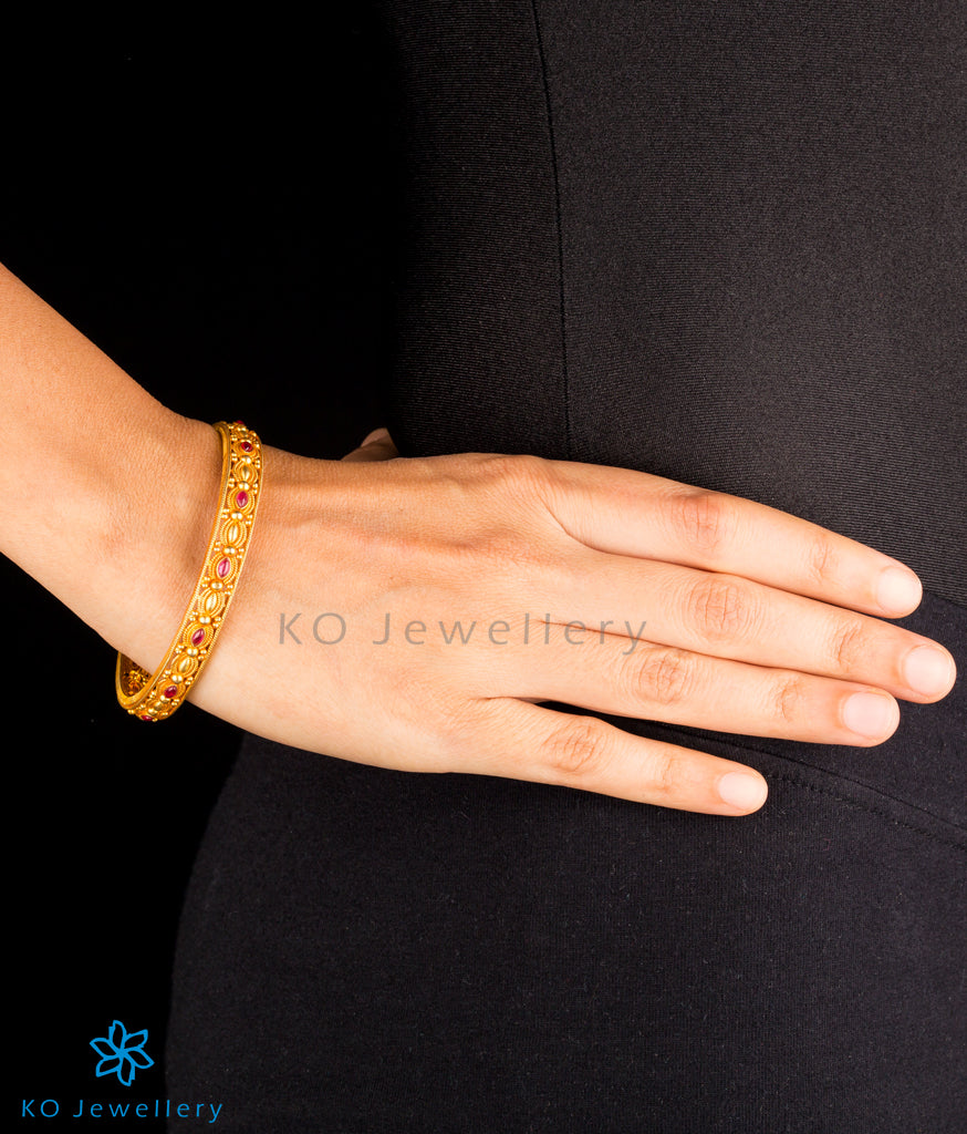 Let your hands soak all the attention when you wear this gorgeous bracelet with red stones.Beautiful oval shaped kempu stones are framed in Sterling Silver (92.5%) to create this exclusive piece. This seamlessly handcrafted bangle can be bought as a single piece or in a pair. The price listed is for a single bangle.