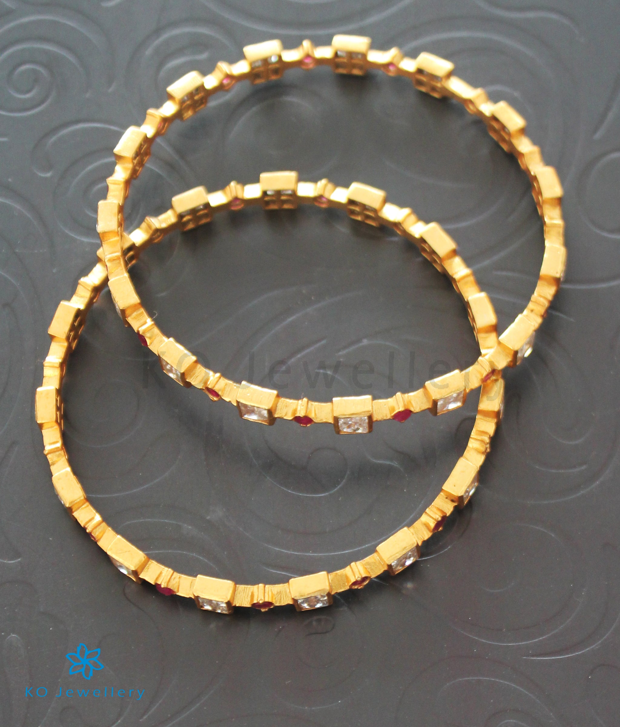 Here’s a lovely, delicate bangle that is extremely gorgeoSus and sophisticated with a unique design. Handcrafted from Sterling Silver (92.5%) and decorated with kempu stones and white zircon, wear as a pair to instantly brighten up your ethnic attire. The price listed is for one bangle.