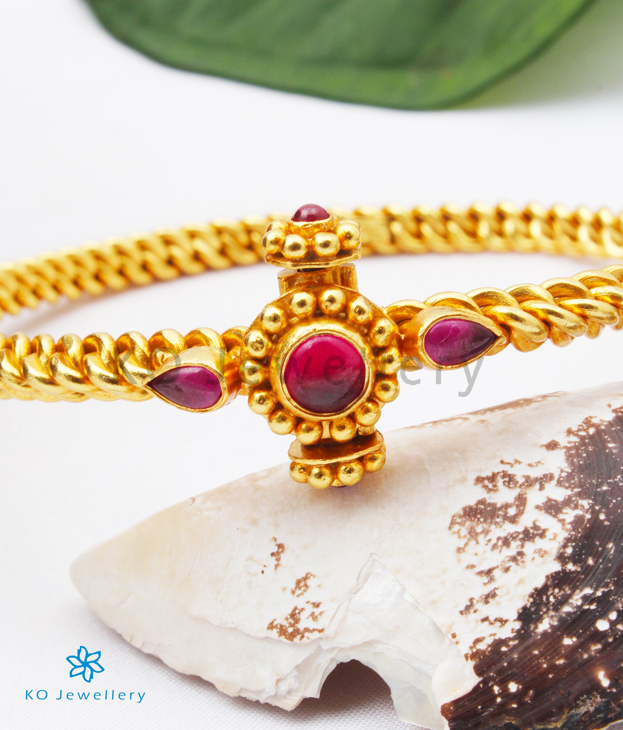 This is an antique Sterling Silver (92.5%) traditional-design, twisted bracelet from South India studded with `kemp' (red) stones. Traditionally called a `Golusu' bracelet it is made by twisting together solid silver wire with great skill and finesse. Handcrafted using techniques used in ancient South Indian antique gold temple jewellery the entire piece is crafted in pure silver and dipped in 24 karat gold. It is an openable bracelet with a screw.