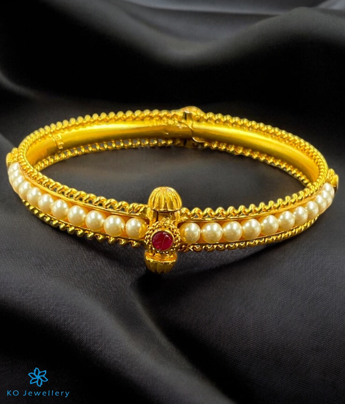 We have reinterpreted traditional Pearl designs to bring you these stunning kadas. Crafted in 92.5 Sterling Silver, this exquisite openable kada showcases intricate detailing inspired by traditional South Indian antique jewelry. Adorned with lustrous pearls and tiny kempu stones, the bracelet exudes timeless elegance. Handcrafted with precision, it is gold-dipped using a special process to achieve an antique finish. Featuring a screw mechanism, this kada is both versatile and easy to wear, making it a perfect addition to your heritage jewelry collection.