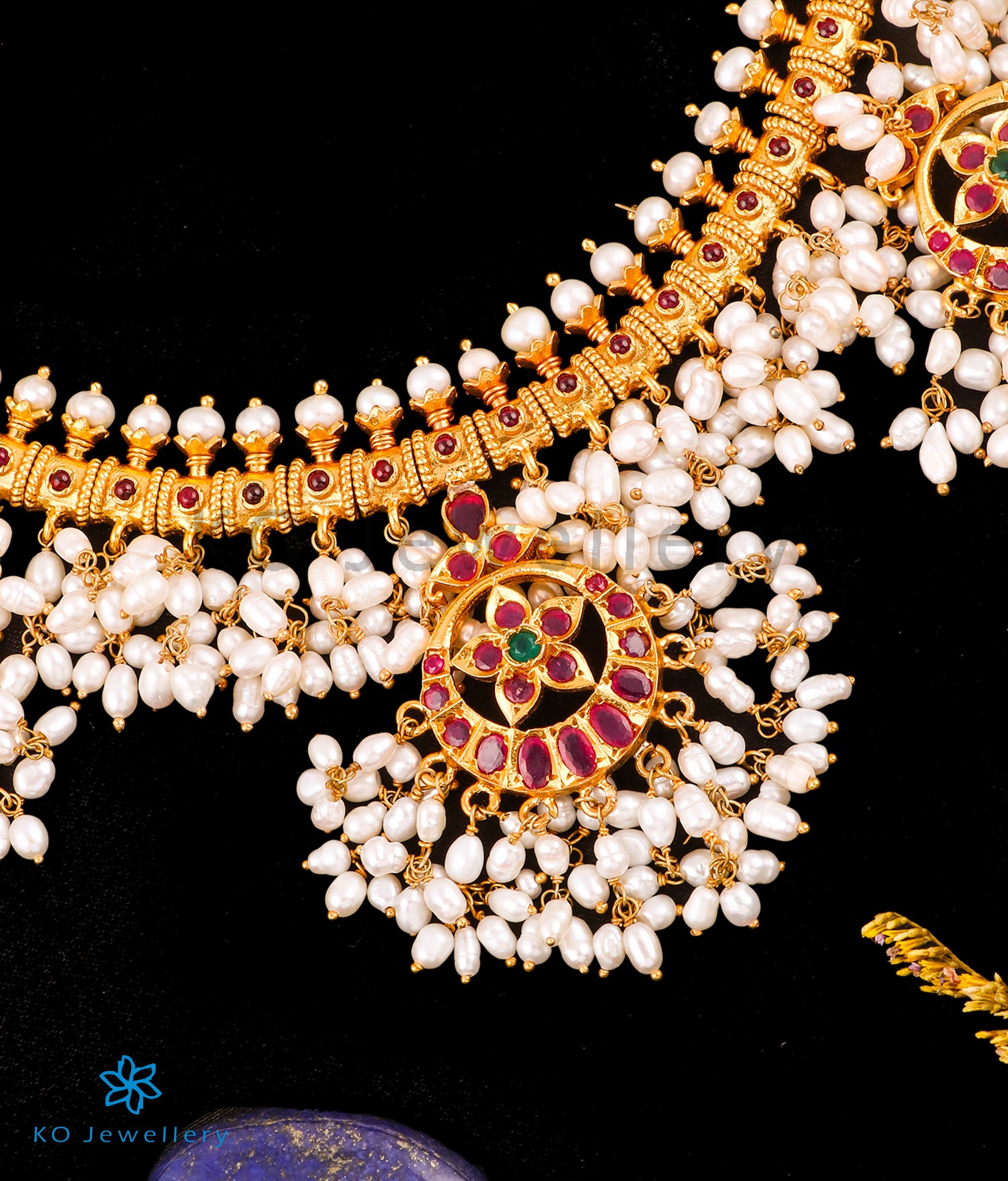 If you want to stun everyone with a bespoke piece of jewellery this is the design for you. This heritage necklace carries five pendants with kempu stones and is decorated with natural Pearl.