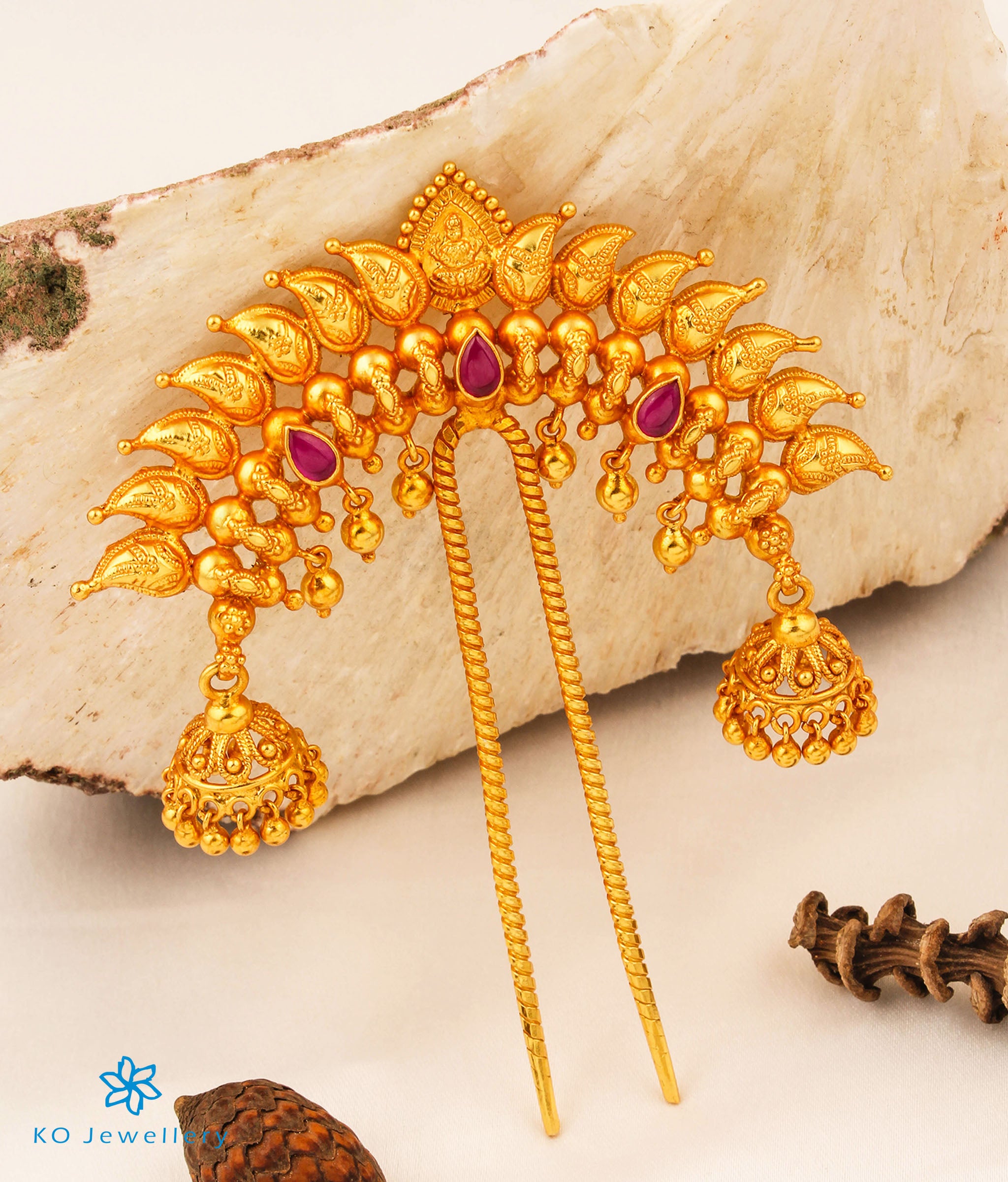 Adorn your hair with a traditional paisley/mango motif, hair-ornament studded with kempu stones. Tiny gold-dipped jhumkas added for decoration give it an added attraction.It is handcrafted in Sterling Silver (92.5%) and gold-dipped to perfection using techniques used in ancient South Indian antique gold temple jewellery.This piece is also available in the antique silver finish on request.