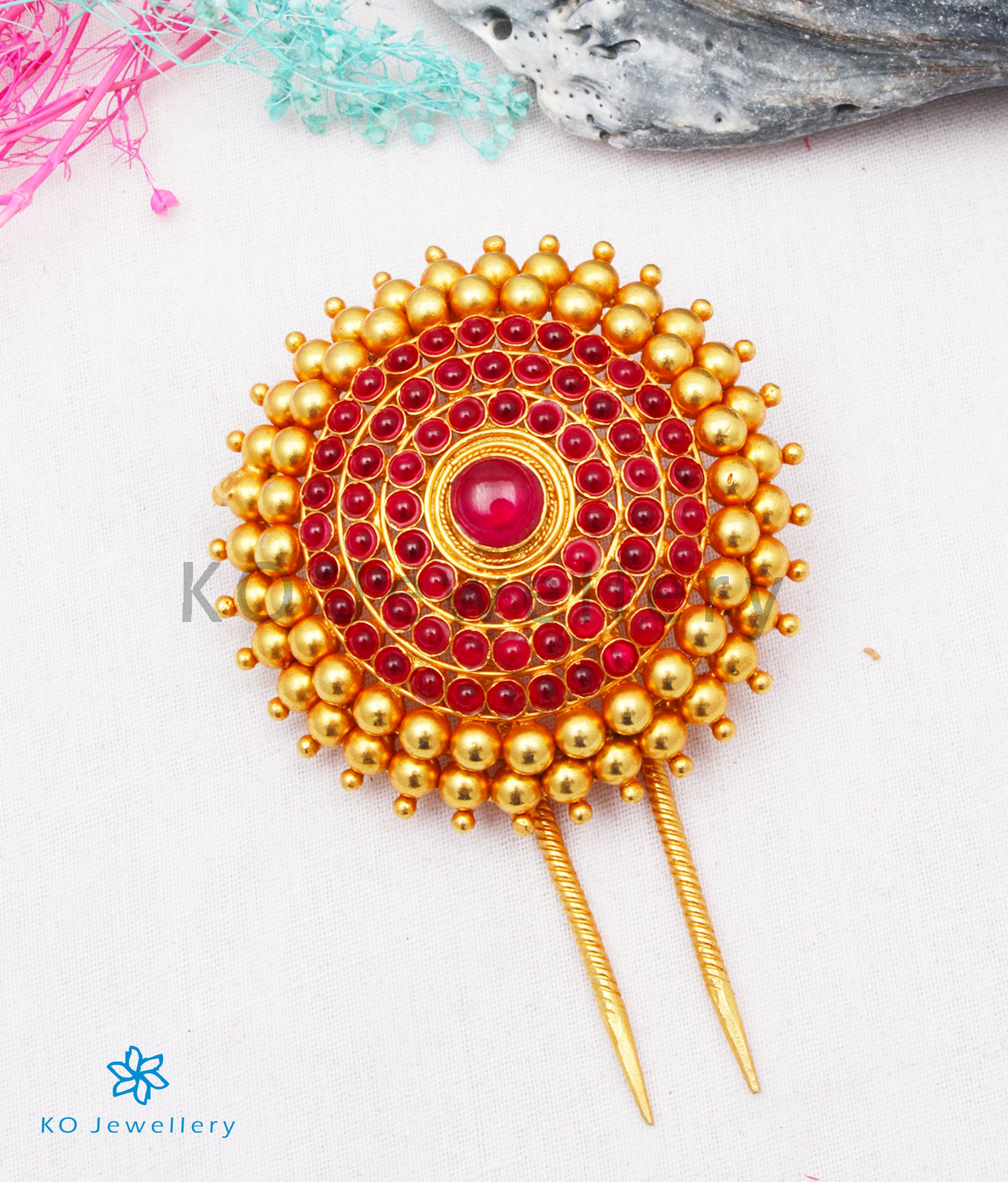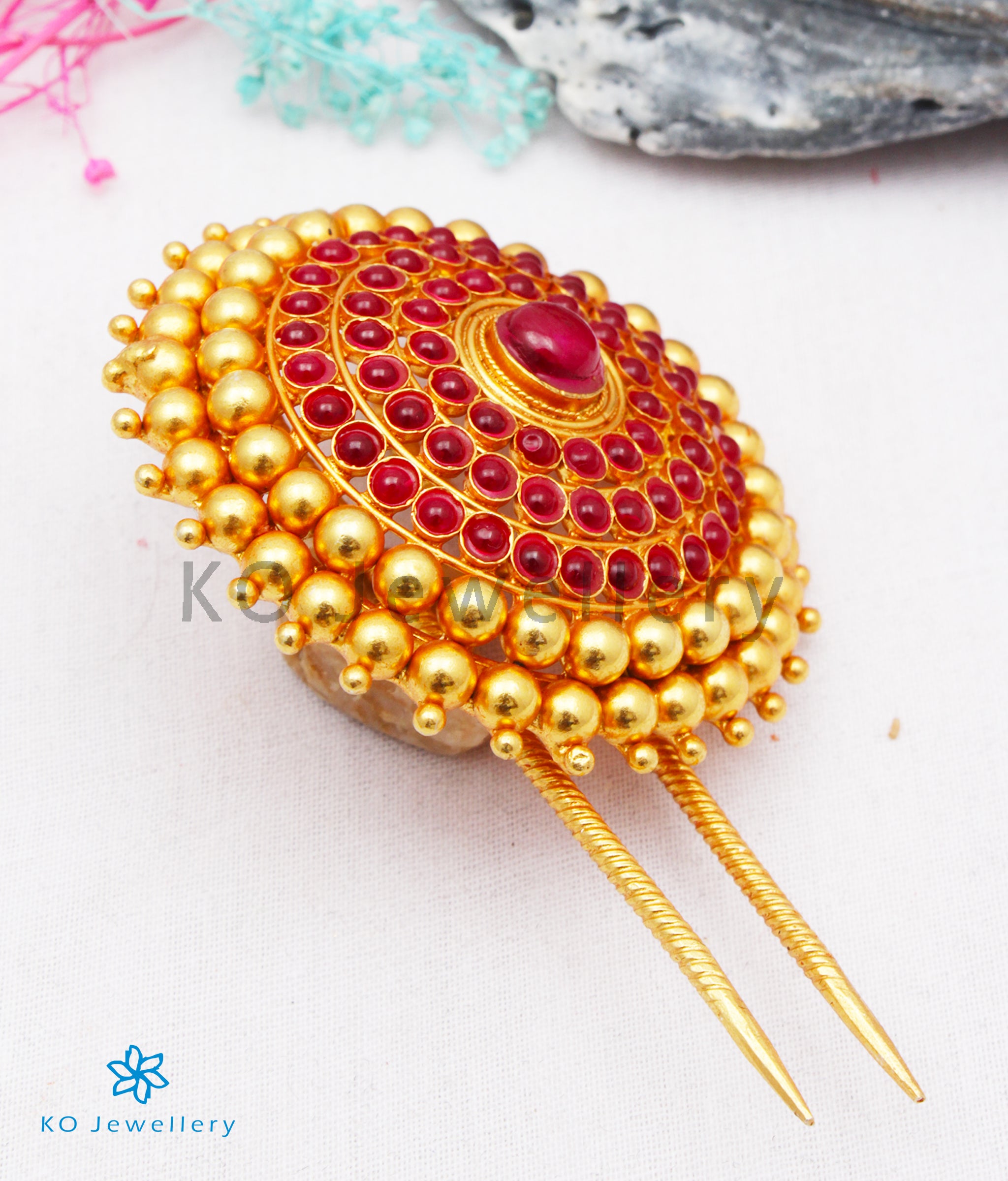 Expertly handcrafted using techniques rooted in ancient South Indian temple jewelry traditions, this piece captures the grandeur of a bygone era. Whether worn with a braid or bun, it adds a regal touch to your look—making it a true heirloom piece.