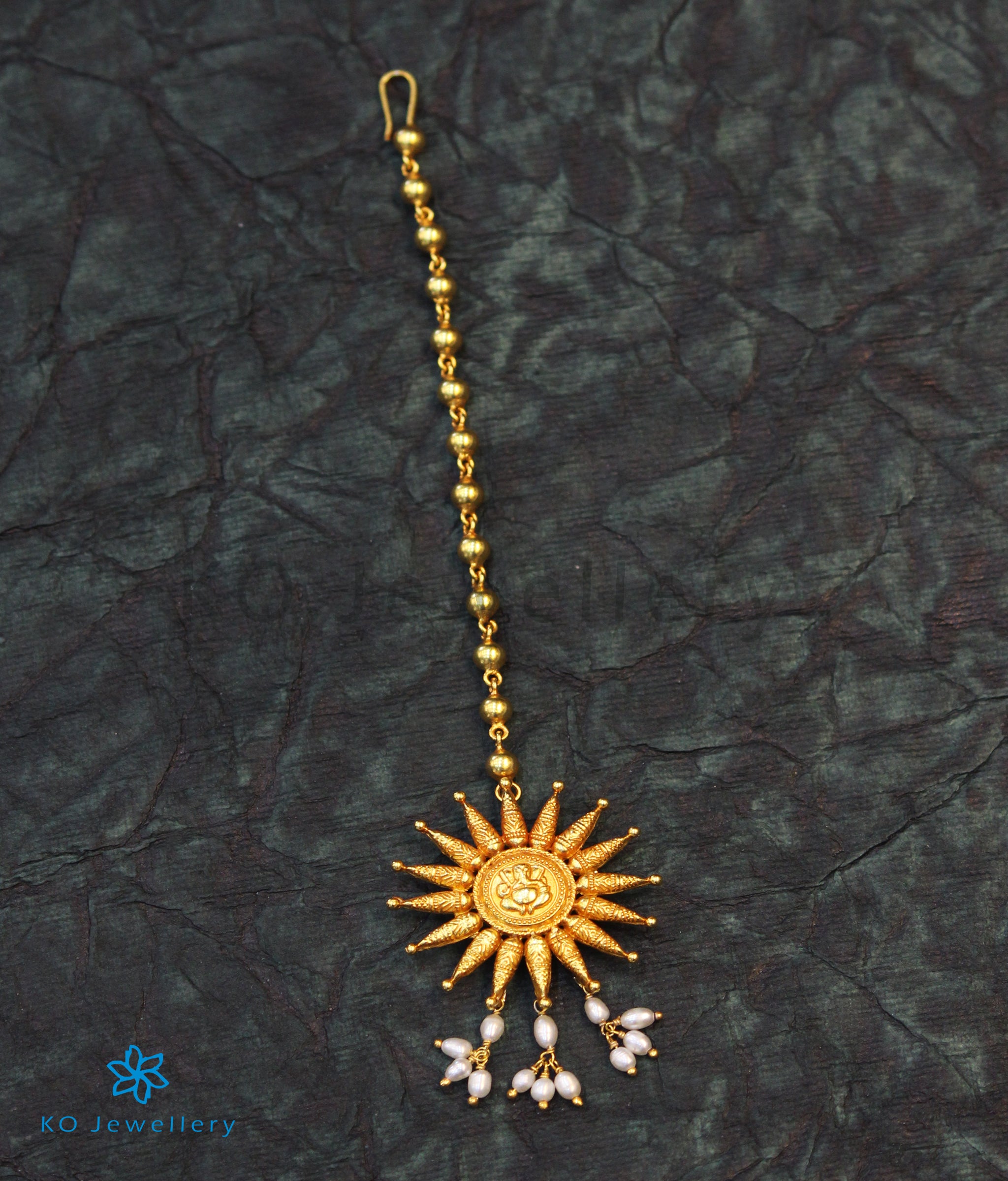 Make a unique fashion statement with this `maang tikka' which has the image of Ganesha in the center.Crafted using techniques used in ancient South Indian antique gold temple jewellery the entire piece is crafted in pure silver and dipped in gold.