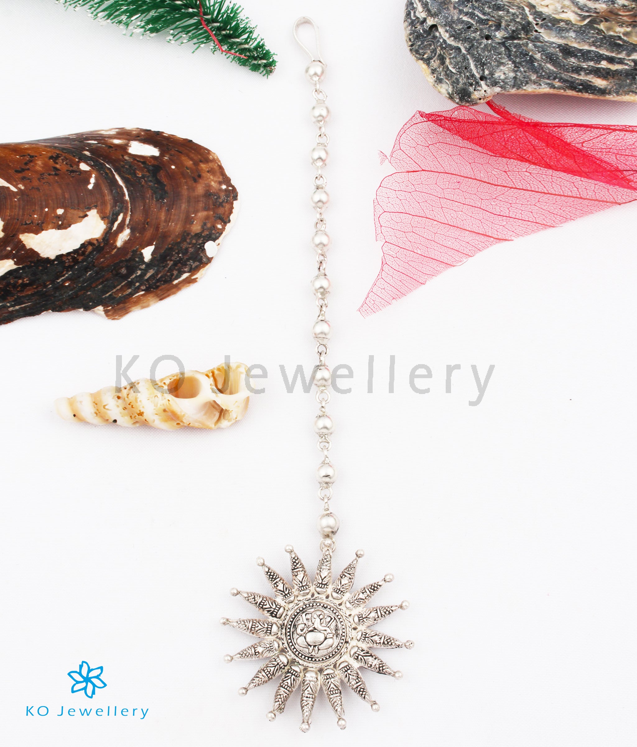 Make a unique fashion statement with this `maang tikka' which has the image of Ganesha in the center.Crafted using techniques used in ancient South Indian antique gold temple jewellery the entire piece is crafted in pure silver and oxidised.