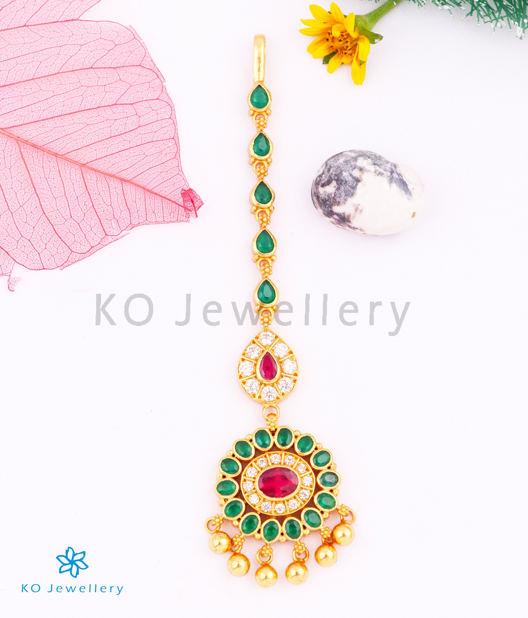 A gorgeous maang tikka decorated with kempu stone this will make a great addition to any bridal outfit. Handcrafted in Sterling silver (92.5%) this is a very pretty accessory.