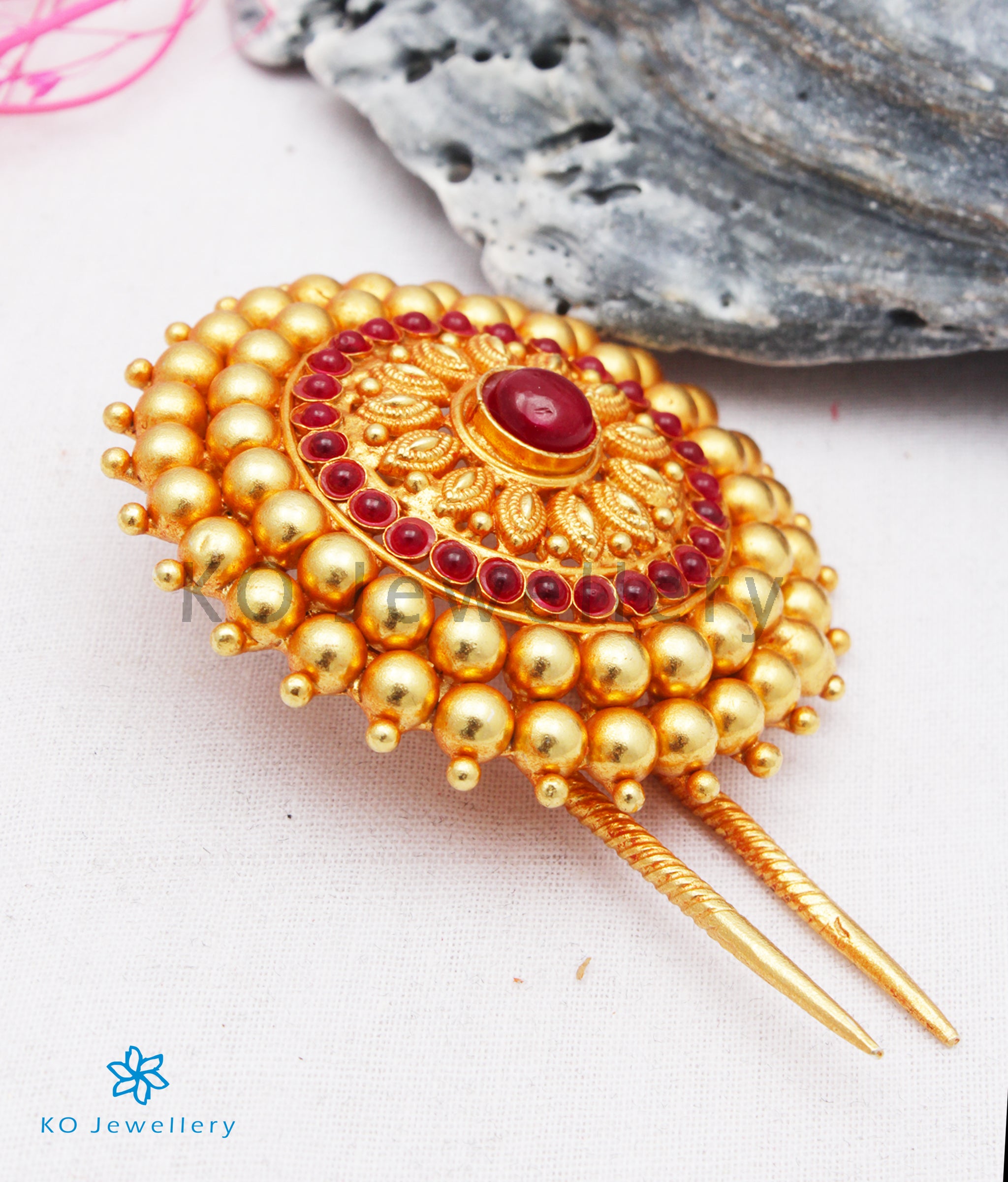 Long hair has been a mark of beauty in India and there are various pieces of jewellery to adorn long tresses.Here we have an ornate hair-clip studded with kempu stones crafted in Sterling Silver (92.5%) and gold-dipped to perfection.Crafted using techniques used in ancient South Indian antique gold temple jewellery this is a true heirloom piece of jewellery.This piece is also available in the antique silver finish on request.