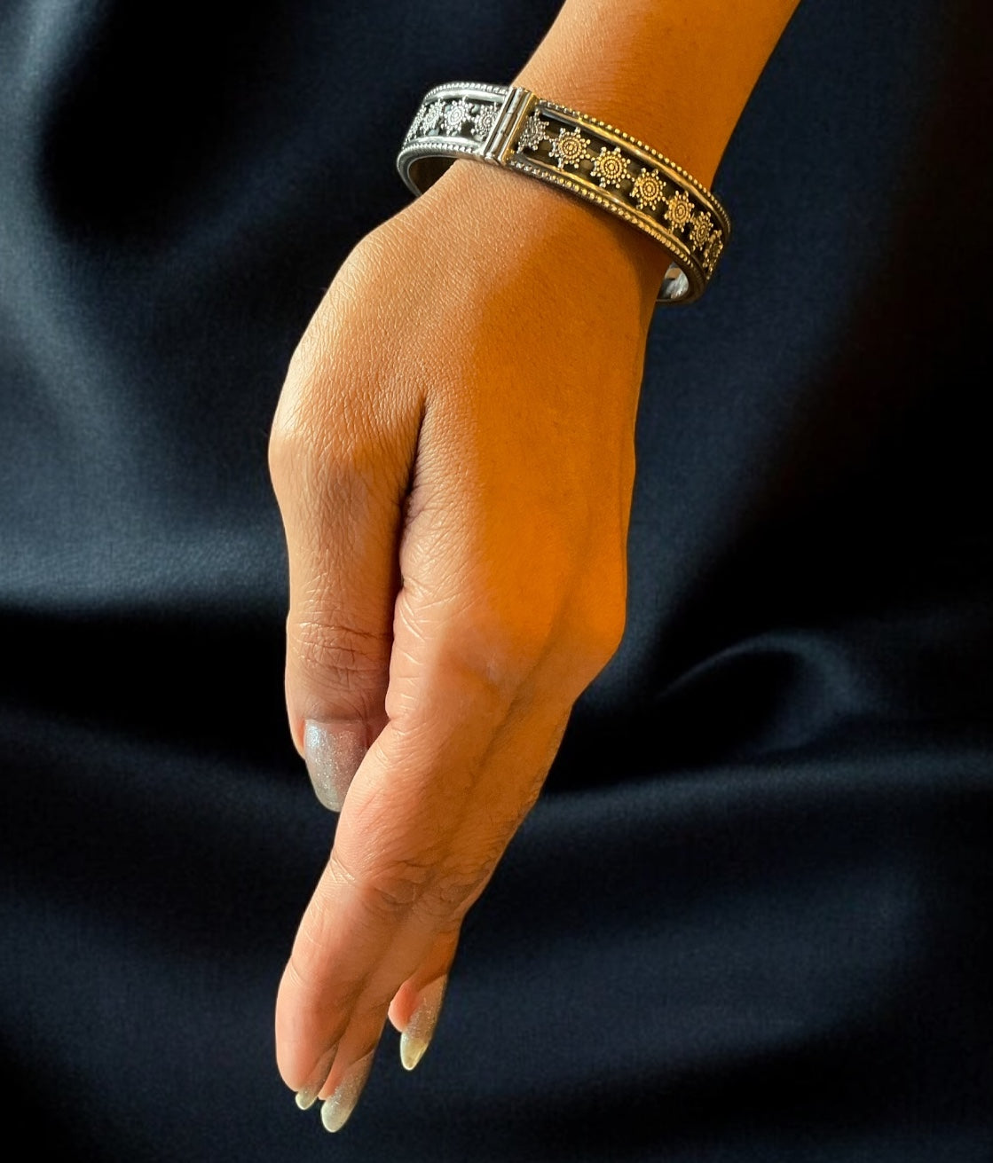 A gorgeous vintage handcrafted Kada in Sterling Silver (92.5%) embellished with intricate design. This openable bracelet that has an antique finish will make a great accessory and will add tons of grace and allure to your look. It is openable and can fit most sizes. The price listed is for a single bangle.