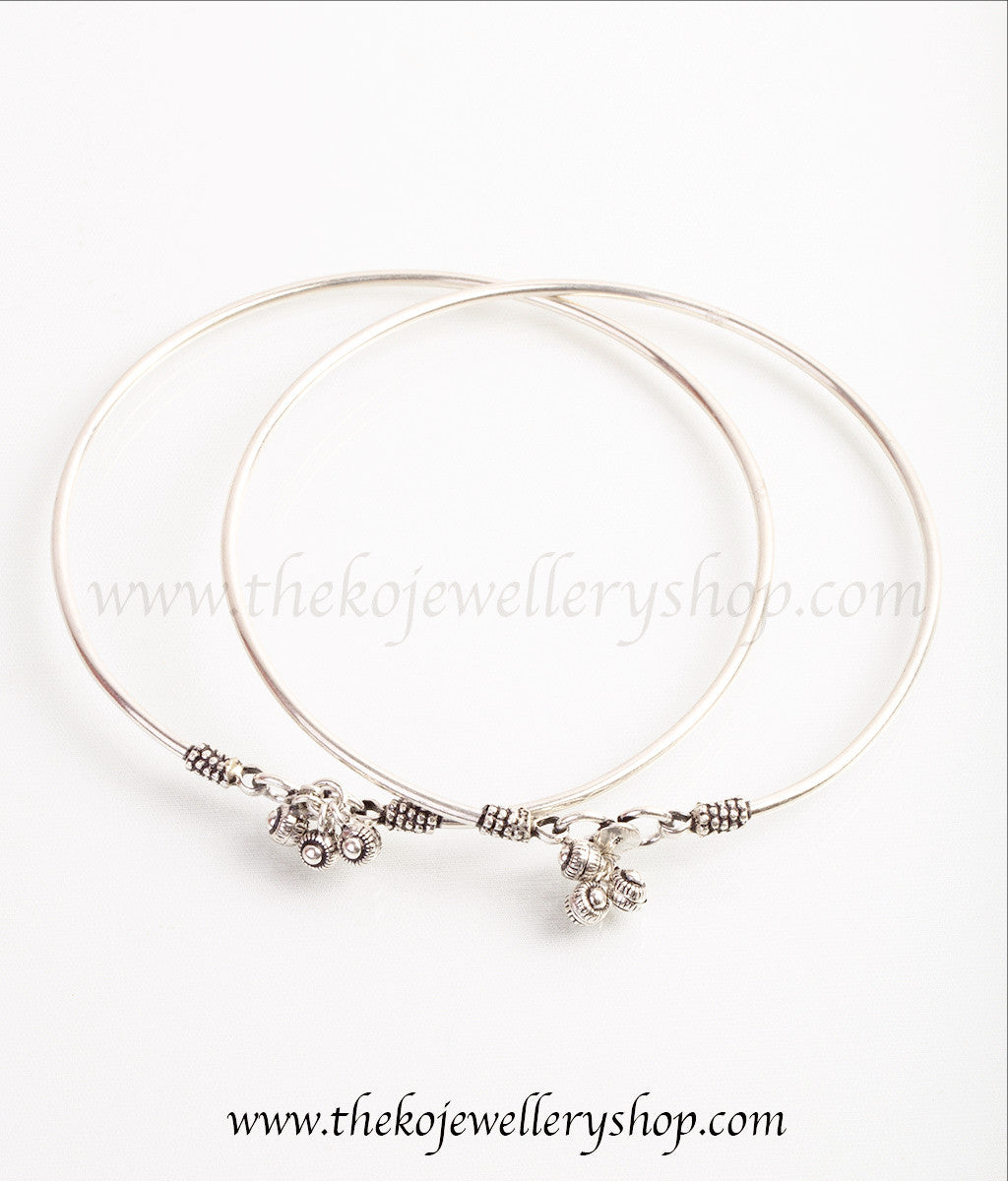 Traditionally anklets are an essential part of a woman's ornamentation. Stiff anklets have been worn in many parts of India from times immemorial. This pair of handcrafted sterling silver (92.5%) anklets have tinkling bells attached to them.