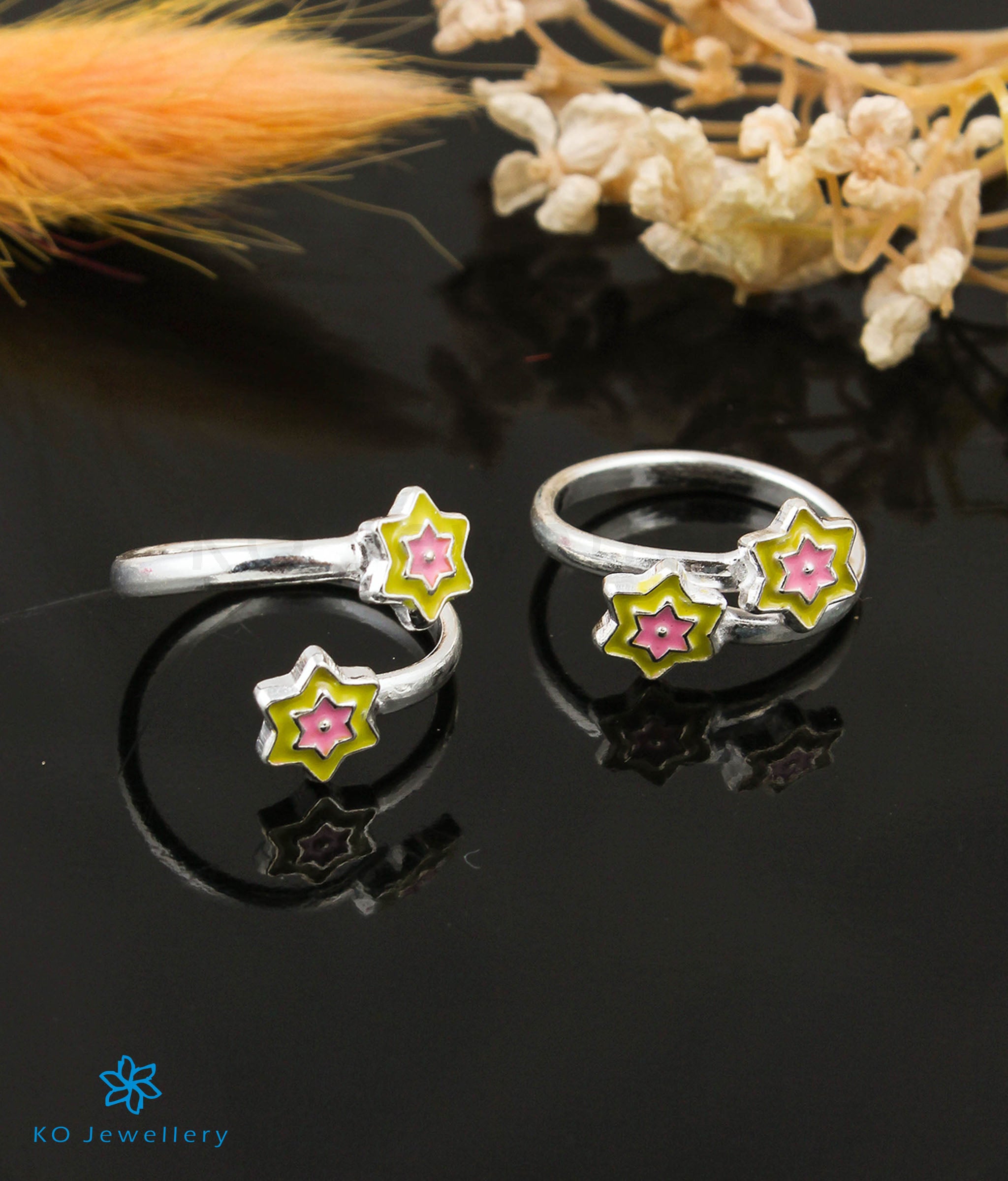 Let your feet do all the talking with this attractive & colourful pair of Sterling silver (92.5%) toe-rings with an attractive design and a dash of enamel colour. You can adjust the open silver band at the front to fit your toe size.