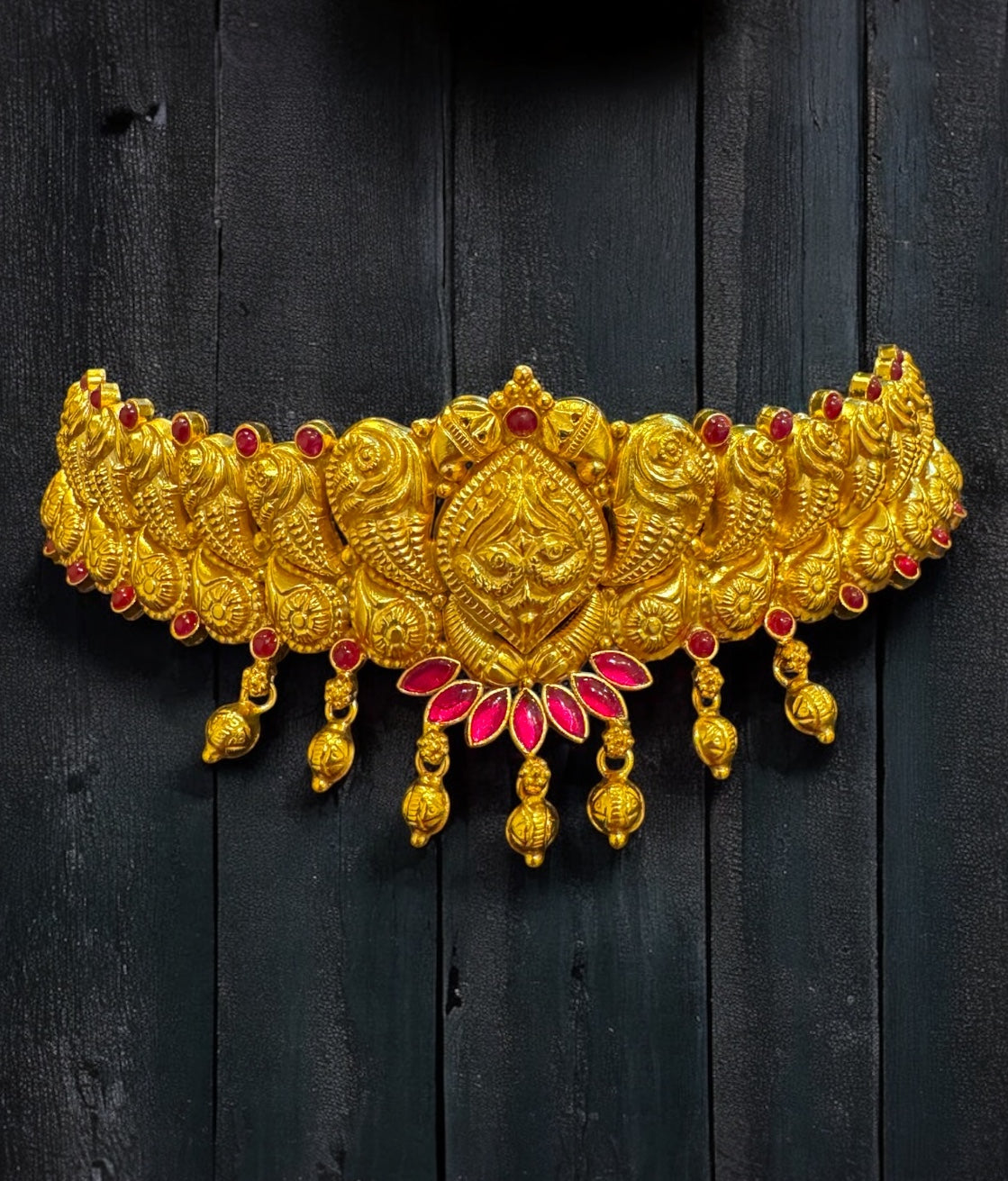 Meticulously sculpted in 92.5 sterling silver and lavishly dipped in 24K gold, the choker boasts a rich antique finish that enhances its timeless appeal. At its center is a striking three-dimensional repoussé pendant, showcasing twin peacocks in a graceful dance—symbols of beauty, grace, and divine connection. Complementing this focal point is a majestic rim lined with delicately carved peacocks, paying homage to the ornamental splendor of temple architecture.