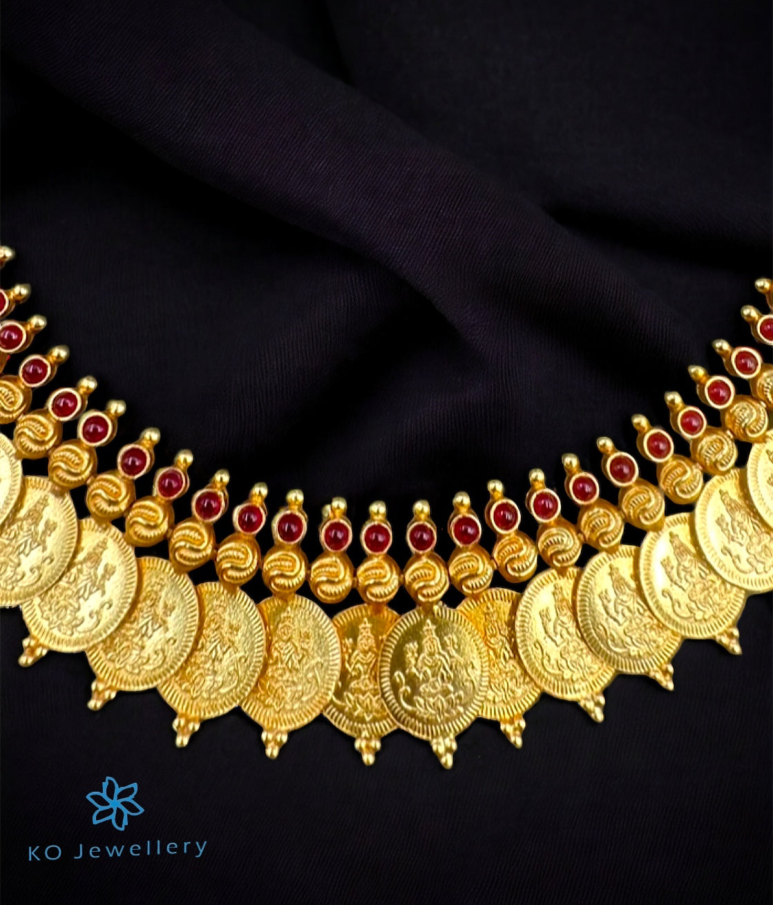 This is a traditional south Indian `kasina-hara', `kasu-malai' or coin necklace, depicting Laxmi the goddess of wealth. Crafted in pure silver and dipped in 24-carat gold this kasu mala is made more alluring by the coins depicting Laxmi sitting on a lotus. Part of the Temple Jewellery collection of KO it is crafted using techniques used in ancient South Indian antique jewellery. All pieces in this collection are crafted in Sterling (92.5) Silver and gold-dipped in a special process to give them an antique look.