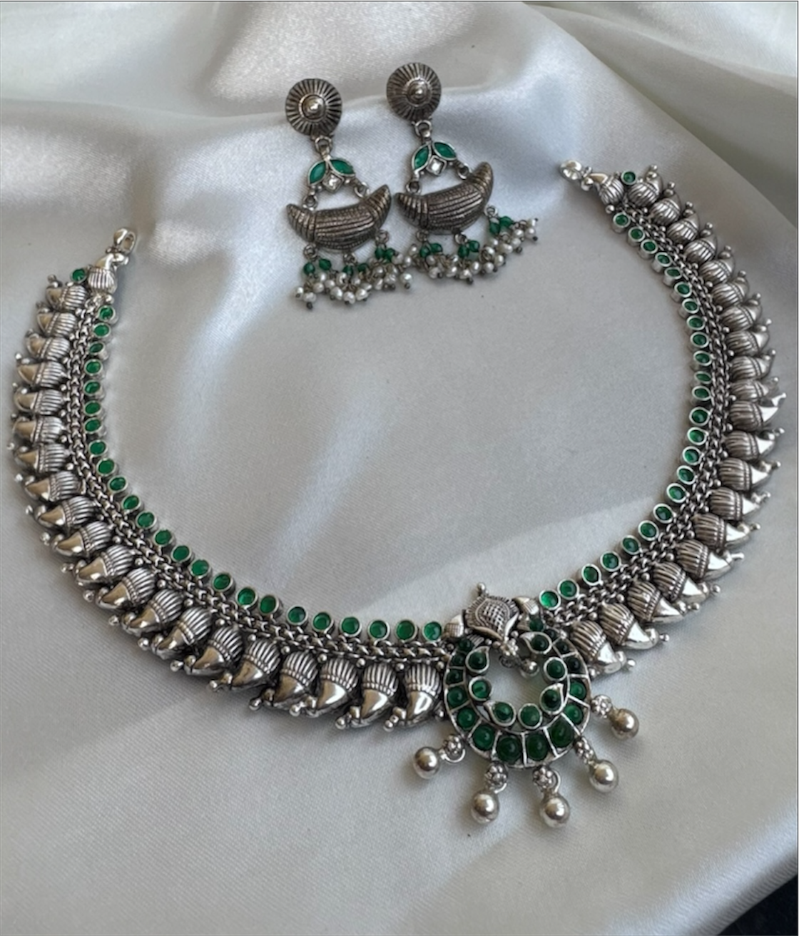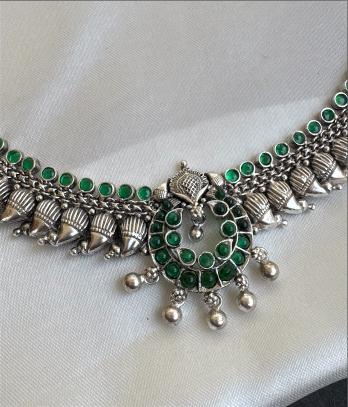 Part of the KO Temple Jewellery Collection, this piece is created using time-honoured techniques inspired by ancient South Indian antique jewellery. Each necklace is crafted in pure Sterling Silver (92.5) through a specialised traditional process, preserving the soul and grandeur of heritage craftsmanship.