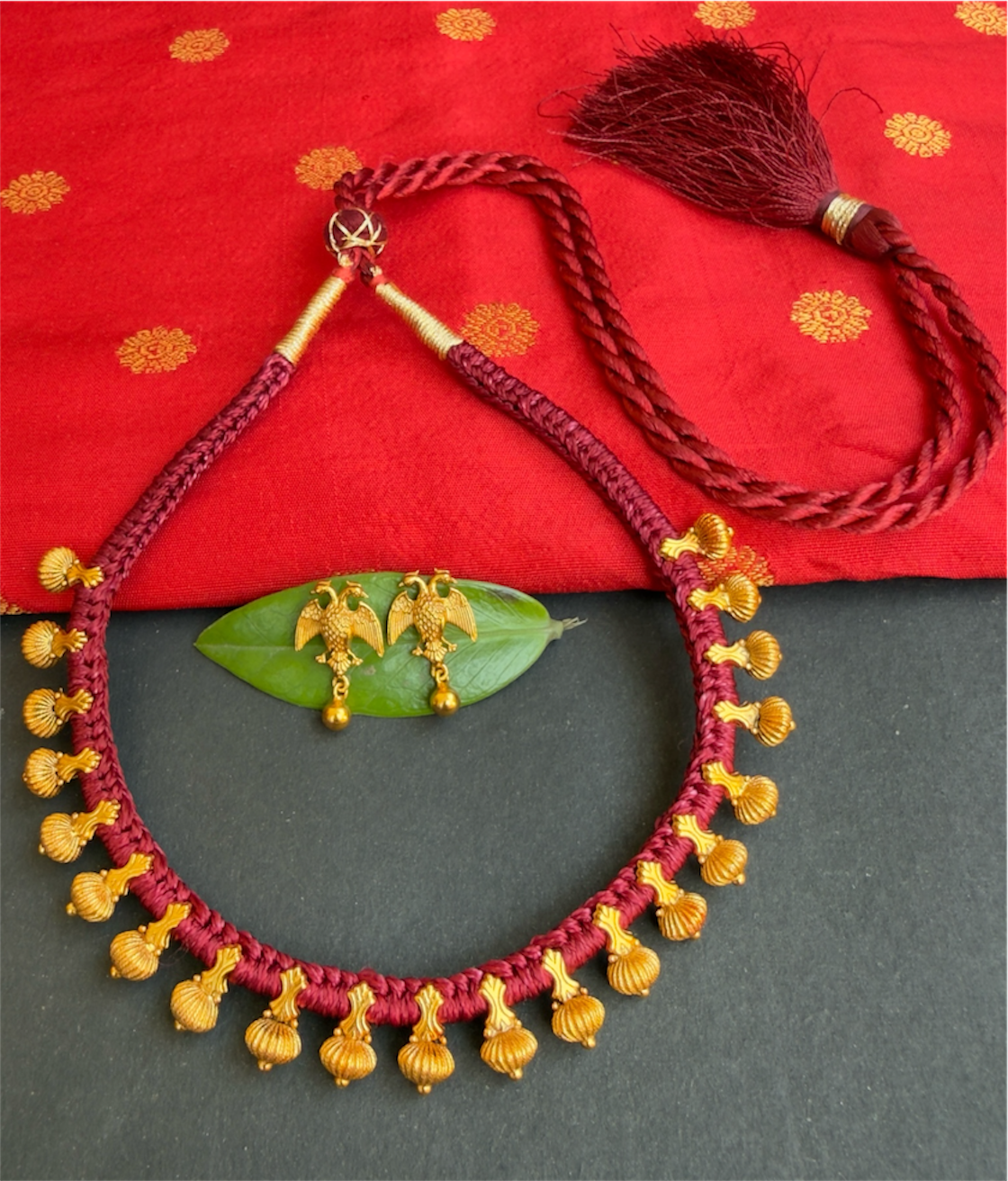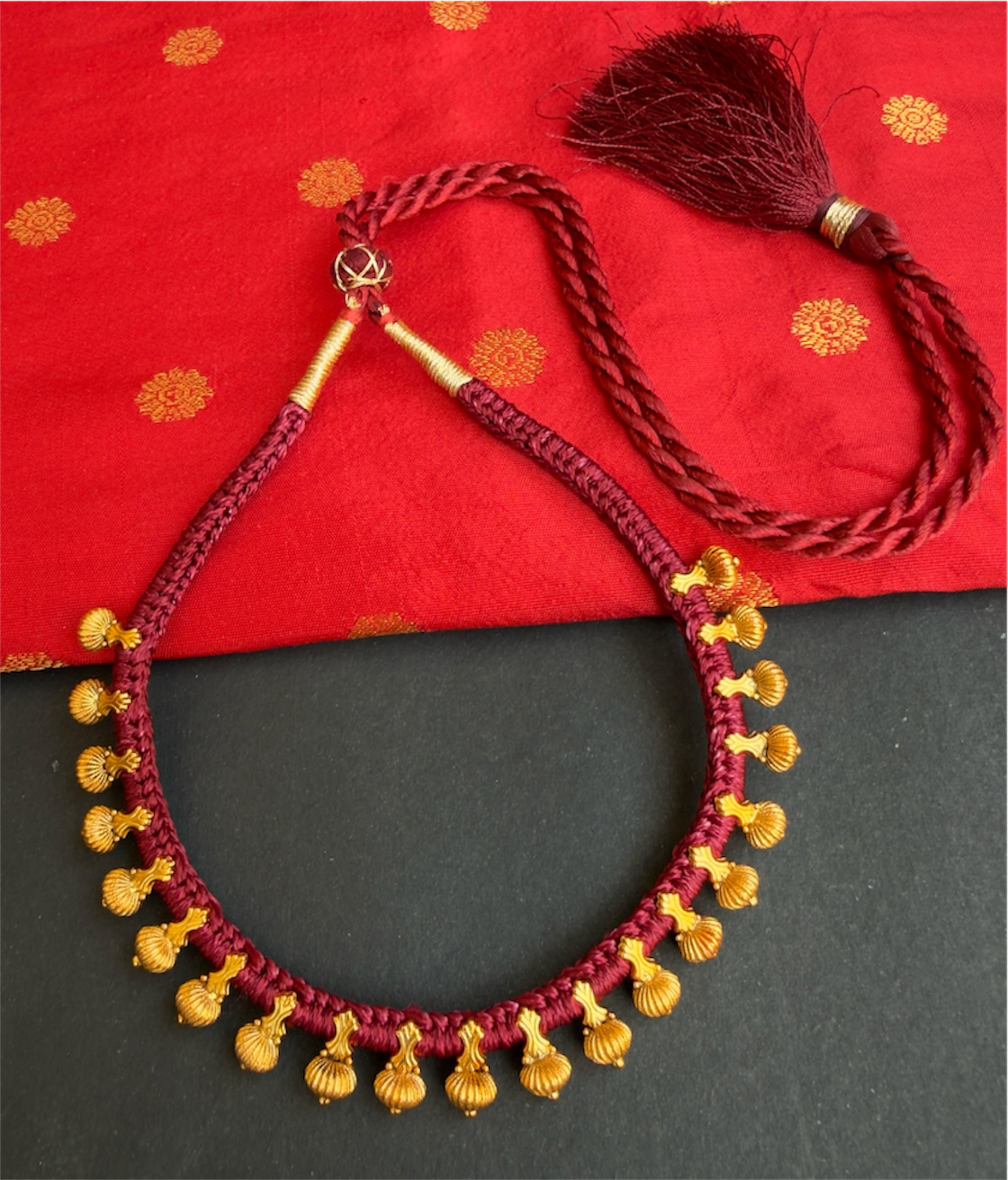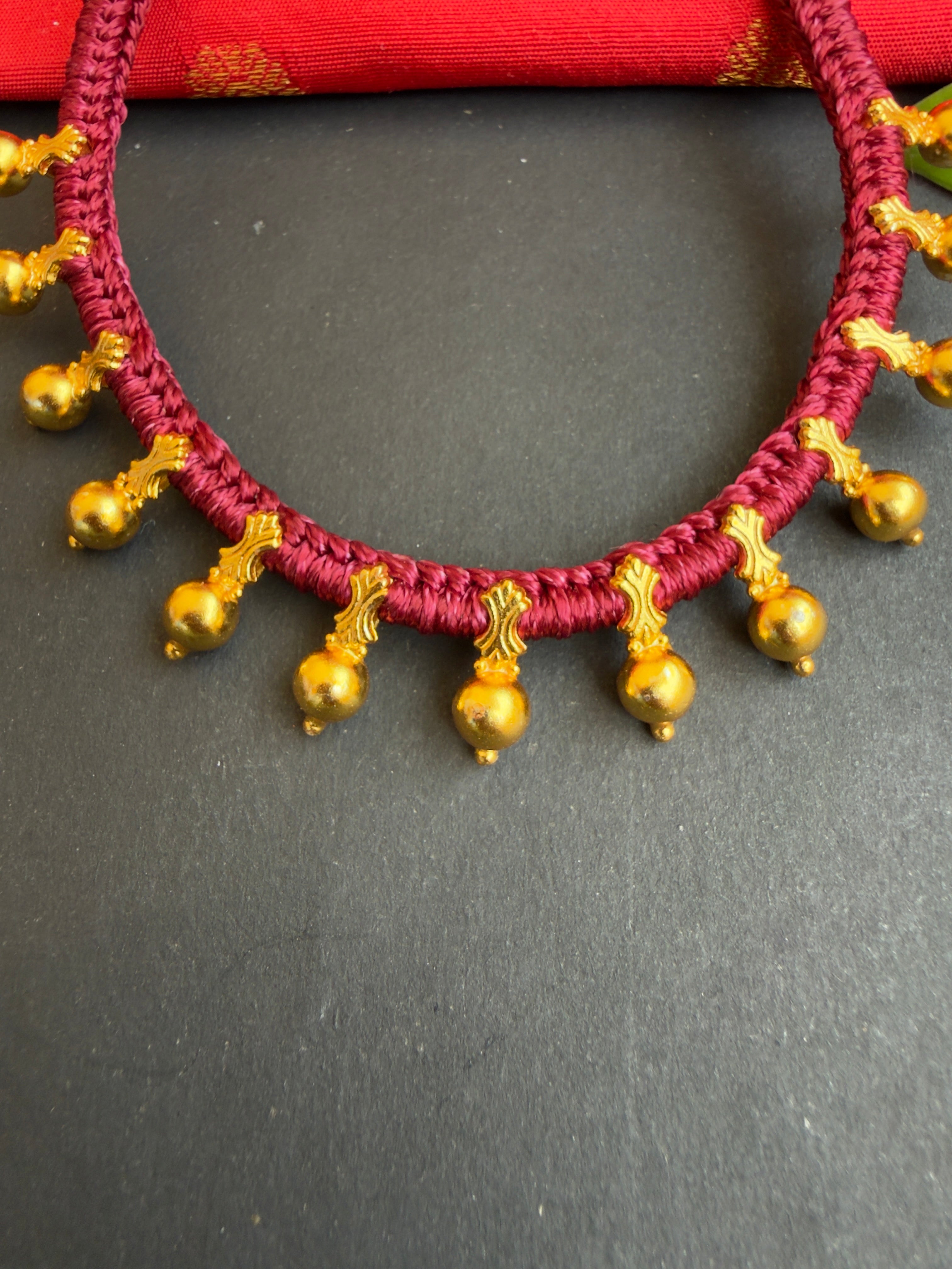 Gold-dipped round beads of sterling silver(92.5%) are handwoven into black cotton thread to create this lovely ethnic necklace. The necklace is in a choker design. Crafted using techniques used in ancient South Indian antique gold temple jewellery the entire piece is crafted in pure silver and gold-dipped. Pair it with one of our antique-looking jhumkas and you are all set to dazzle...