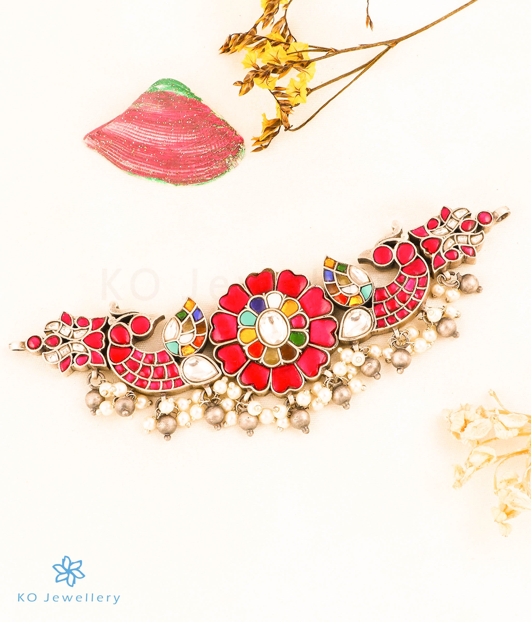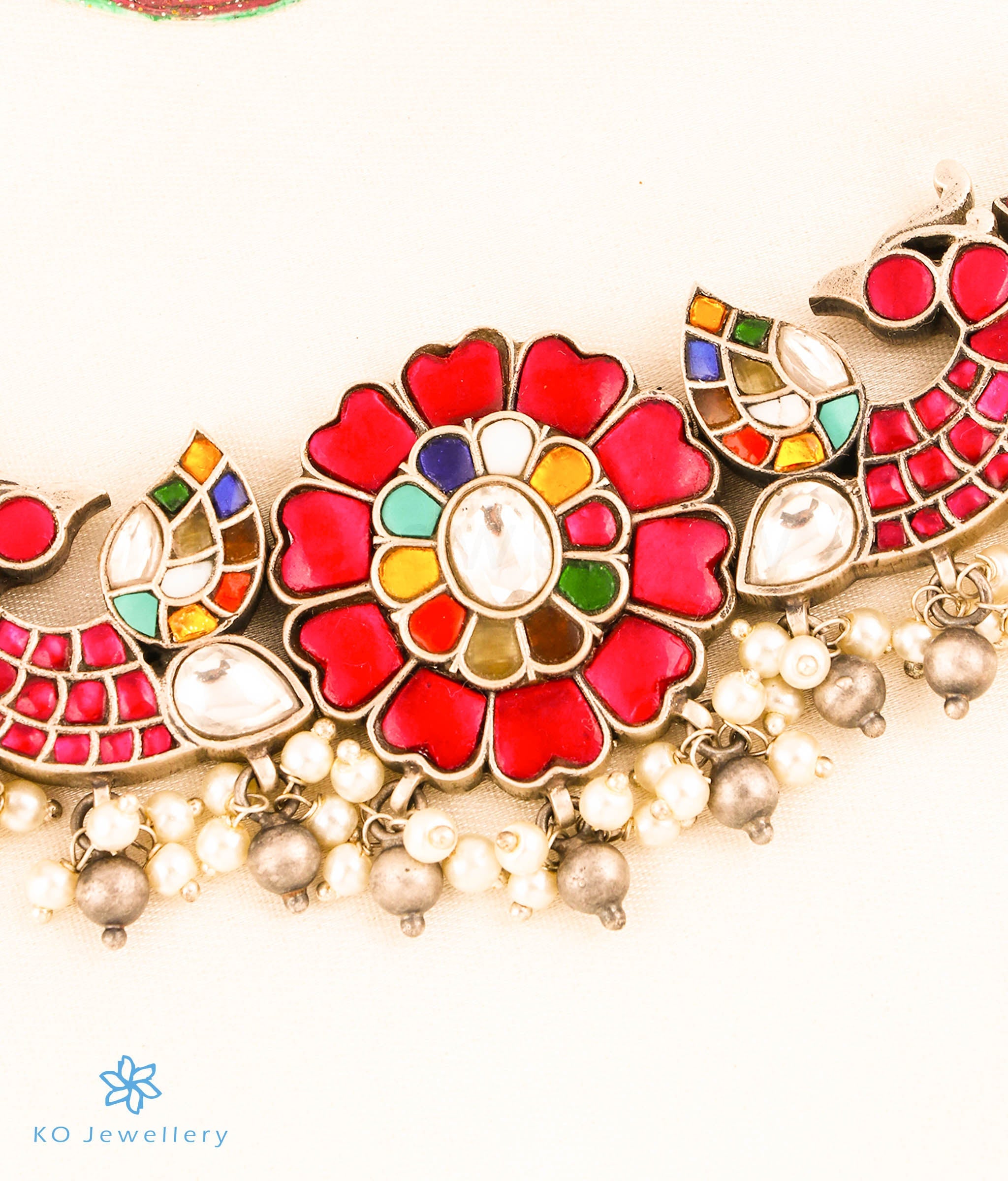 An ornate peacock motif choker-necklace, that is worn close to the neck - this is a versatile piece that can be paired with ethnic attire or even a dress. It has a intricate pendant with red /white polki stones and the pearls used add extra charm. This necklace is crafted in Sterling Silver (92.5%) using techniques used in ancient kundan-jadau jewellery.