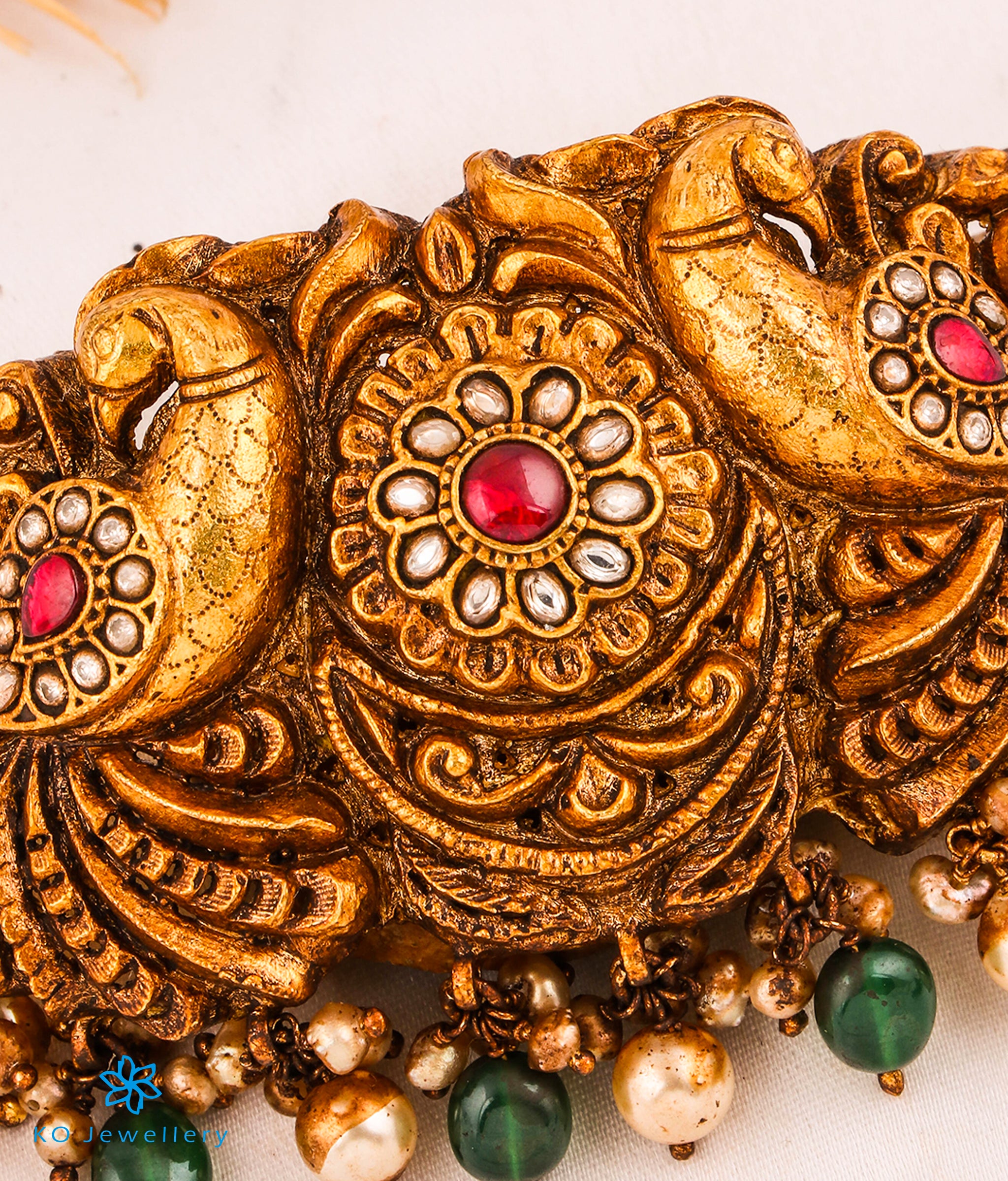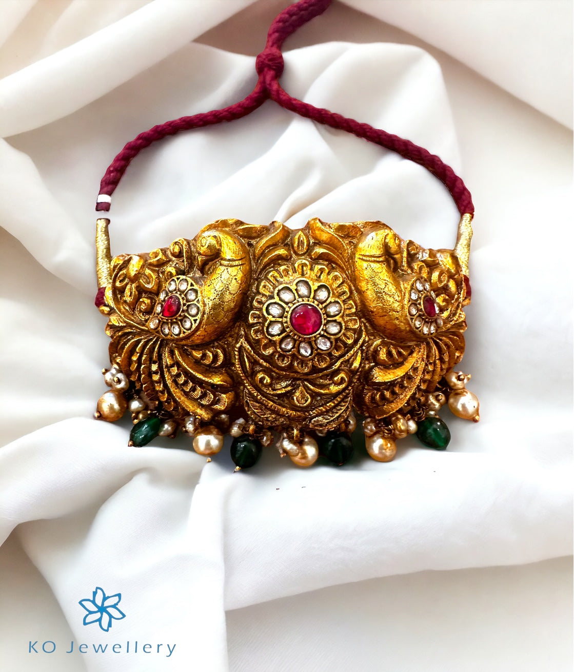 Feel like a modern day princess with this gold-dipped sterling silver (92.5%) choker-necklace crafted in the ancient kundan-jadau tradition of jewellery. The elaborate twin peacock design is studded with red/white polki stones and decorated with Pearl .The entire piece is crafted in pure silver and dipped in 24 karat gold.