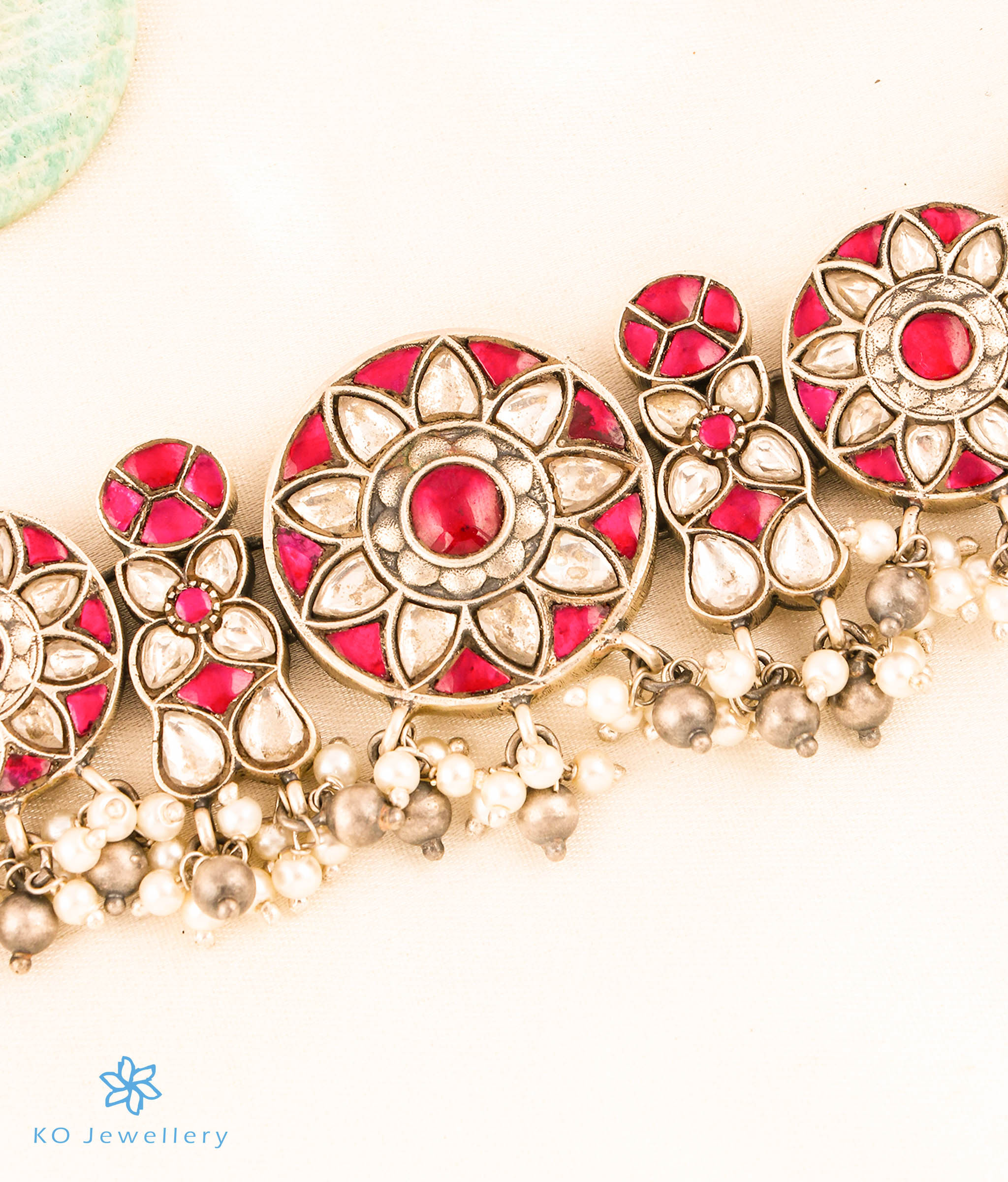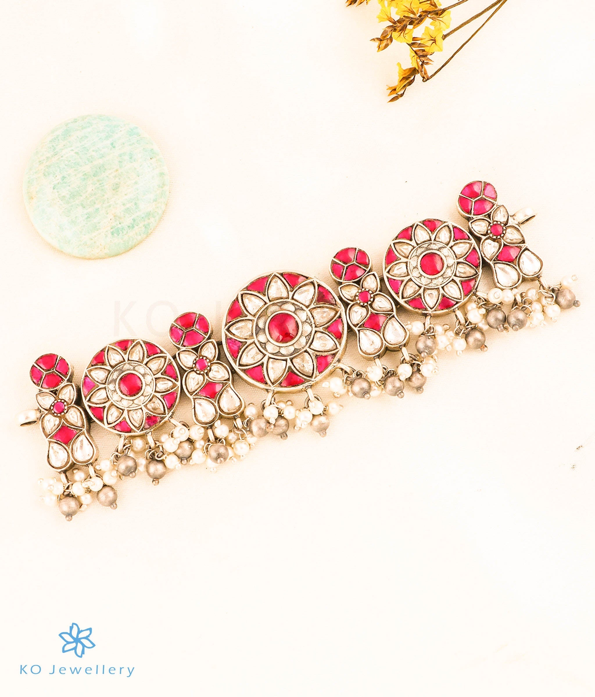 An ornate floral motif choker-necklace, that is worn close to the neck - this is a versatile piece that can be paired with ethnic attire or even a dress. It has a intricate pendant with polki stones and the pearls used add extra charm. This necklace is crafted in Sterling Silver (92.5%) using techniques used in ancient kundan-jadau jewellery. The necklace is paired with matching earrings and the price given is for both necklace & earrings.