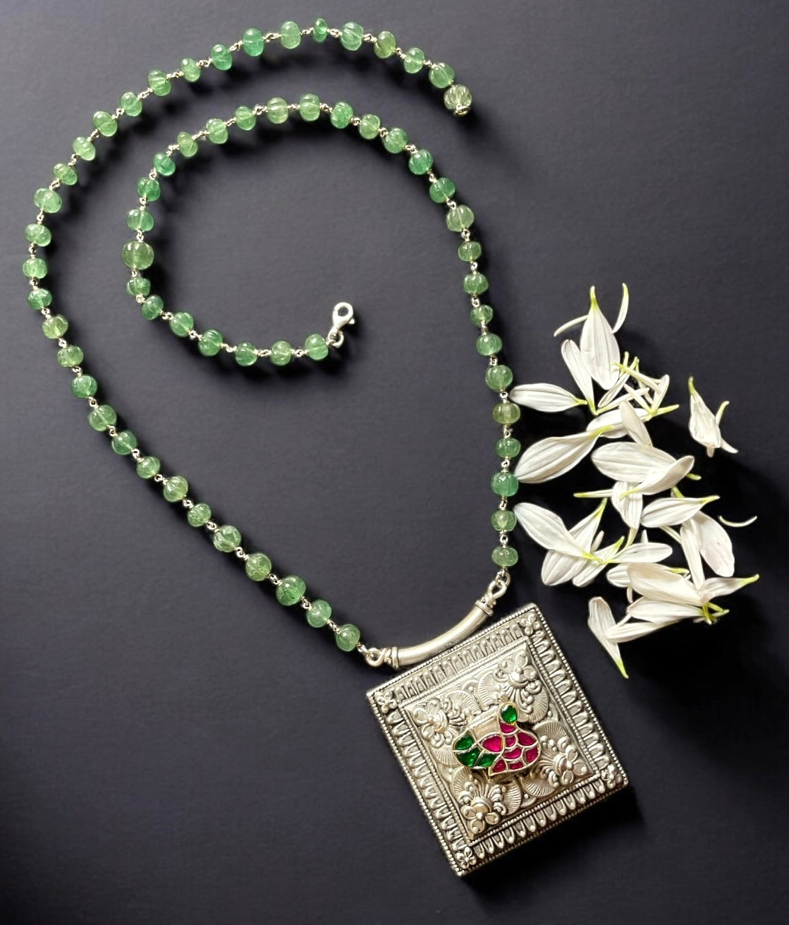 The pendant is hung on a chain of premium faceted green Onyx and silver wire. Crafted using techhniques used in ancient South Indian antique gold temple jewellery the entire piece is crafted in pure Sterling silver(92.5%) and oxidised.