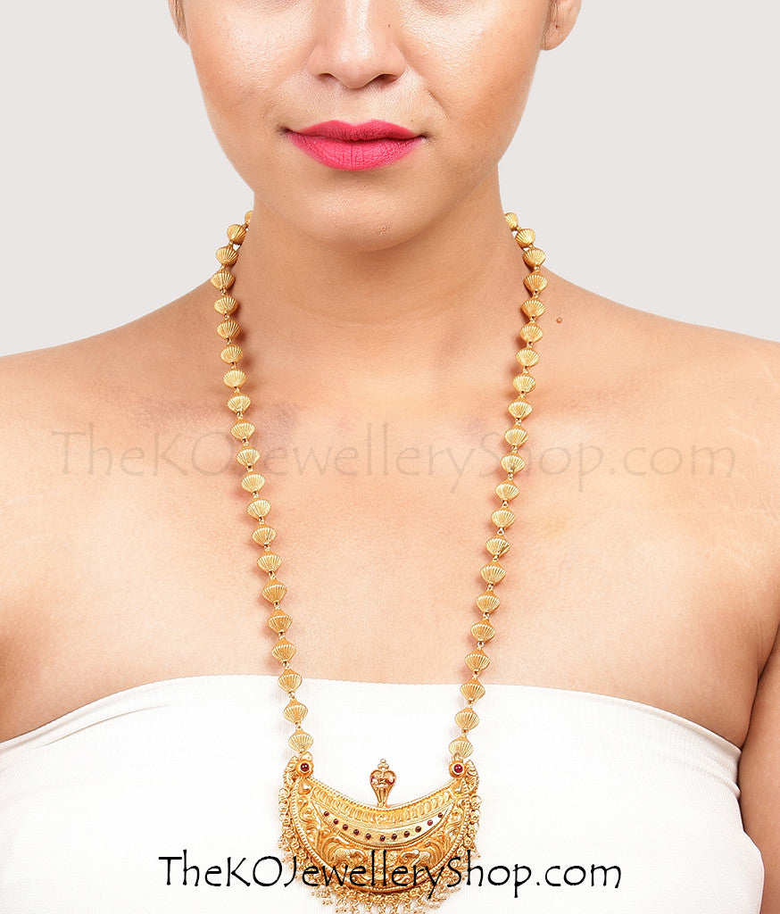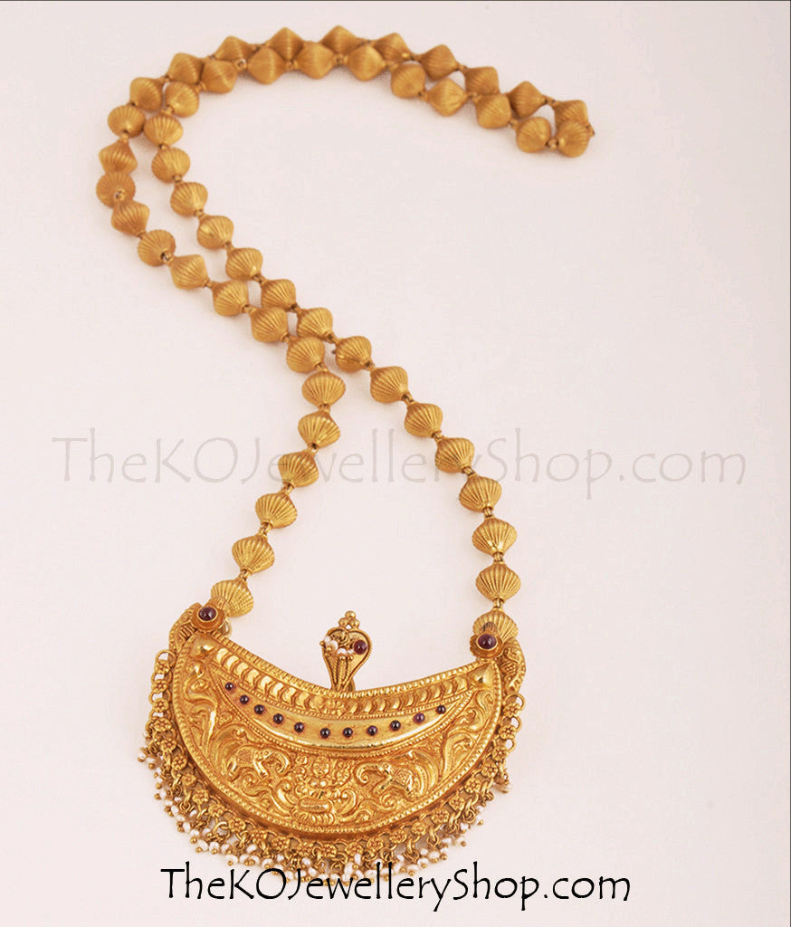 This is the original Kodava Kokkethathi necklace traditionally worn by married women from Coorg in Karnataka; it is crafted in Sterling Silver (92.5%) and gold-dipped. It has a traditional crescent shaped pendant with a serpent at the helm, below which is an image of Goddess Lakshmi. The Goddess embodies wealth and prosperity and the serpent, fertility. The rim of the pendant is fringed with pearls.