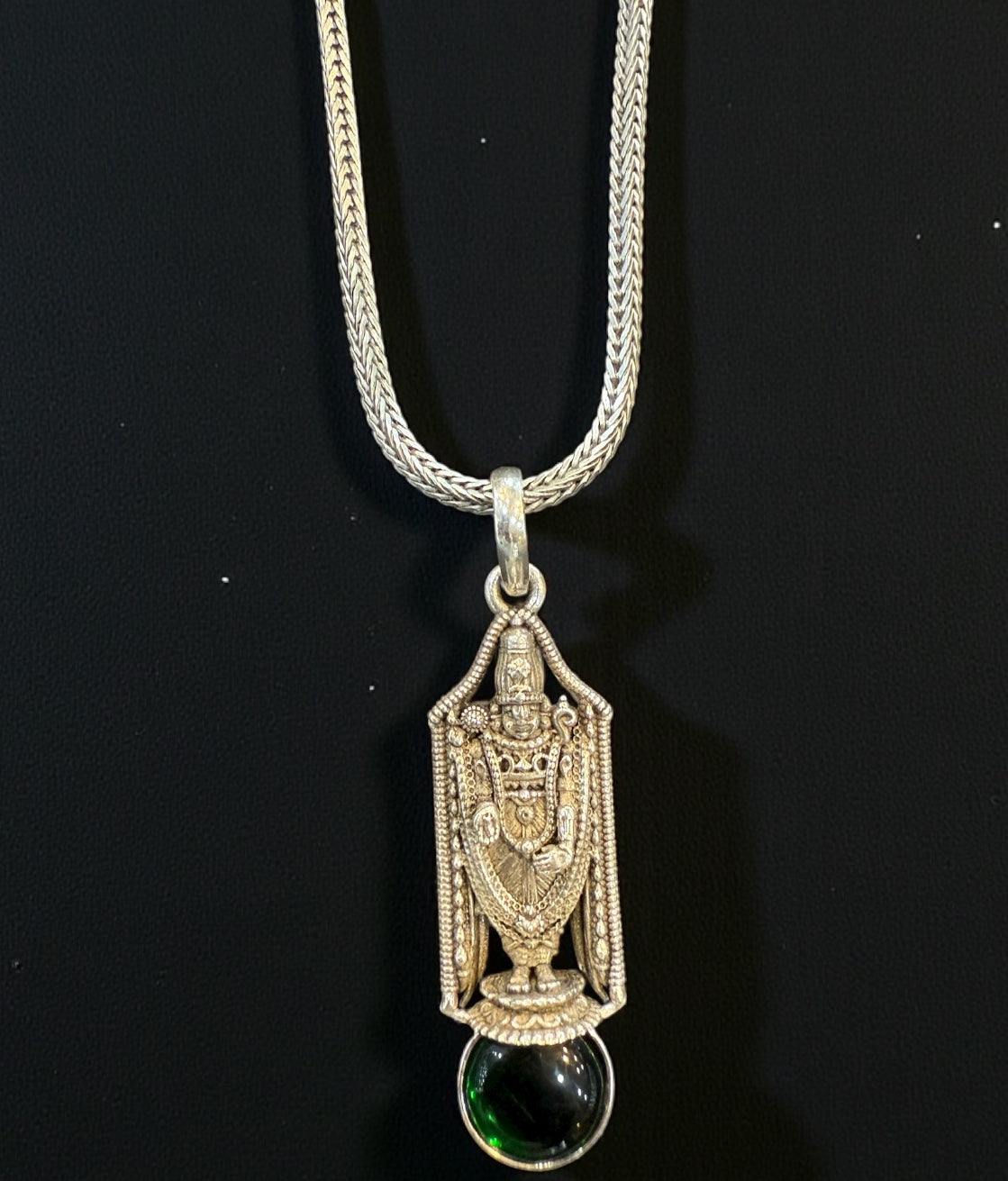 The Madhava Silver Venkateshwara Green Kemp Pendant (Oxidised)