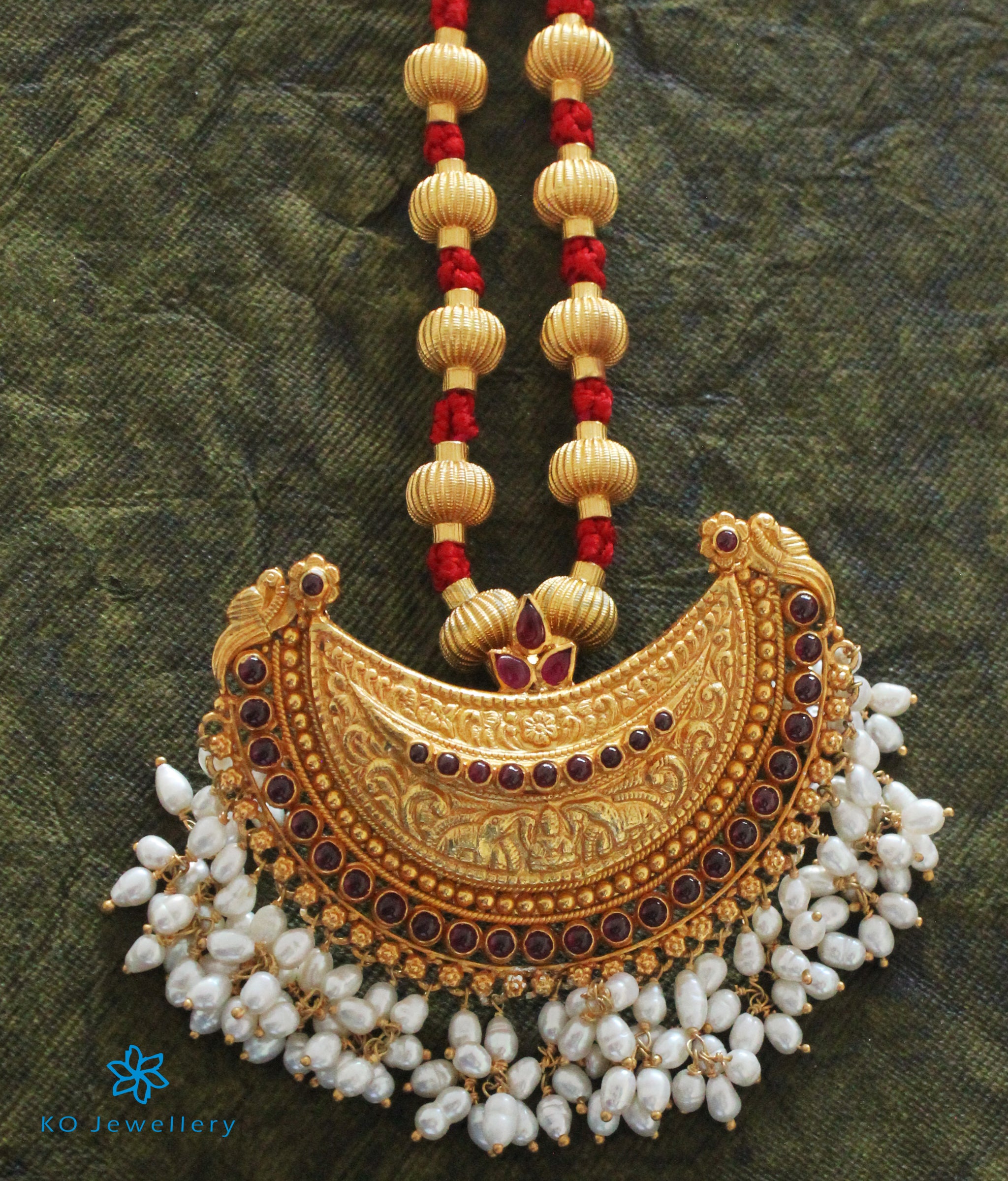 Amazingly graceful and essentially ethnic this necklace made up of gold-dipped, silver beads ( which have a unique ribbed design or grooves) and is a traditional centuries old ornament worn by women in south India. The ornate Kokkethathi pendant is topped by twin peacocks and decorated with kempu stones.It is paired with matching earrings. The entire piece is handcrafted in Sterling Silver (92.5%) and gold-dipped in a special process.