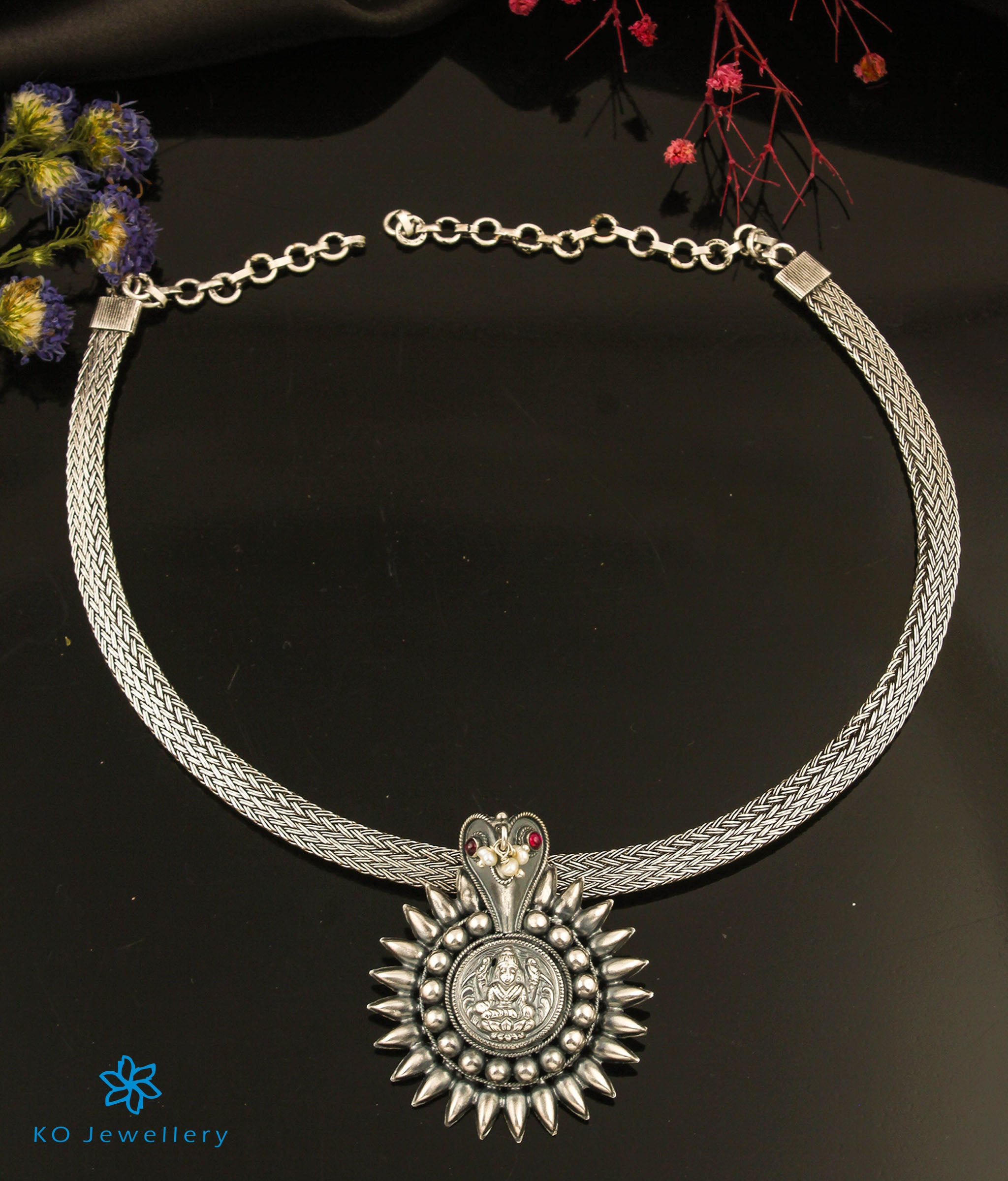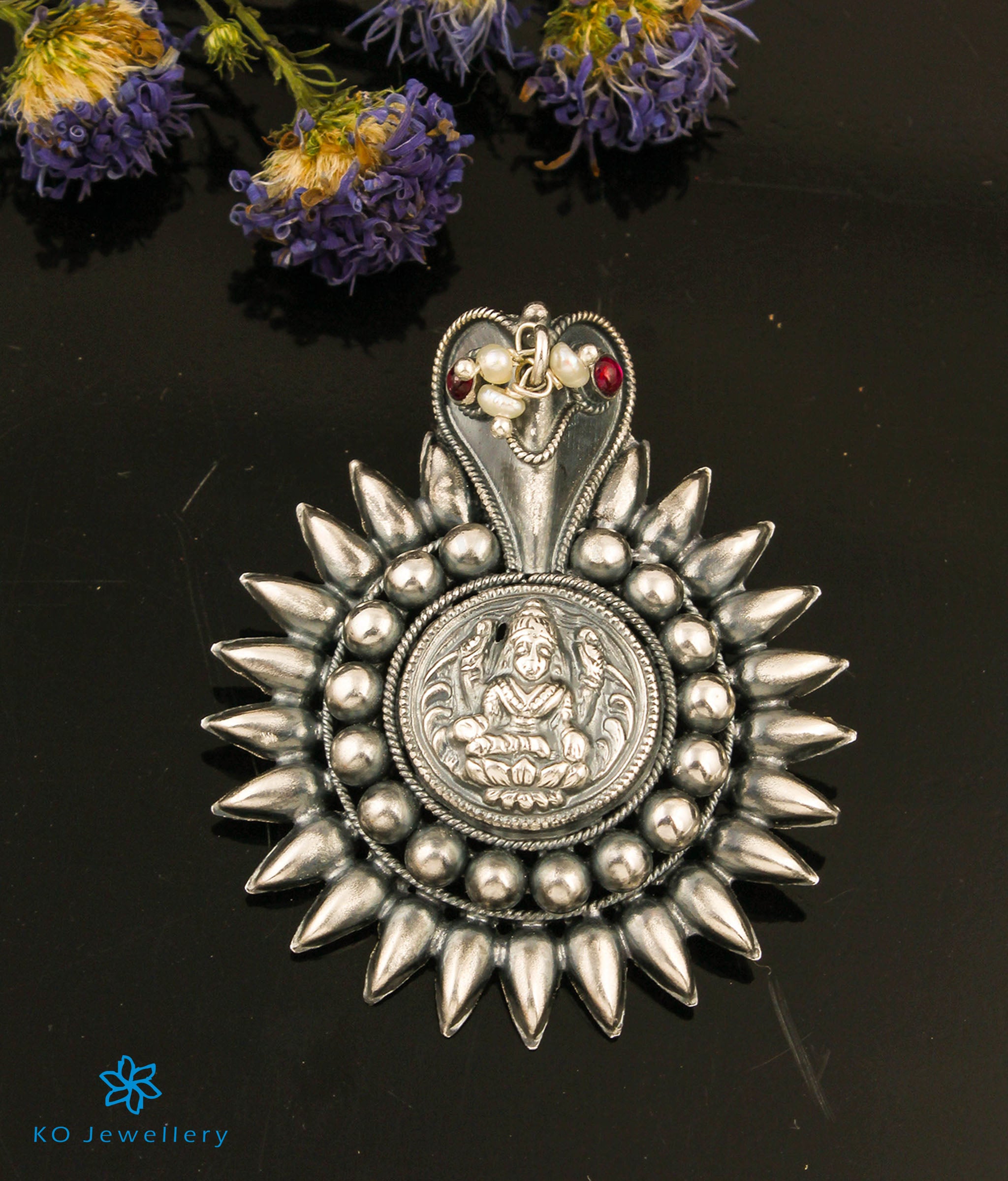 This pendant is a copy of the traditional "Thali" or mangalsutra worn by married women from Coorg in Karnataka. Crafted in Sterling Silver (92.5%) and oxidised to perfection, it has a traditional round shape with a serpent at the helm and the image of goddess Lakshmi at the center.
