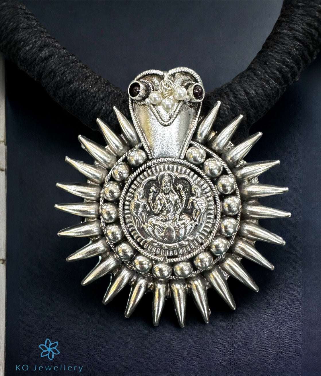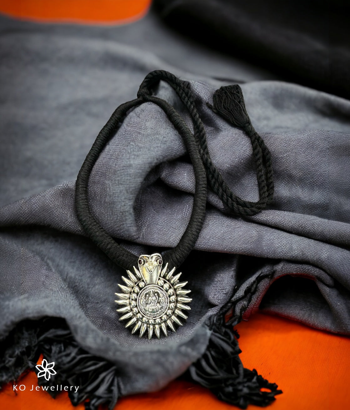 This Sterling Silver (92.5%) pendant is a copy of the traditional "Thali" or mangalsutra worn by married women from Coorg in Karnataka ; it has a traditional round shape with a serpent at the helm and the image of goddess Lakshmi at the center. It is fixed on a handwoven cotton thread.