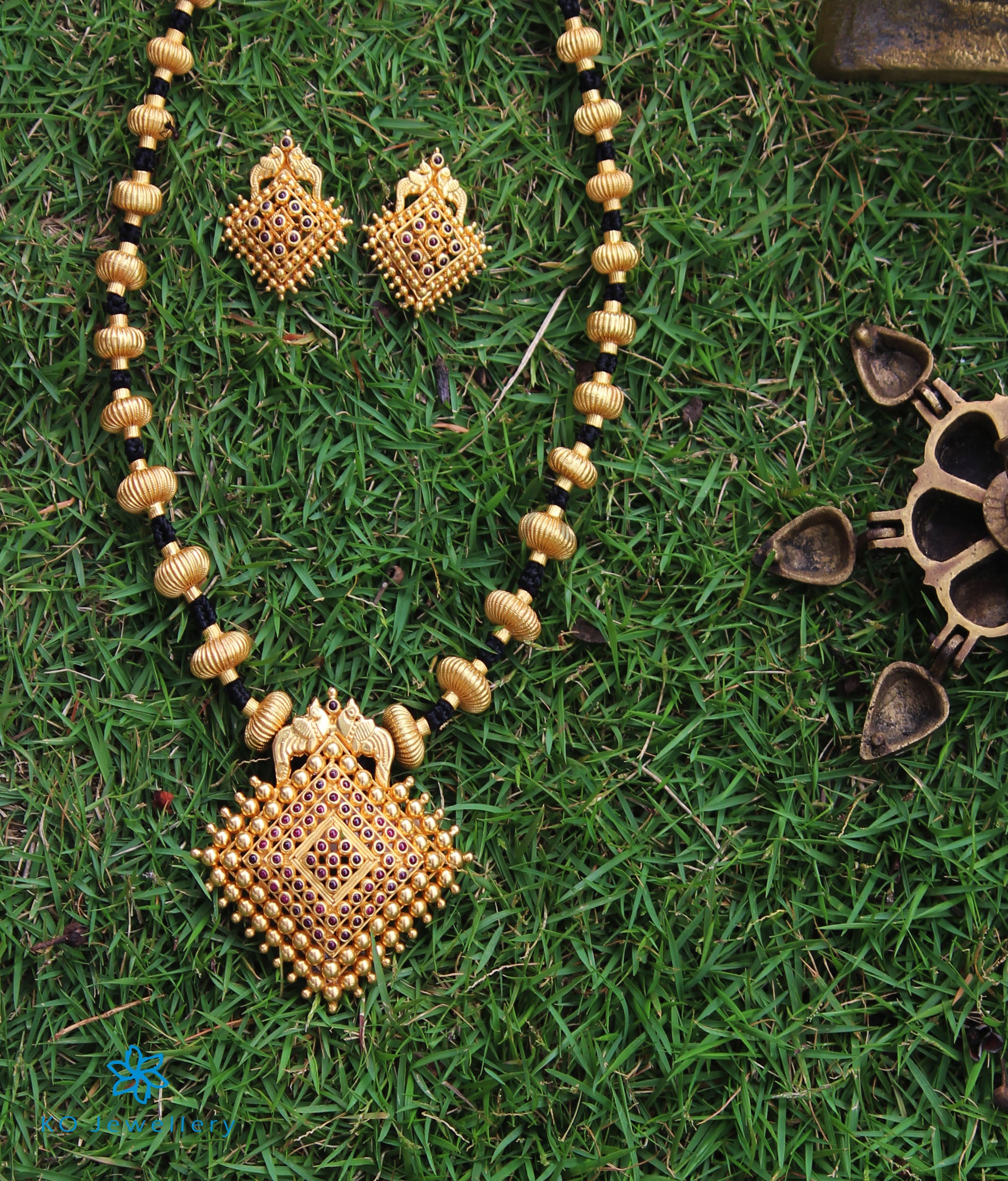 Amazingly graceful and essentially ethnic this necklace made up of gold-dipped, silver beads which are graded from big to small (and have a unique ribbed design or grooves) and is a traditional centuries old ornament worn by women in south India. The ornate pendant is topped by twin peacocks and decorated with kempu stones.It is paired with matching earrings. The entire piece is handcrafted in Sterling Silver (92.5%) and gold-dipped in a special process.