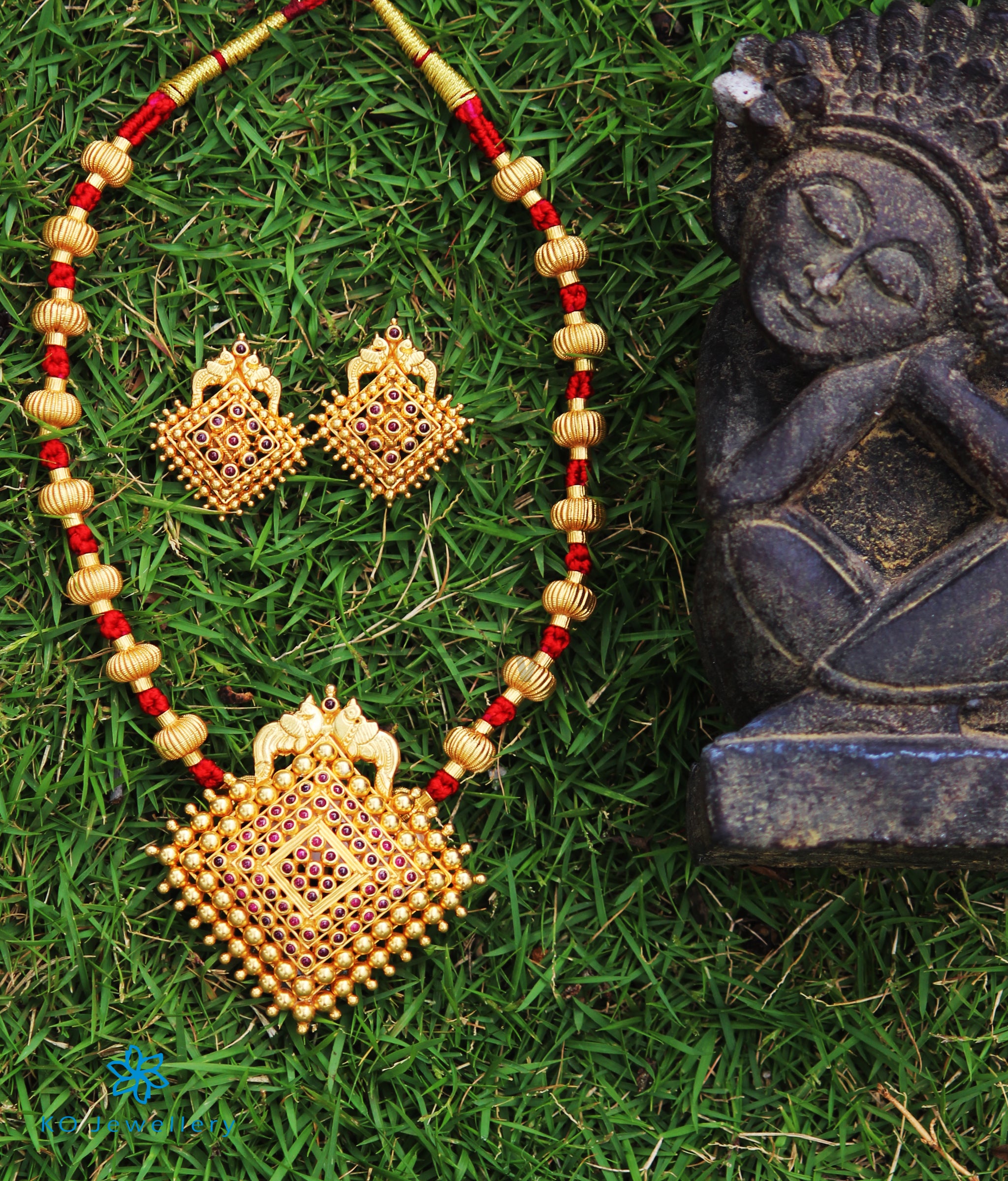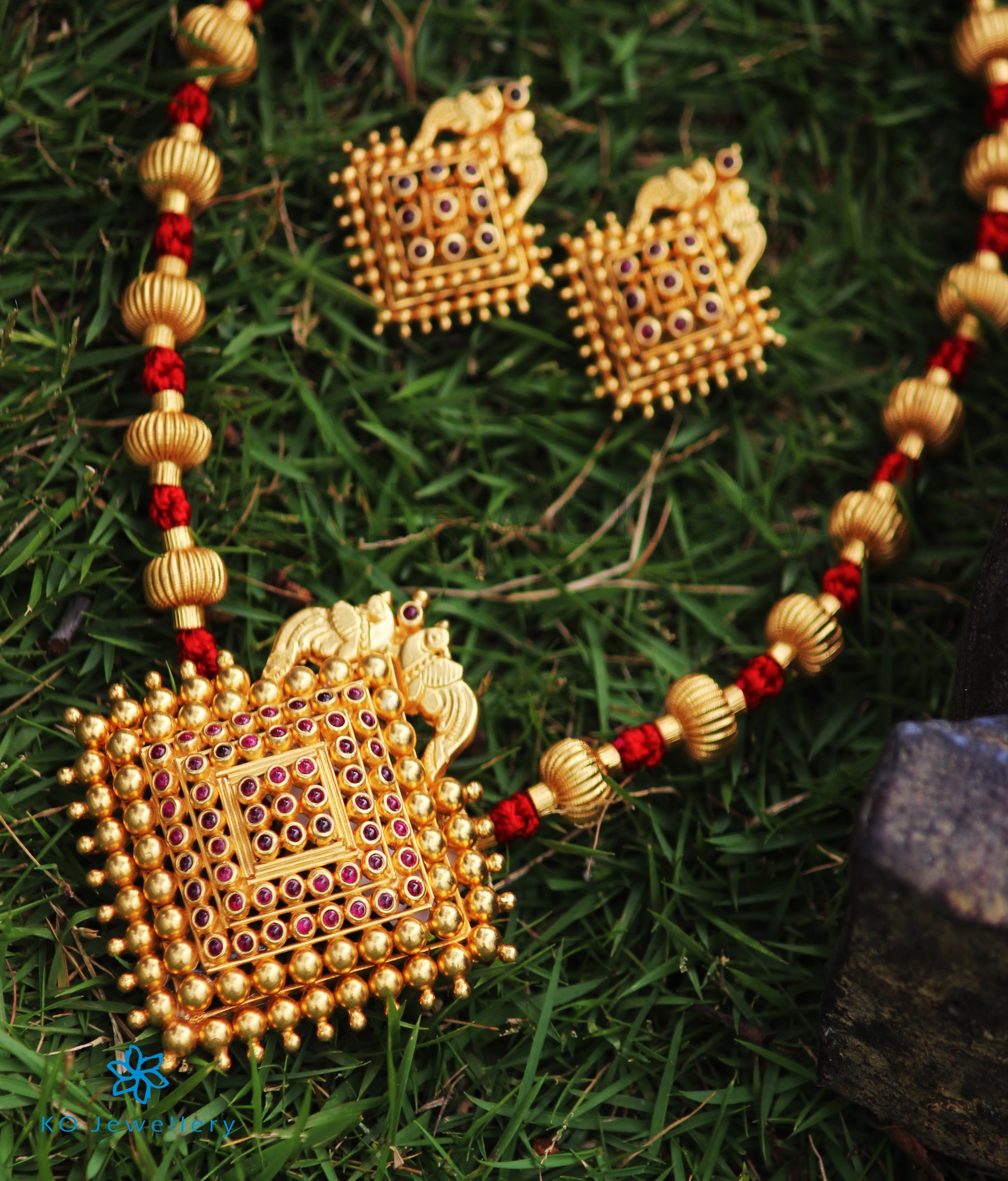 Amazingly graceful and essentially ethnic this necklace made up of gold-dipped, silver beads ( which have a unique ribbed design or grooves) and is a traditional centuries old ornament worn by women in south India. The ornate pendant is topped by twin peacocks and decorated with kempu stones.It is paired with matching earrings. The entire piece is handcrafted in Sterling Silver (92.5%) and gold-dipped in a special process.