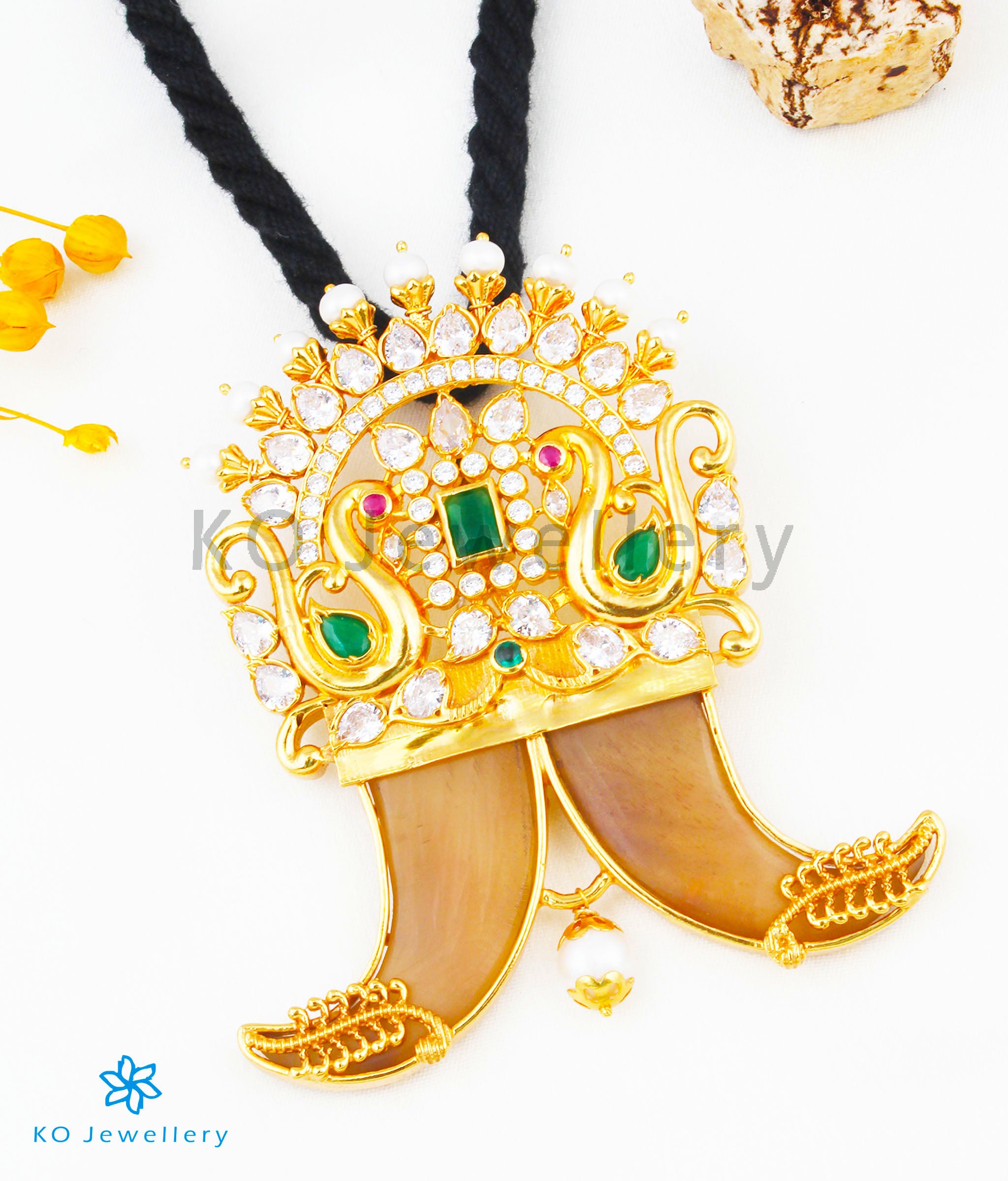 Awe everyone with this impeccable peacock motif 'Tiger-claw' pendant crafted in Sterling Silver (92.5%) and gold-dipped to perfection . Traditionally worn by men as a symbol of courage the tiger-claw pendant is a classic design in traditional indian jewellery. The pendant uses faux tiger claws, and kemp stones with Pearl.