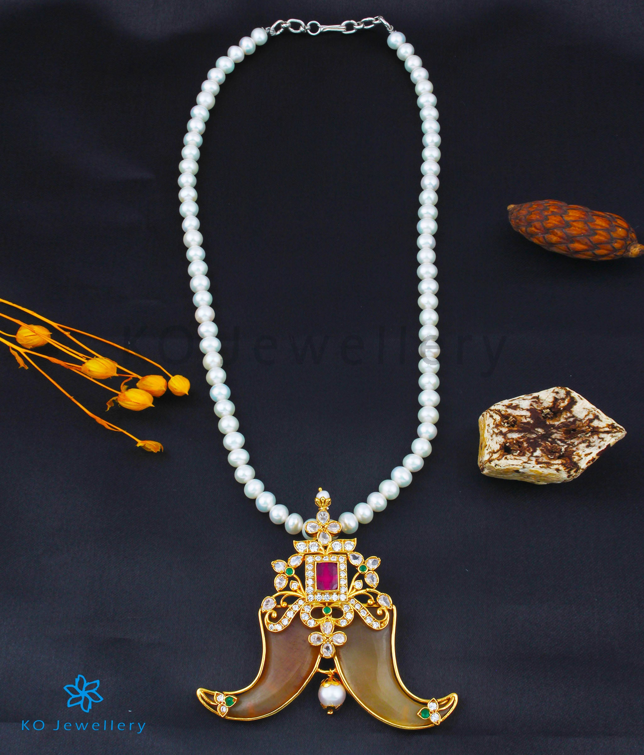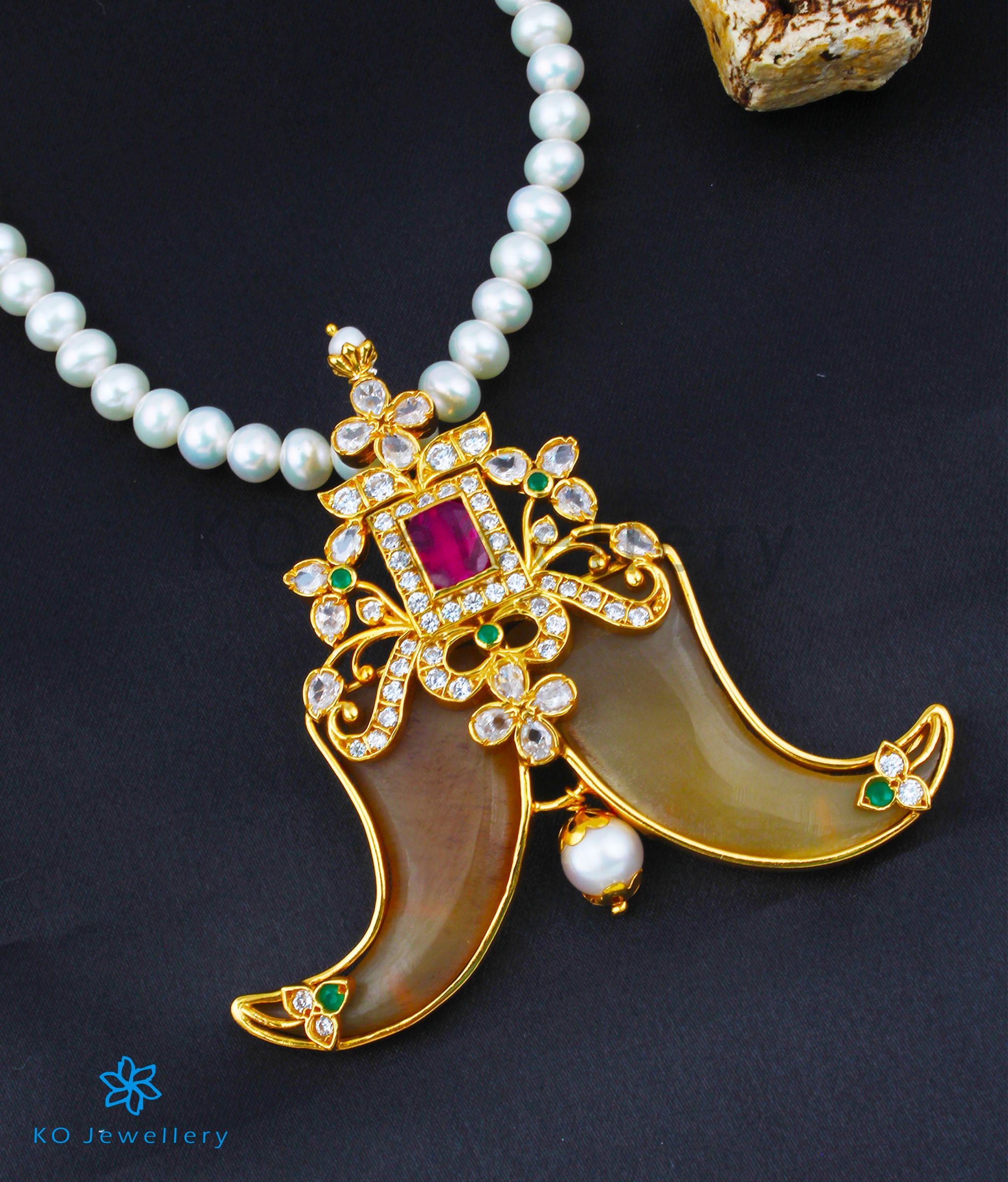 Awe everyone with this impeccable 'Tiger-claw' necklace crafted in Sterling Silver (92.5%) and gold-dipped to perfection. Traditionally worn by men as a symbol of courage the tiger-claw pendant is a classic design in traditional indian jewellery. The pendant uses faux tiger claws, and kemp stones with Pearl.