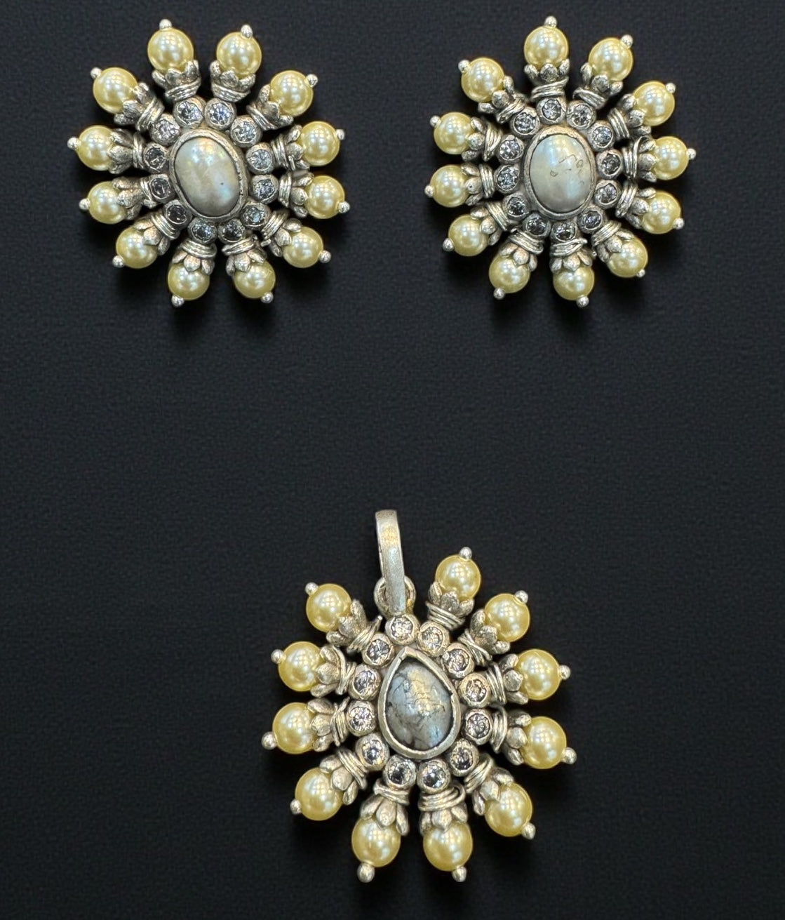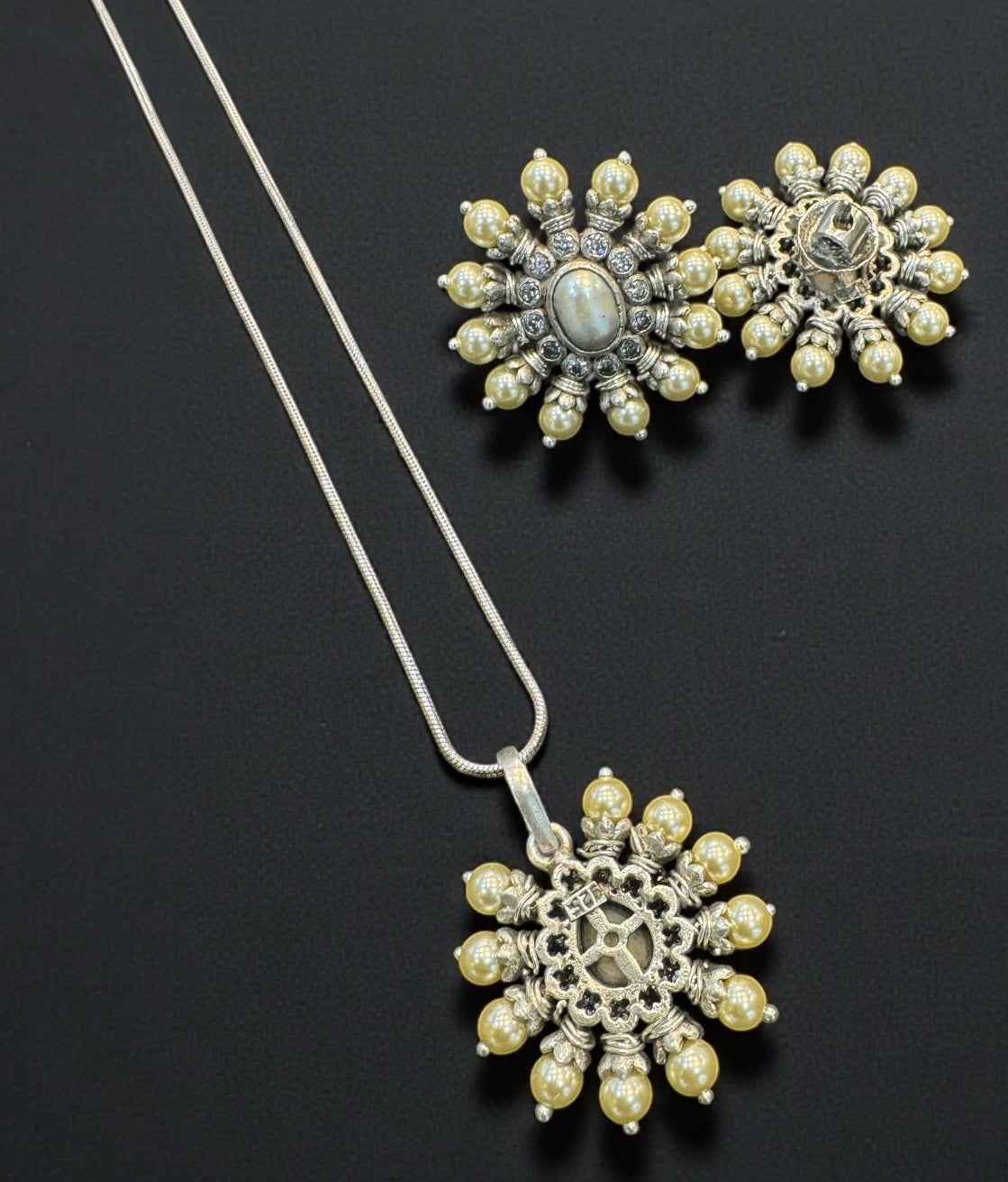 The Gajra Silver Pearl Pendant & Earrings (Oxidised)