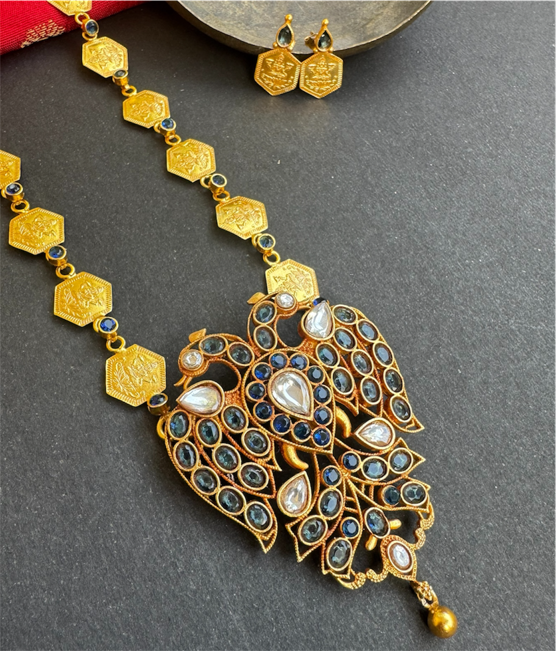 The intricate detailing, traditional motifs and flawless craftsmanship make it a standout temple jewellery piece—grand enough for special occasions yet versatile for contemporary styling.