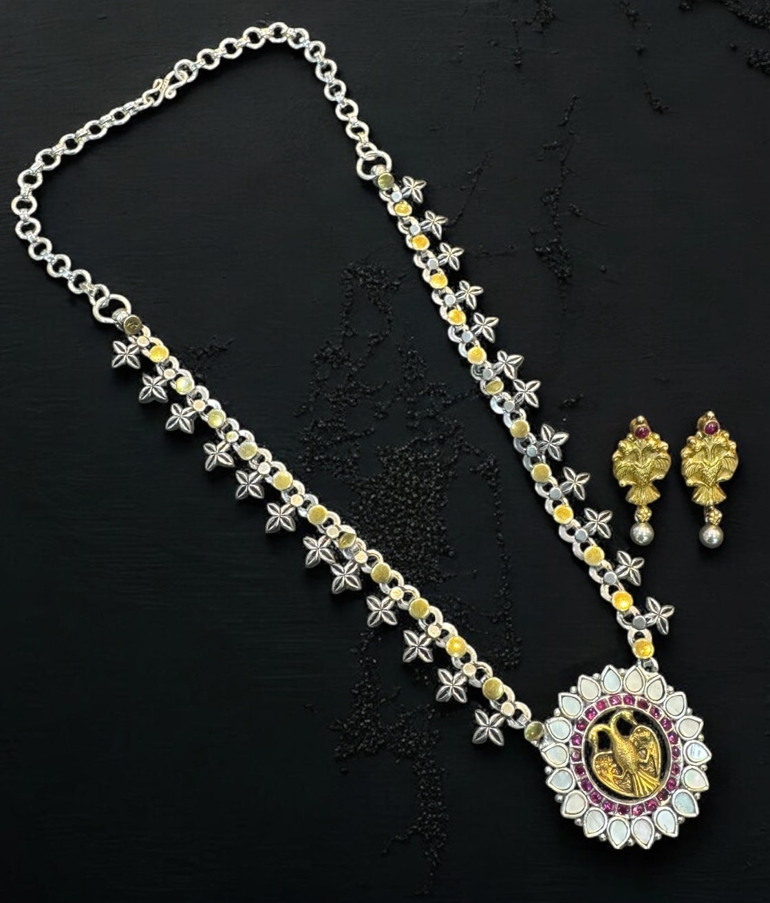 Introducing another KO Original design which revives classic heritage motifs . This Gandaberunda Necklace features a central pendant of the Gandaberunda (surrounded by beautiful mother of pearl and kemp stone)—a two-headed mythical bird from Hindu mythology, renowned for its immense magical strength and its ability to combat forces of destruction. With heads resembling the mighty eagle and a tail like the majestic peacock, the Gandaberunda symbolizes both power and resilience. The necklace is made of pure 925 silver beads in a stunning design and given the 2 tone gold/silver finish .