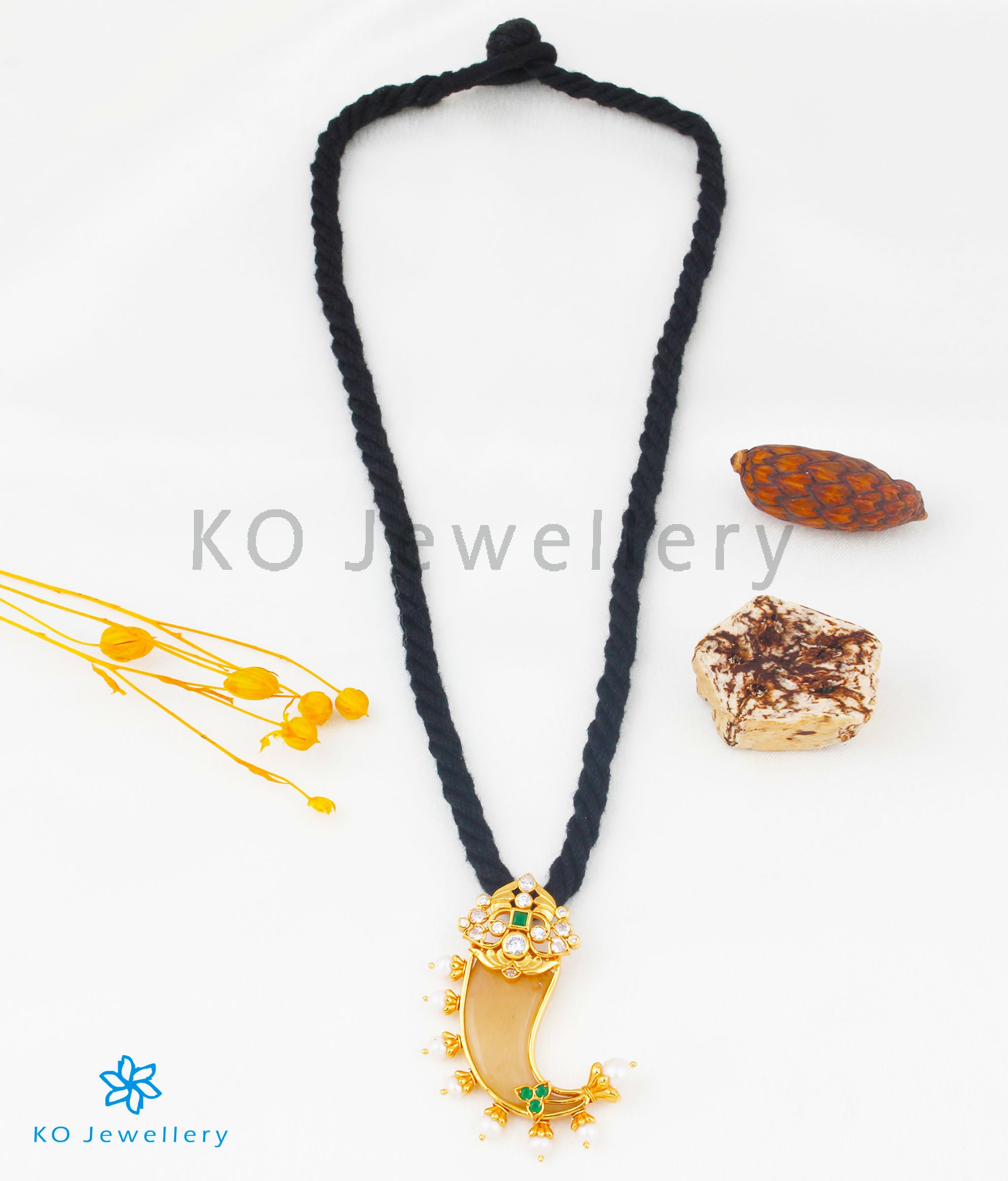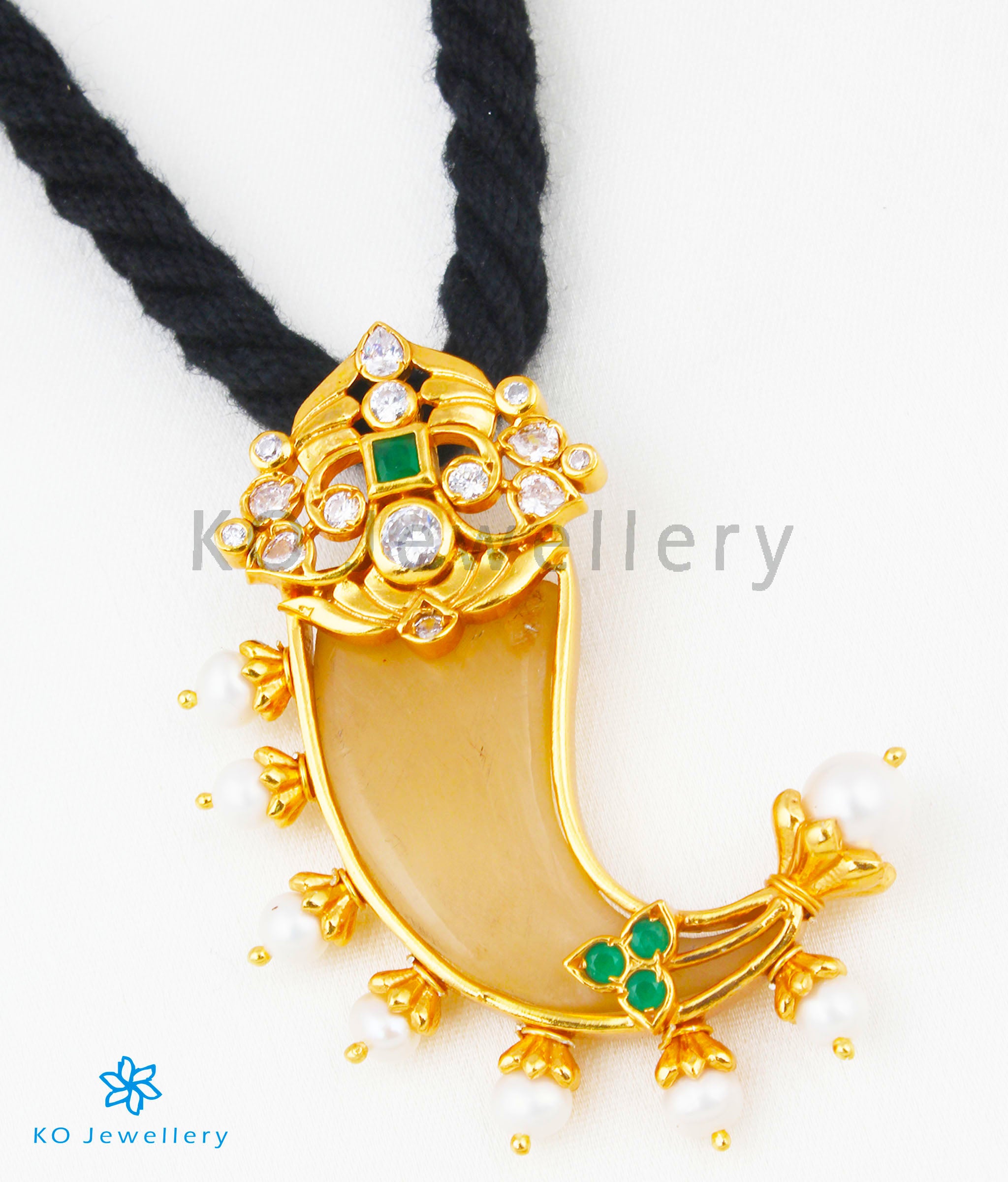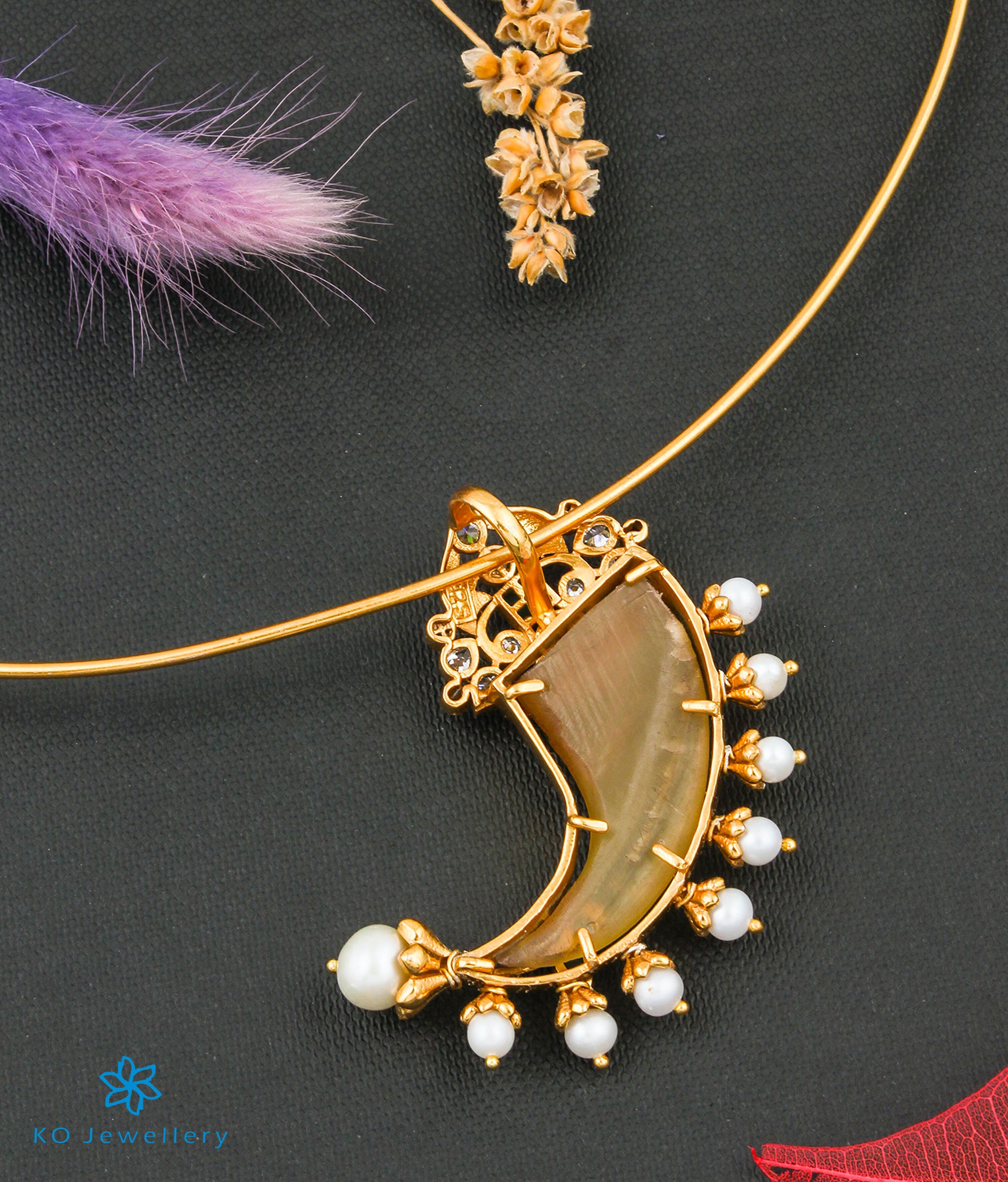 Awe everyone with this impeccable 'Tiger-claw' pendant crafted in Sterling Silver (92.5%) and gold-dipped to perfection. Traditionally worn by men as a symbol of courage the tiger-claw pendant is a classic design in traditional indian jewellery. The pendant uses faux tiger claws, and kemp stones with Pearl.