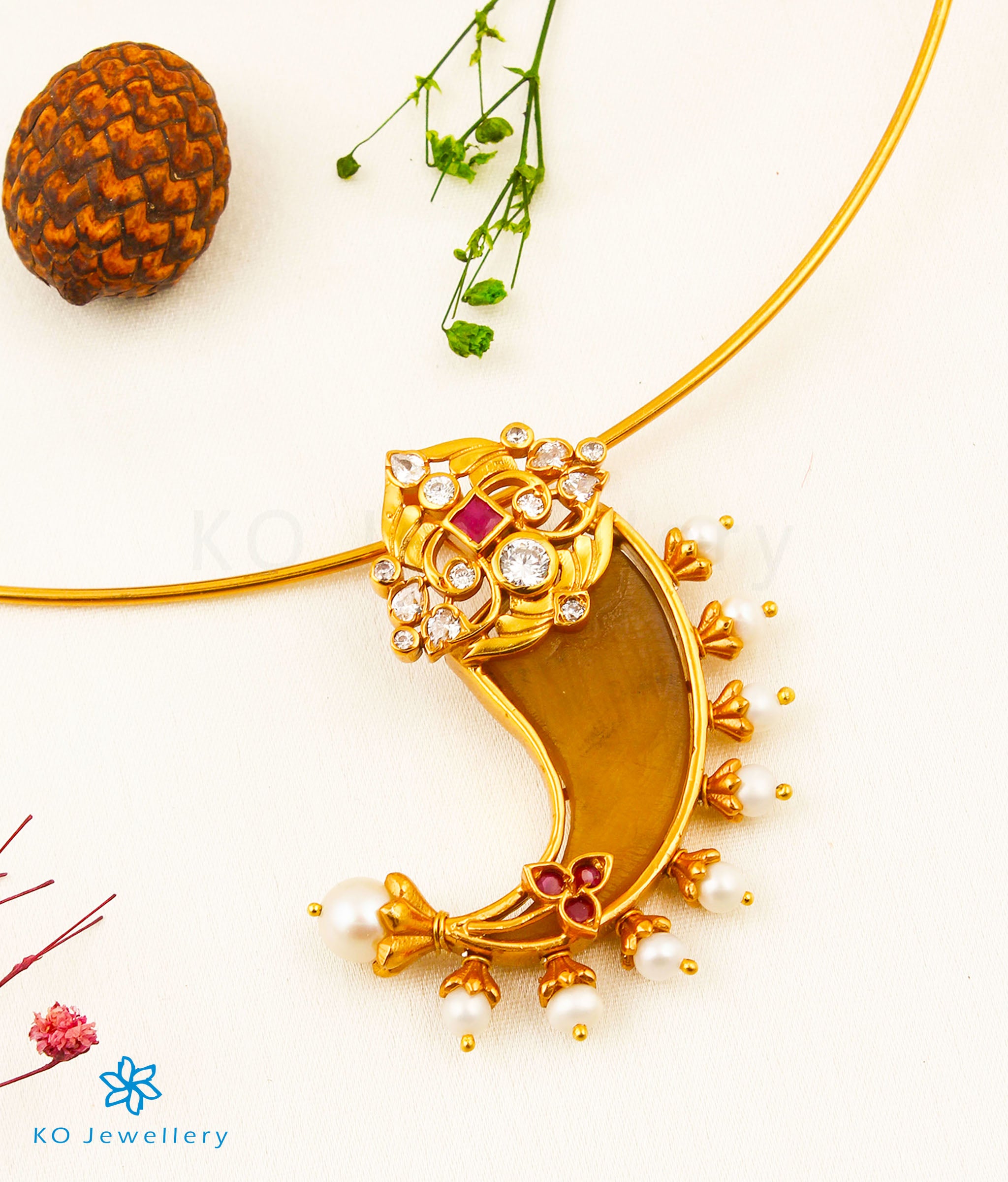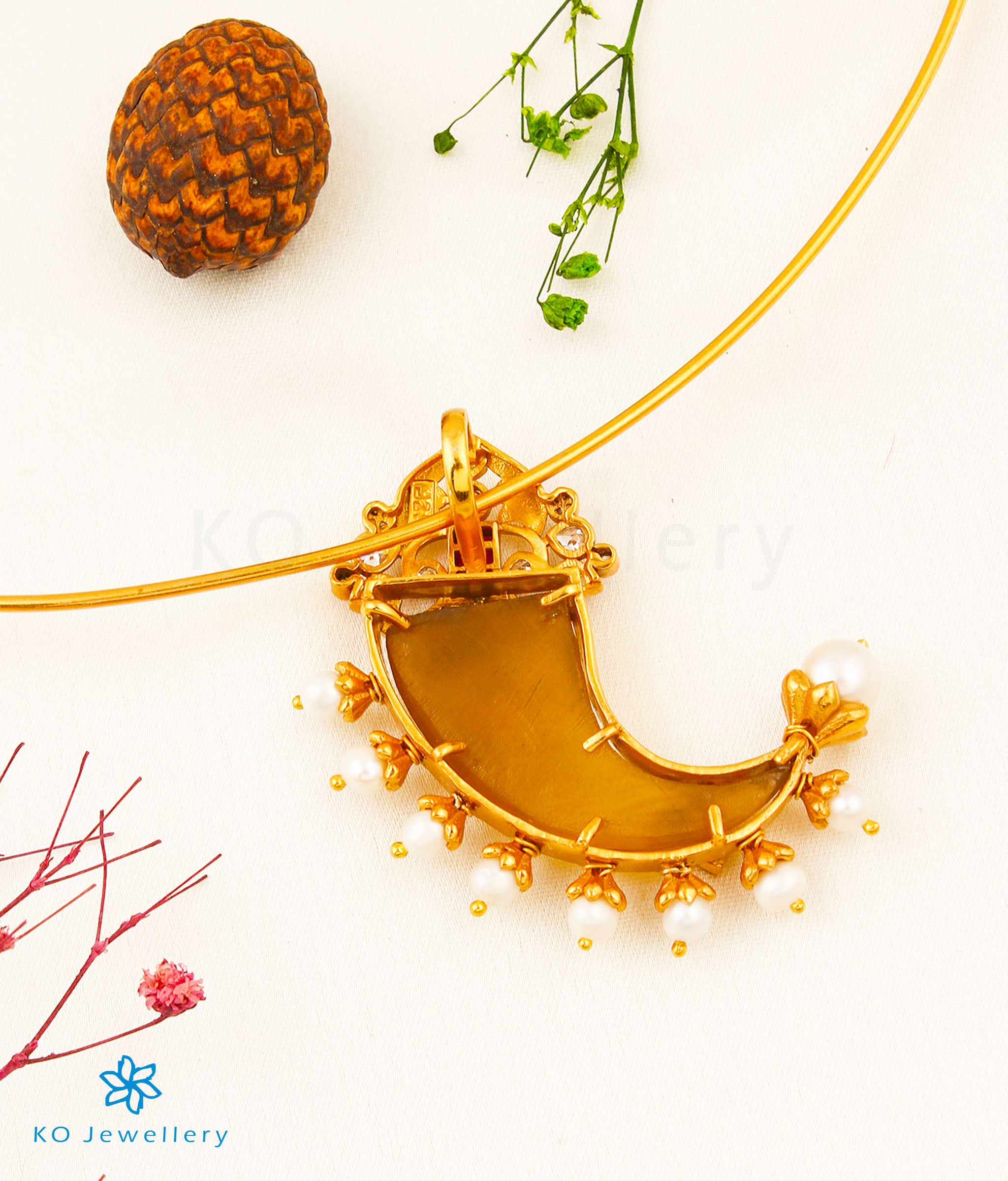 Awe everyone with this impeccable 'Tiger-claw' pendant crafted in Sterling Silver (92.5%) and gold-dipped to perfection. Traditionally worn by men as a symbol of courage the tiger-claw pendant is a classic design in traditional indian jewellery. The pendant uses faux tiger claws, and kemp stones with Pearl.