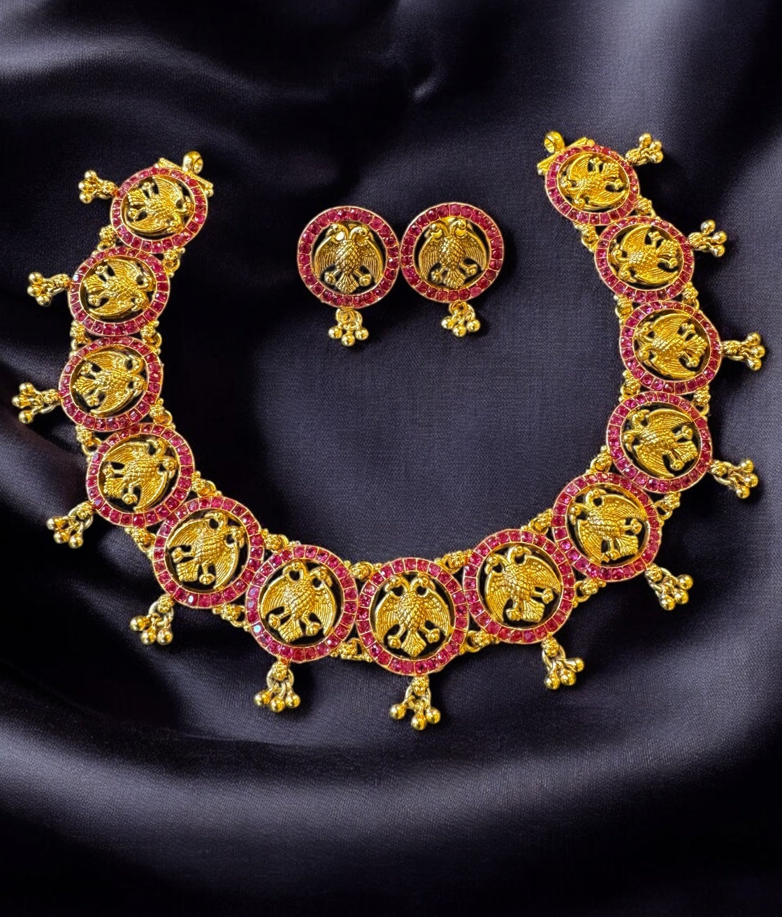 Paired with matching earrings, this stunning necklace is ideal for cultural occasions, weddings, or festivals—where tradition meets bold design. A collector’s piece that speaks of mythology, strength, and style.